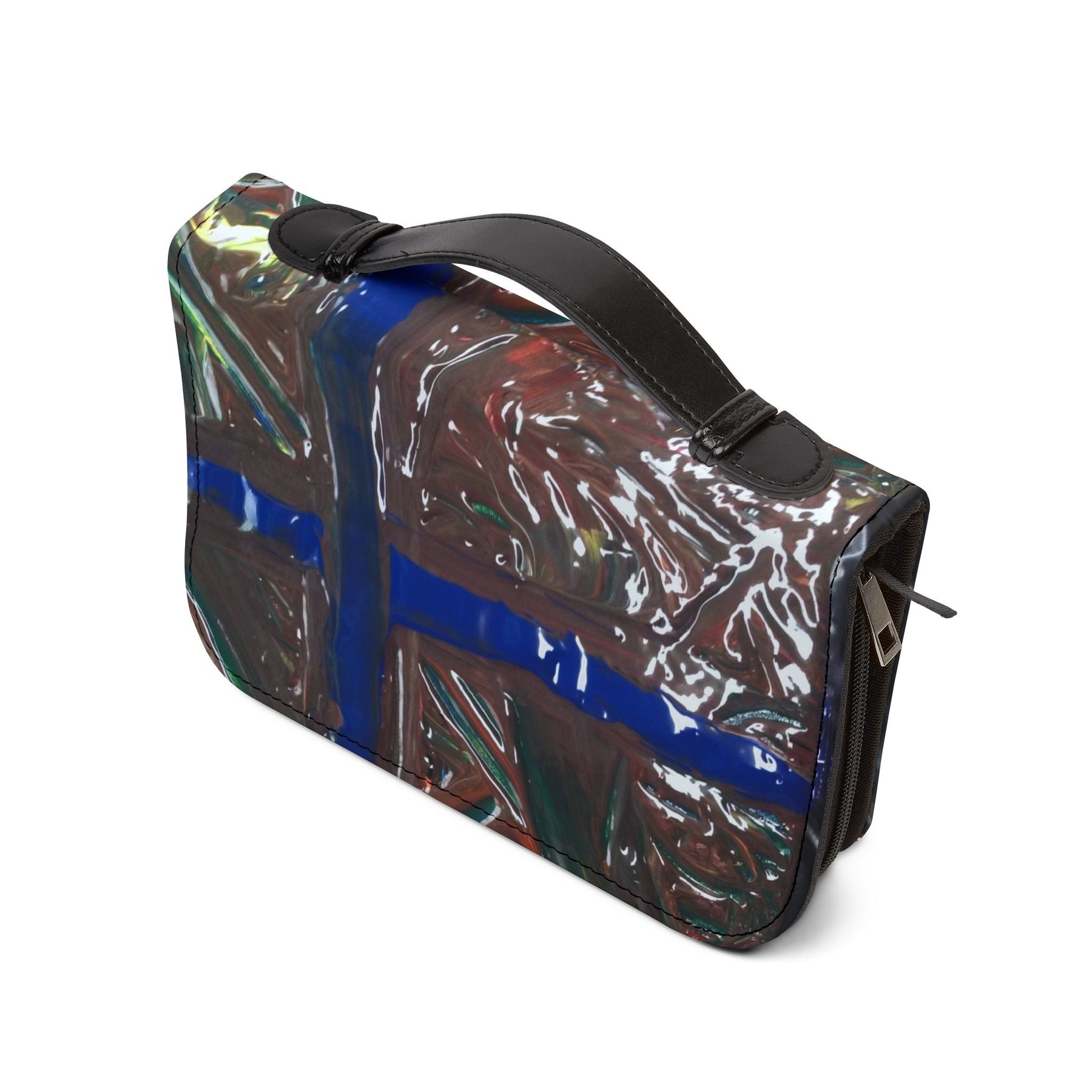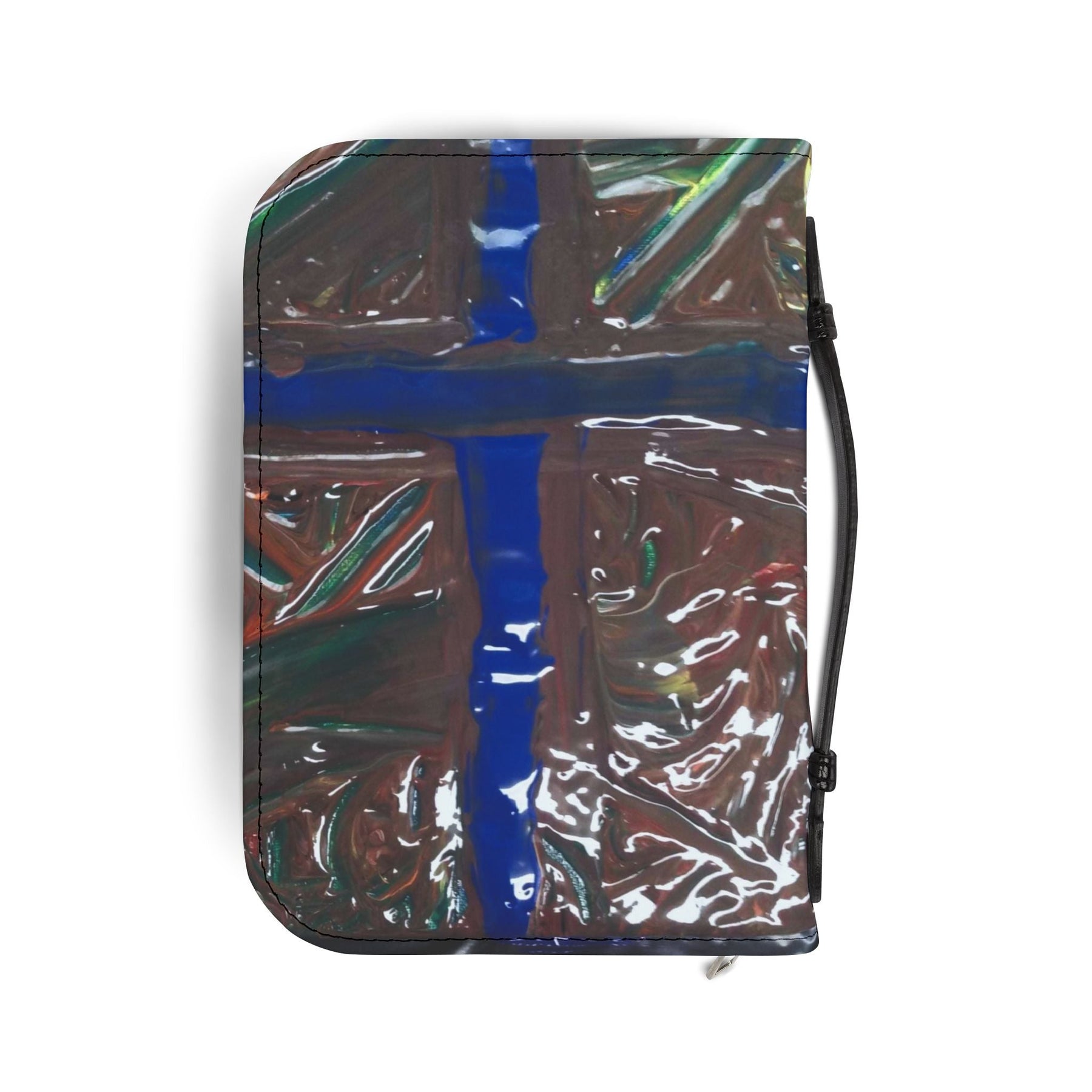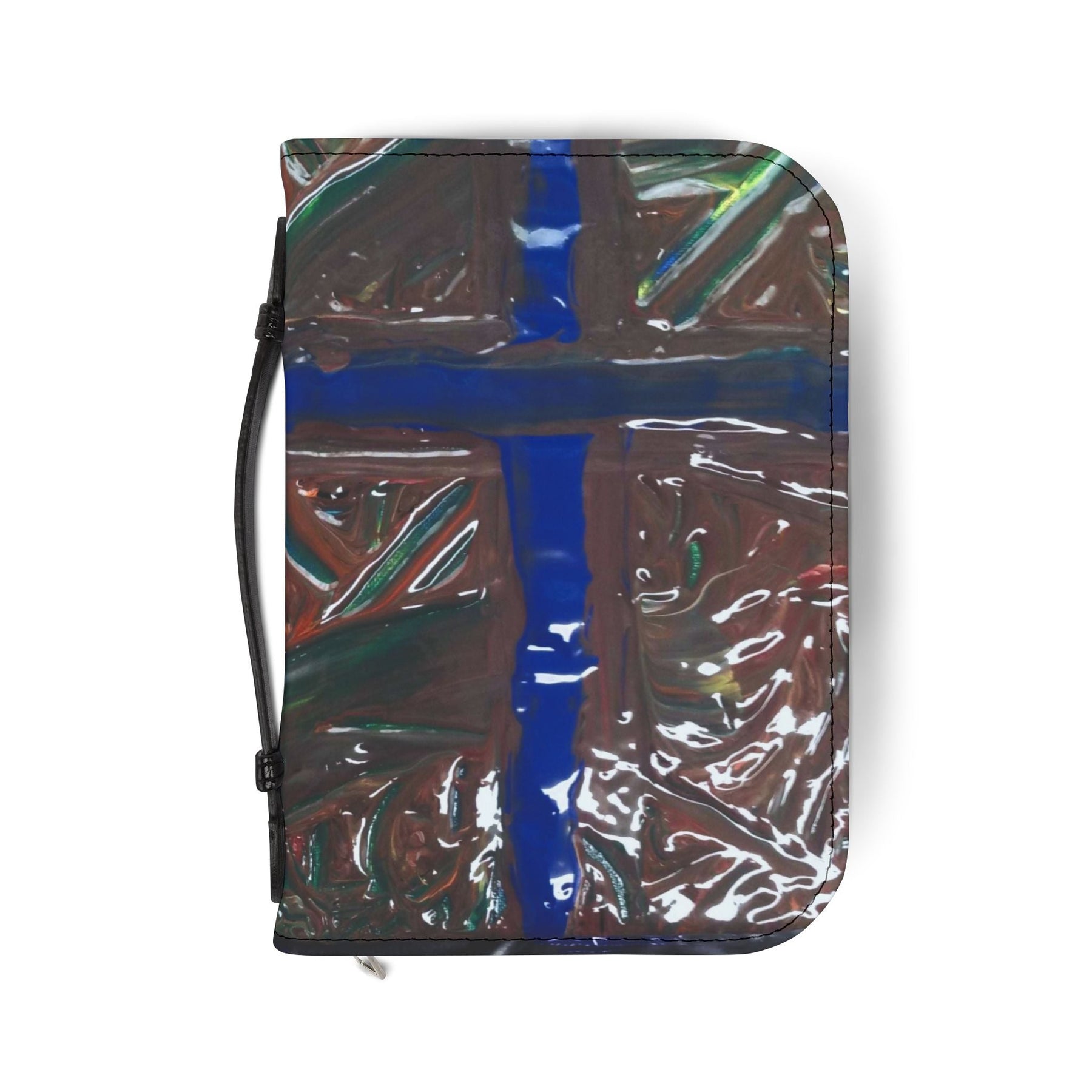 A quiet companion for daily devotion and study. This PU leather Bible cover wraps your Bible in a soft, durable shell with a thoughtful handle and organized interior. The design — a bold, painterly cross in deep blues and earthy tones — feels handcrafted and intimate, like a stained-glass window warmed by afternoon light. Slip your Bible inside, tuck a pen and notes into the pockets, and carry everything with confidence to study group, church, or a peaceful corner at home. The rich black trim and zipper give it an understated, reverent look that blends practicality with personal meaning.