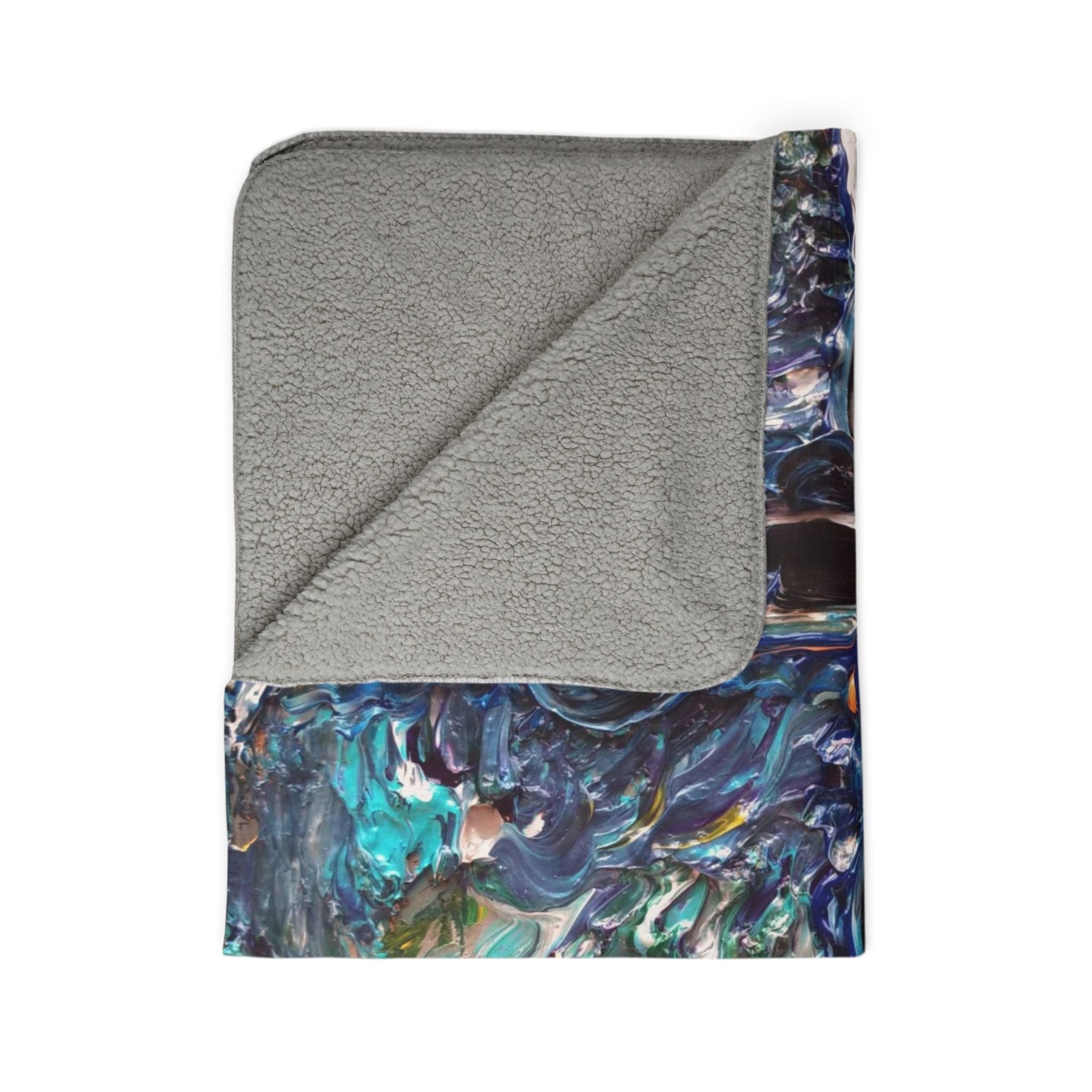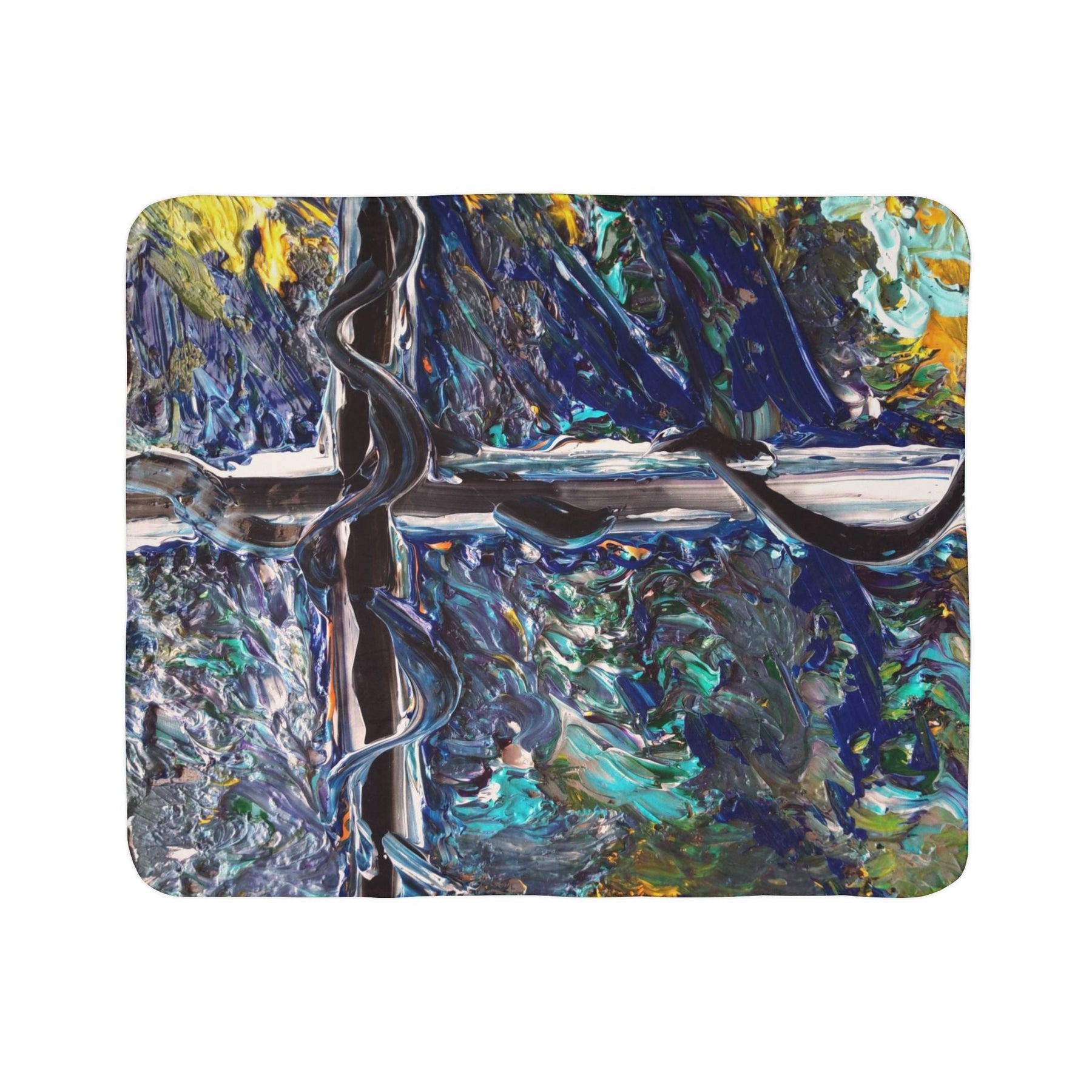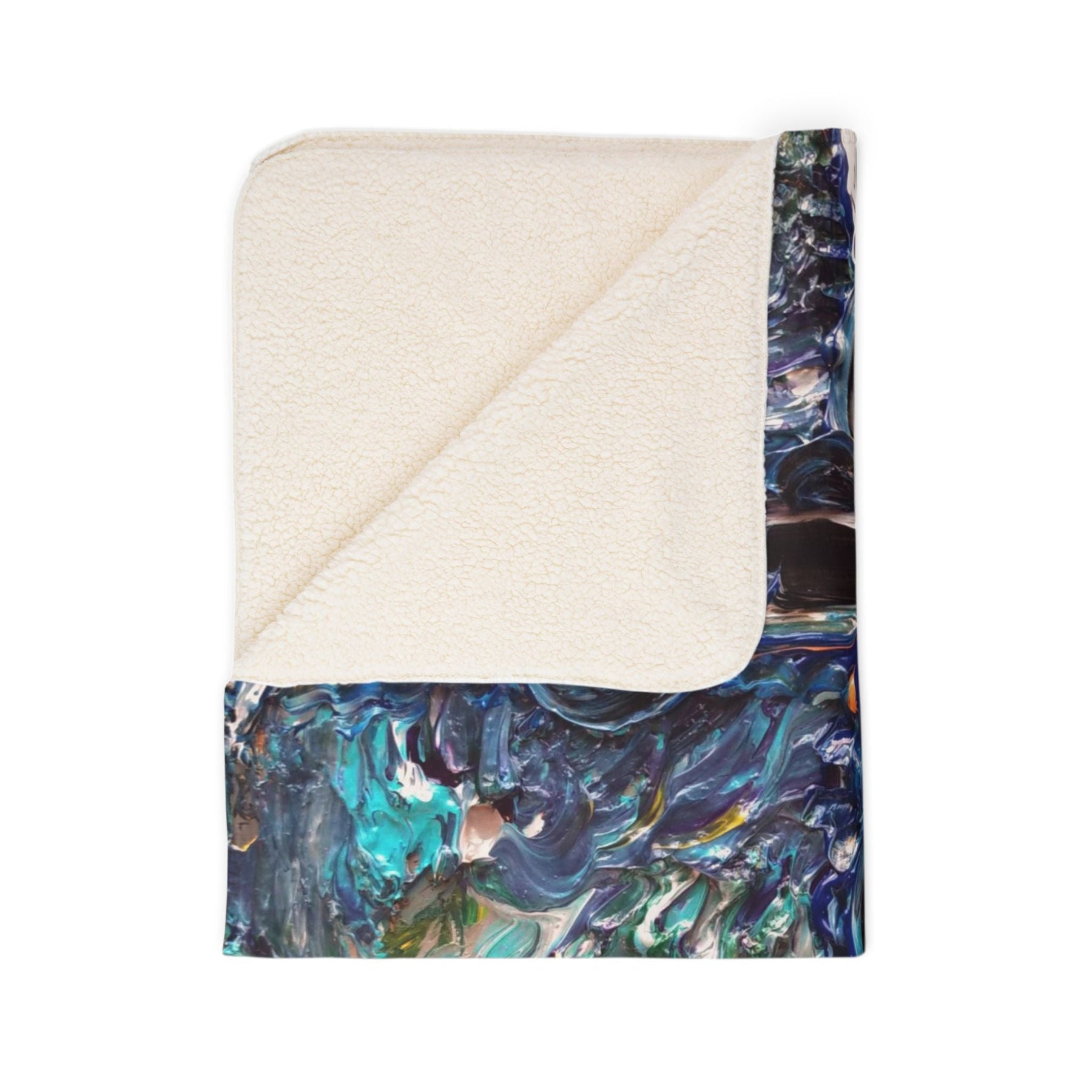 Wrap yourself in a blanket that feels like an intimate moment with color and texture. Thick, double-sided fleece cradles you while a painterly abstract print—deep blues, teals, and pops of yellow—moves like light across water. It’s the kind of throw you pull over your lap during a stormy evening, lay across the sofa to read, or drape over a favorite chair so the room seems quietly curated. The heavy, plush weight holds warmth without feeling stifling, and the vivid one-sided print keeps the artwork striking and alive. Hemmed edges and matched seam thread give a finished, lasting look that ages with the blanket rather than against it. This blanket lives where cozy nights, slow mornings, and creative spaces meet.
