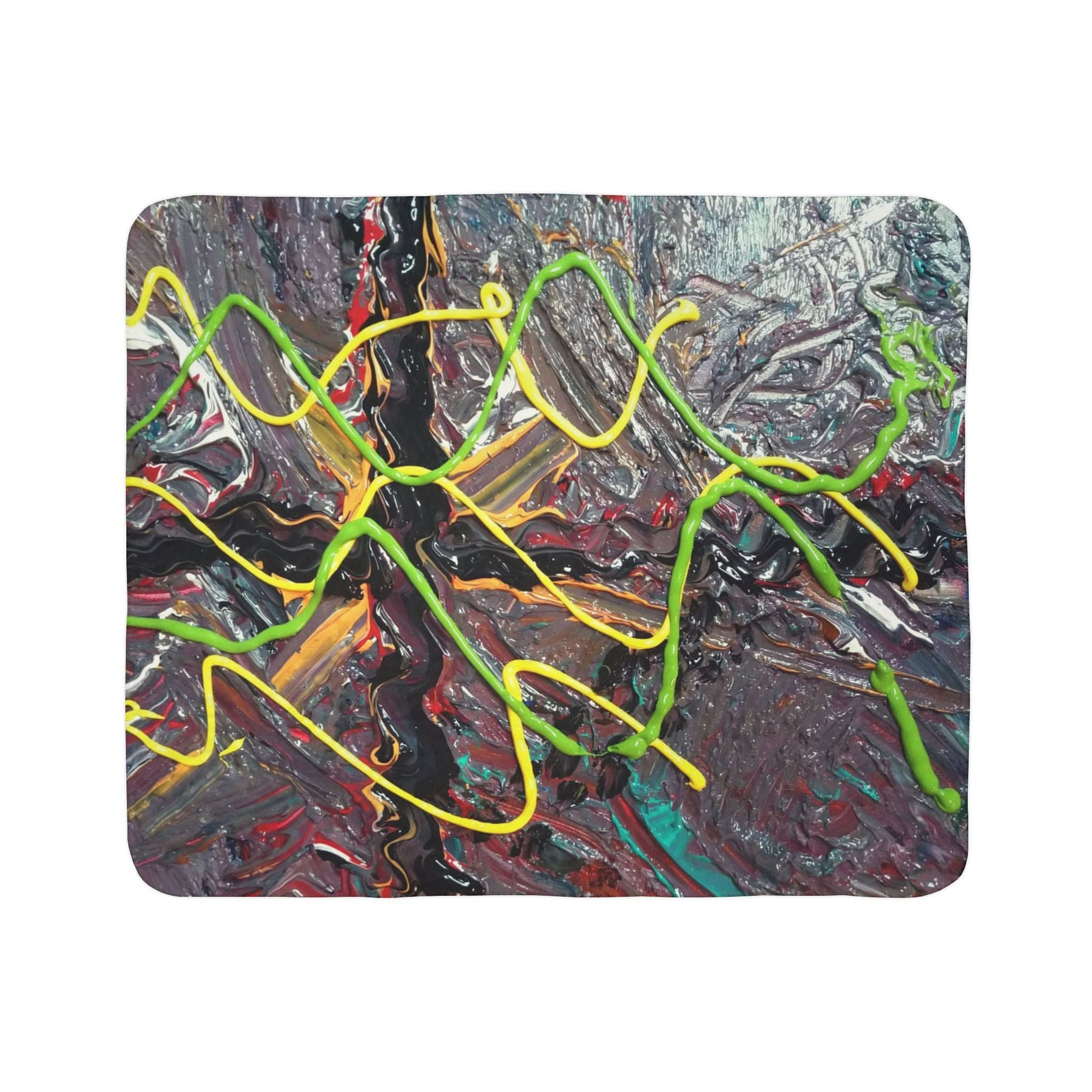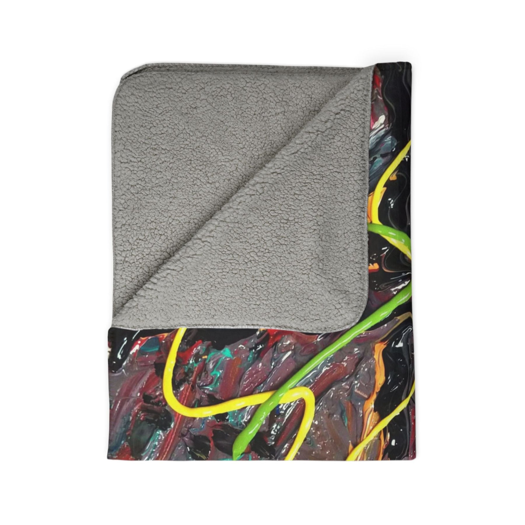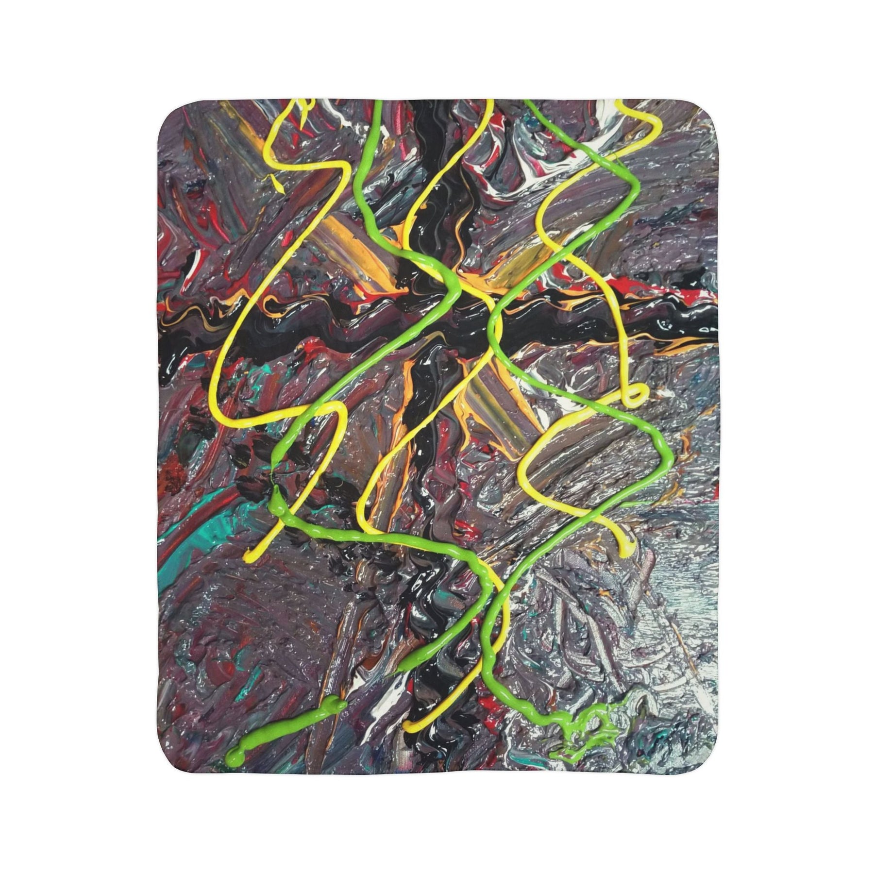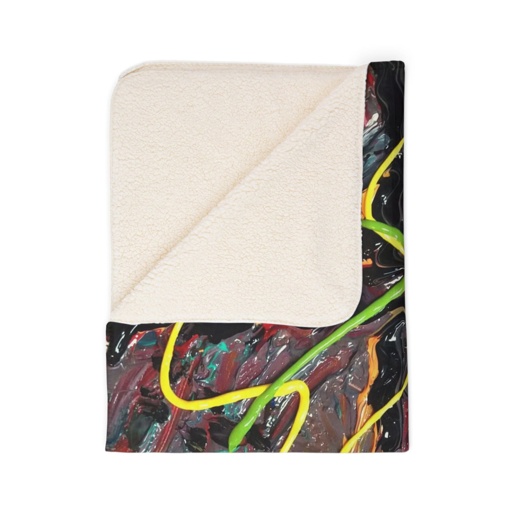 This plush sherpa blanket wraps you in rich texture and bold color. Thick polyester fleece cushions you while the soft sherpa backing keeps warmth close. The design carries energetic, painterly streaks—neon greens and yellows dancing across a moody, layered background—so the blanket reads like a small, portable canvas. Drape it over a couch for a splash of studio energy, take it to late-night creative sessions, or curl up with it during city winters when you want a touch of vivid, handcrafted feeling. It feels substantial in your hands and looks intentionally artful in a living room, studio, or reading nook.