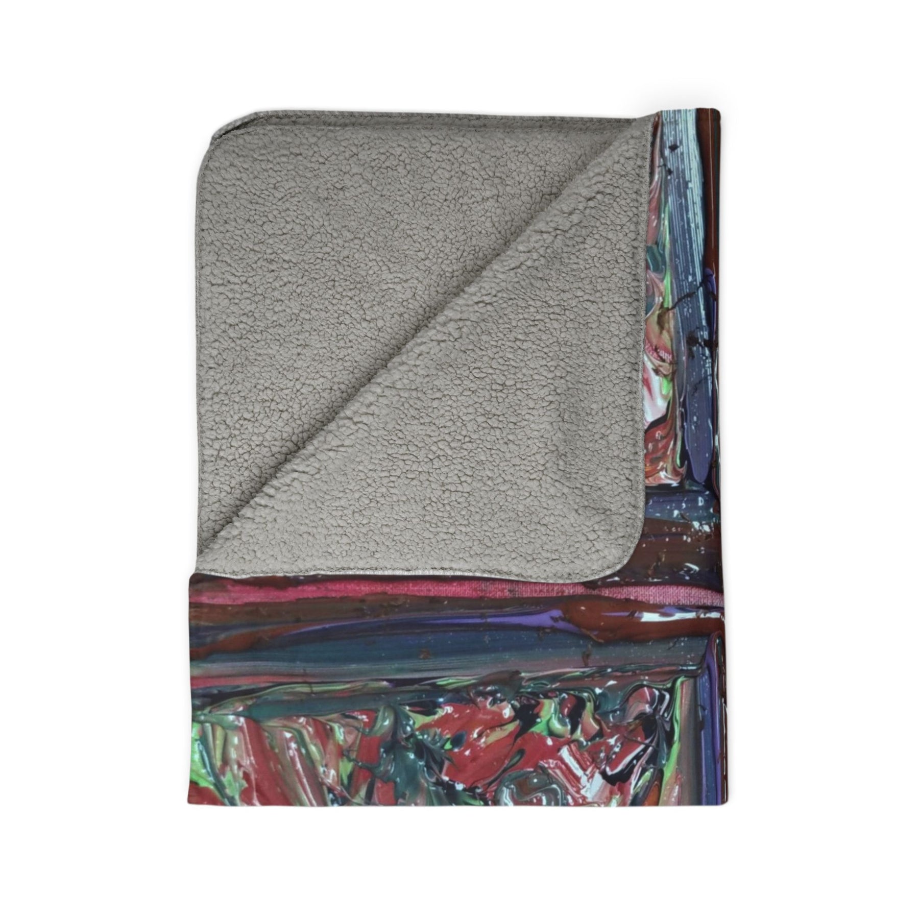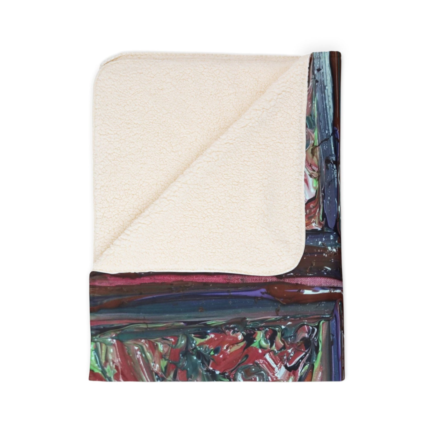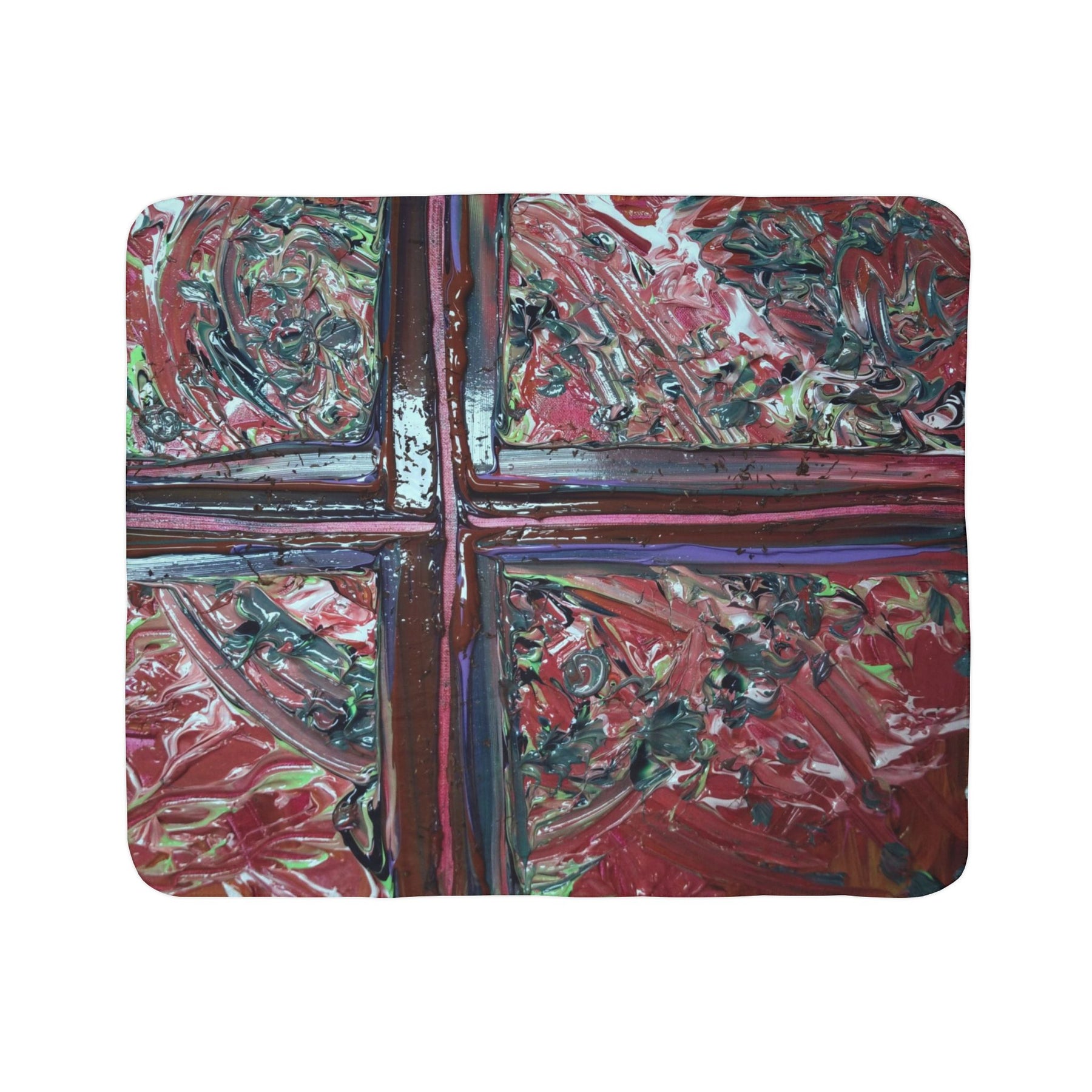 This plush sherpa blanket brings painterly warmth into quiet moments. Thick, double-sided fleece wraps you in a tactile, cloud-like hug while an expressive, hand-painted cross motif stretches across the surface in layered reds, purples, and muted greens. The sewn hem and matched seam thread give a finished, artisanal feel—the kind of blanket you pull over your knees during late-night reading, drape across a favorite chair, or bring to a small, reflective gathering. The bold brushstrokes and textured swirls read like abstract stained glass from across the room, adding color and depth without shouting. It’s a cozy companion for someone who loves tactile comfort and visual art in everyday life.