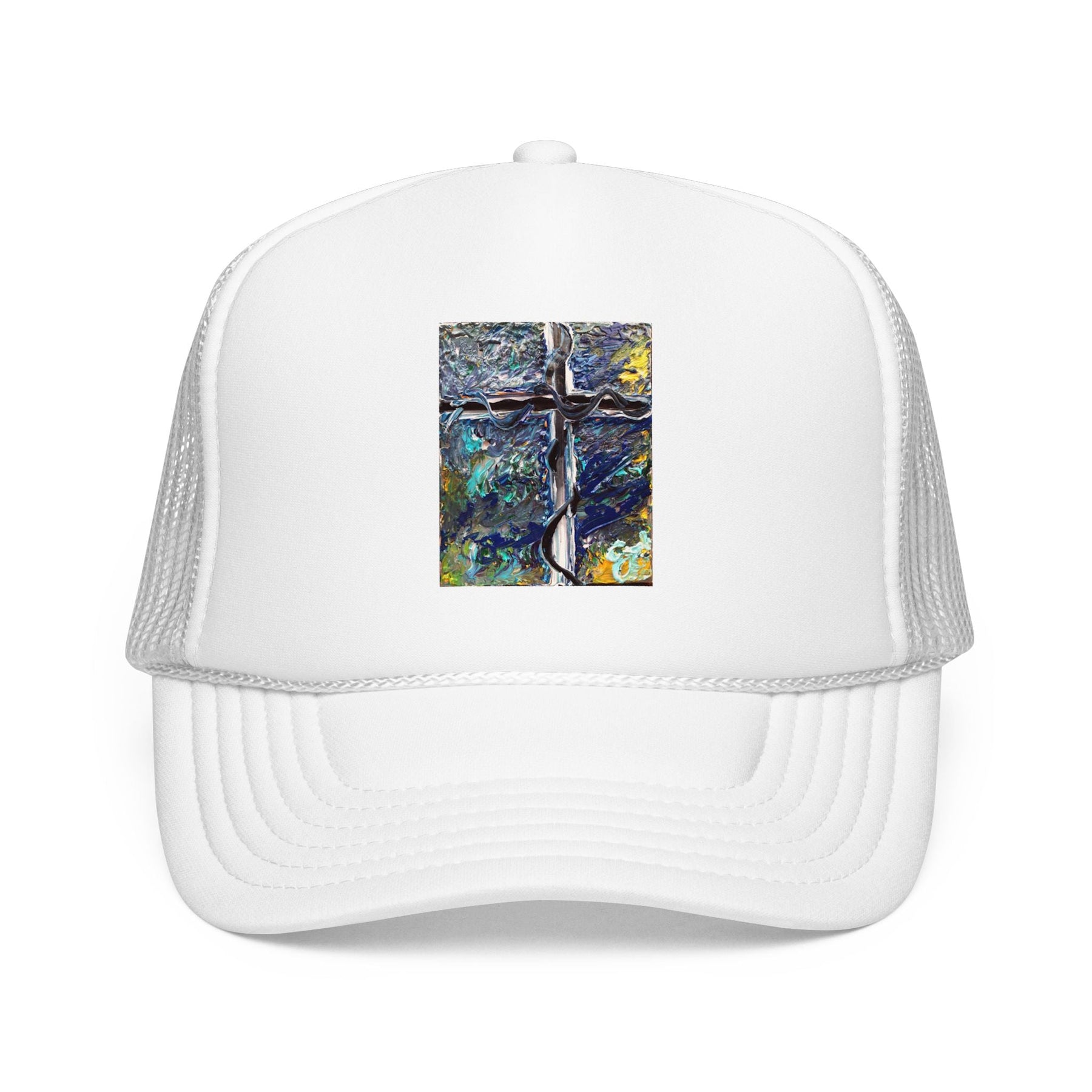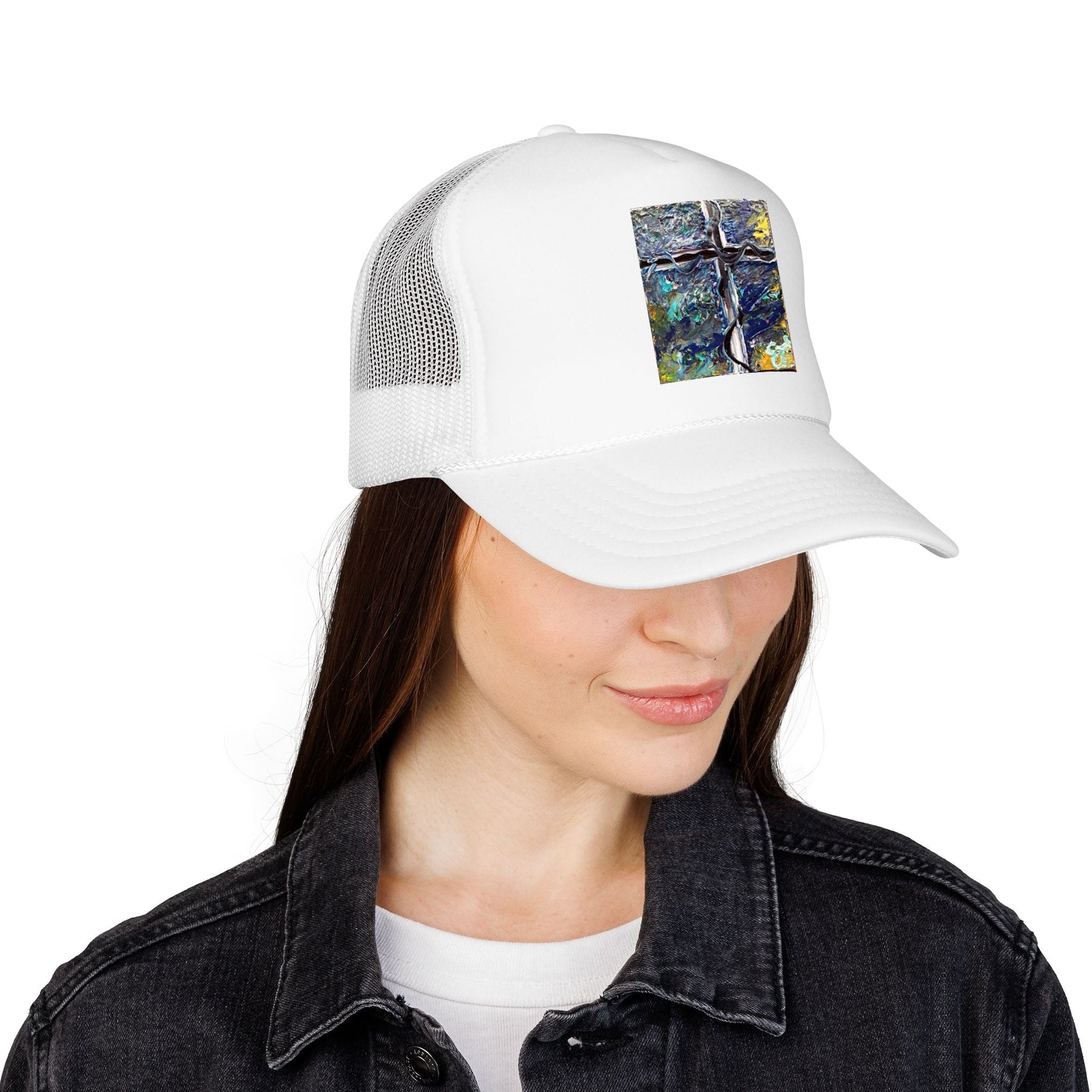 A structured foam trucker hat with a small, expressive abstract artwork front and airy mesh back. The high-profile, five-panel silhouette gives the piece presence while the seamless foam front keeps the art crisp and slightly raised, letting textured brushstrokes read clearly from a distance. Wear it on bright mornings or slow sunsets — it settles into the rhythm of hands-on days, studio drives, and city walks. The adjustable snapback and matching braid detail keep the fit classic and casual. This hat speaks quietly: an artful accent that layers texture and color over everyday outfits, for people who collect tactile moments and like their accessories with a little story.