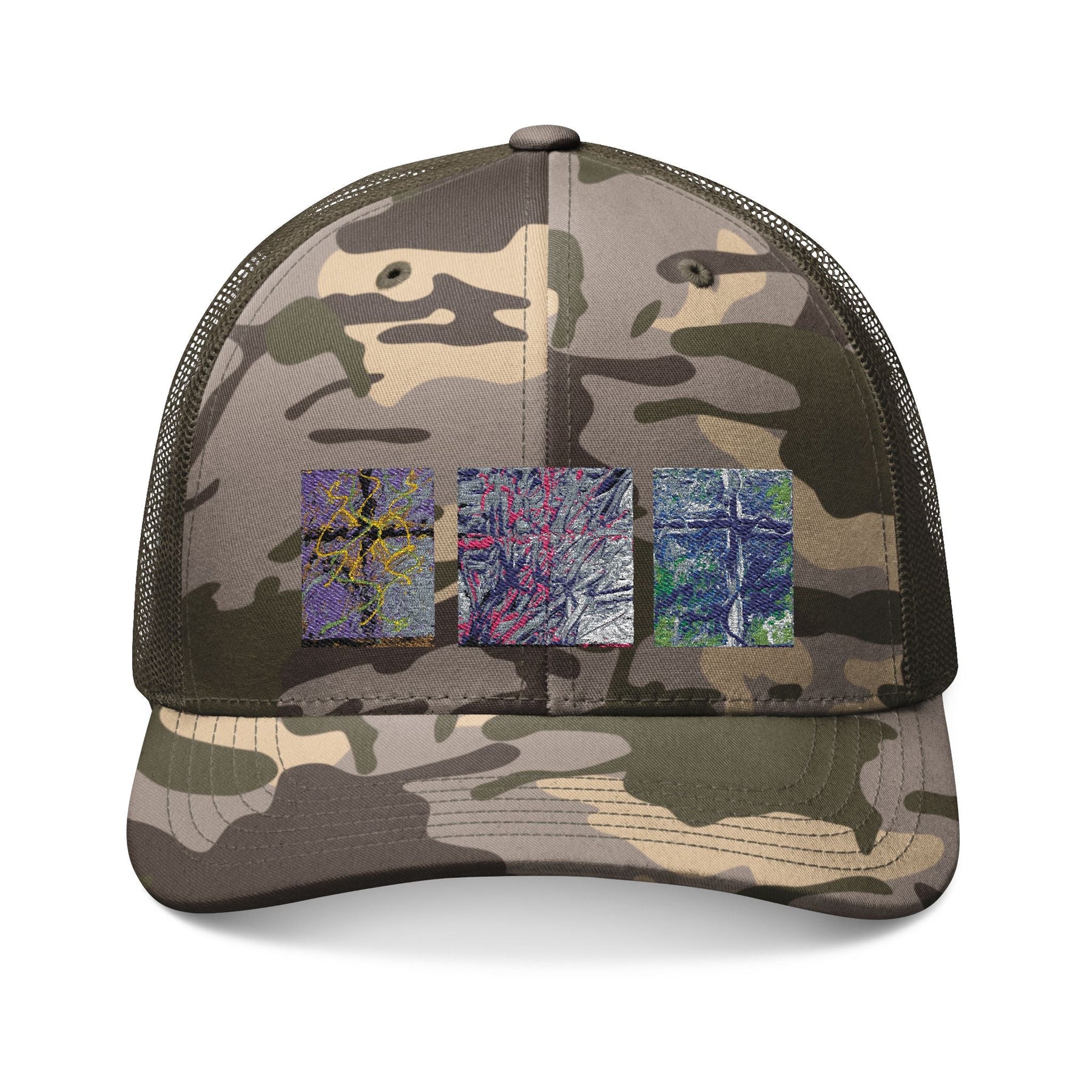 Camouflage Trucker Hat with Abstract Embroidered Squares - Camo Mesh Cap Printify