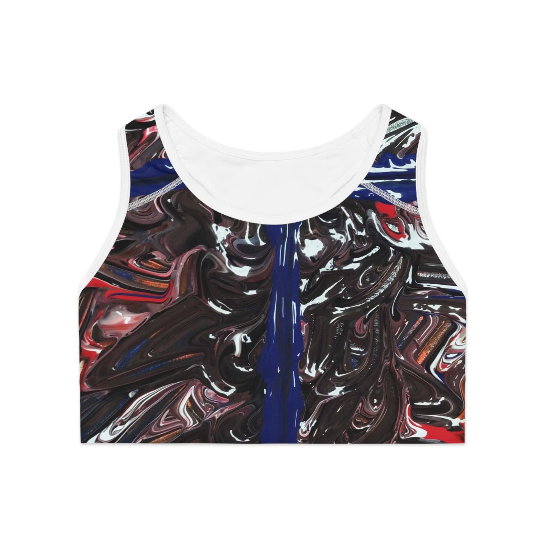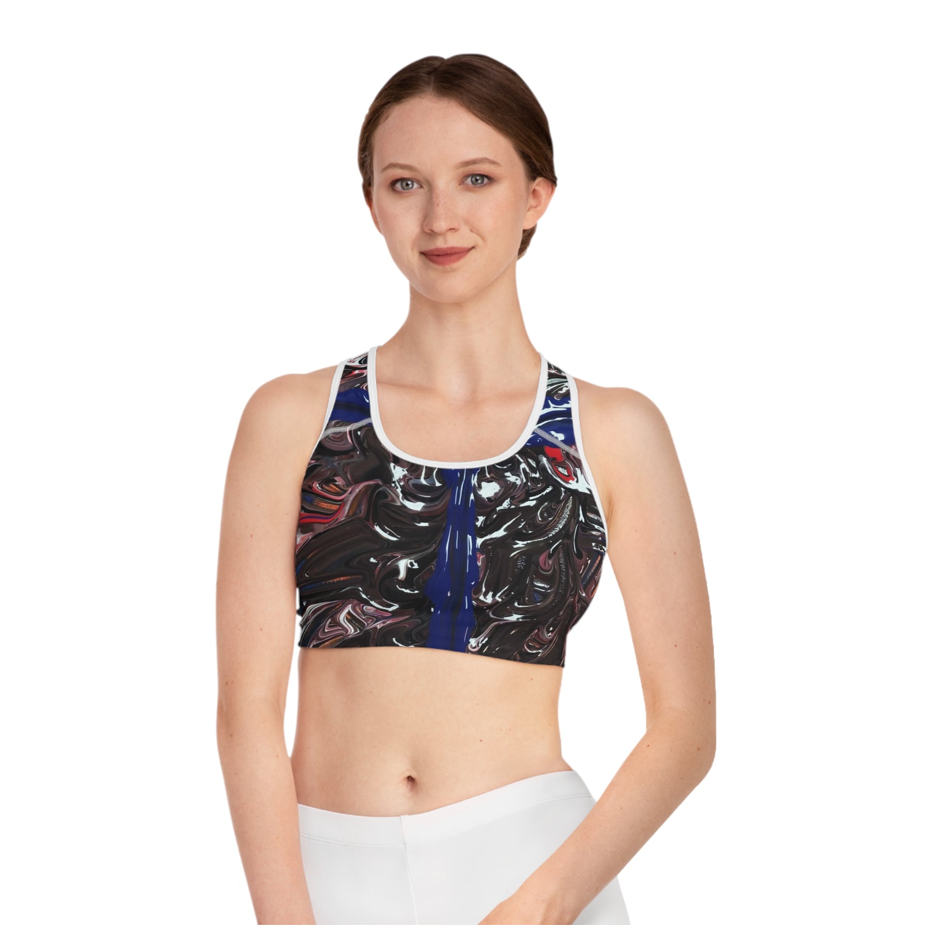 This compression sports bra brings movement and attitude together. The all-over abstract print—swirling blacks, deep blues, and pops of red—reads like a high-energy painting in motion. Built from moisture-wicking polyester with a touch of spandex, it stays cool and moves with you during sprints, studio classes, or strength sessions. The double-layer front, reinforced shoulder straps, and wide elastic band deliver steady support without feeling bulky. It’s the kind of workout piece that looks like art but performs like gear you can rely on when you push harder.