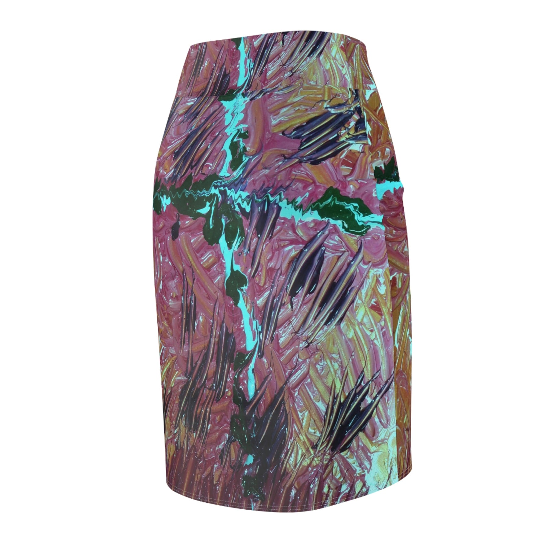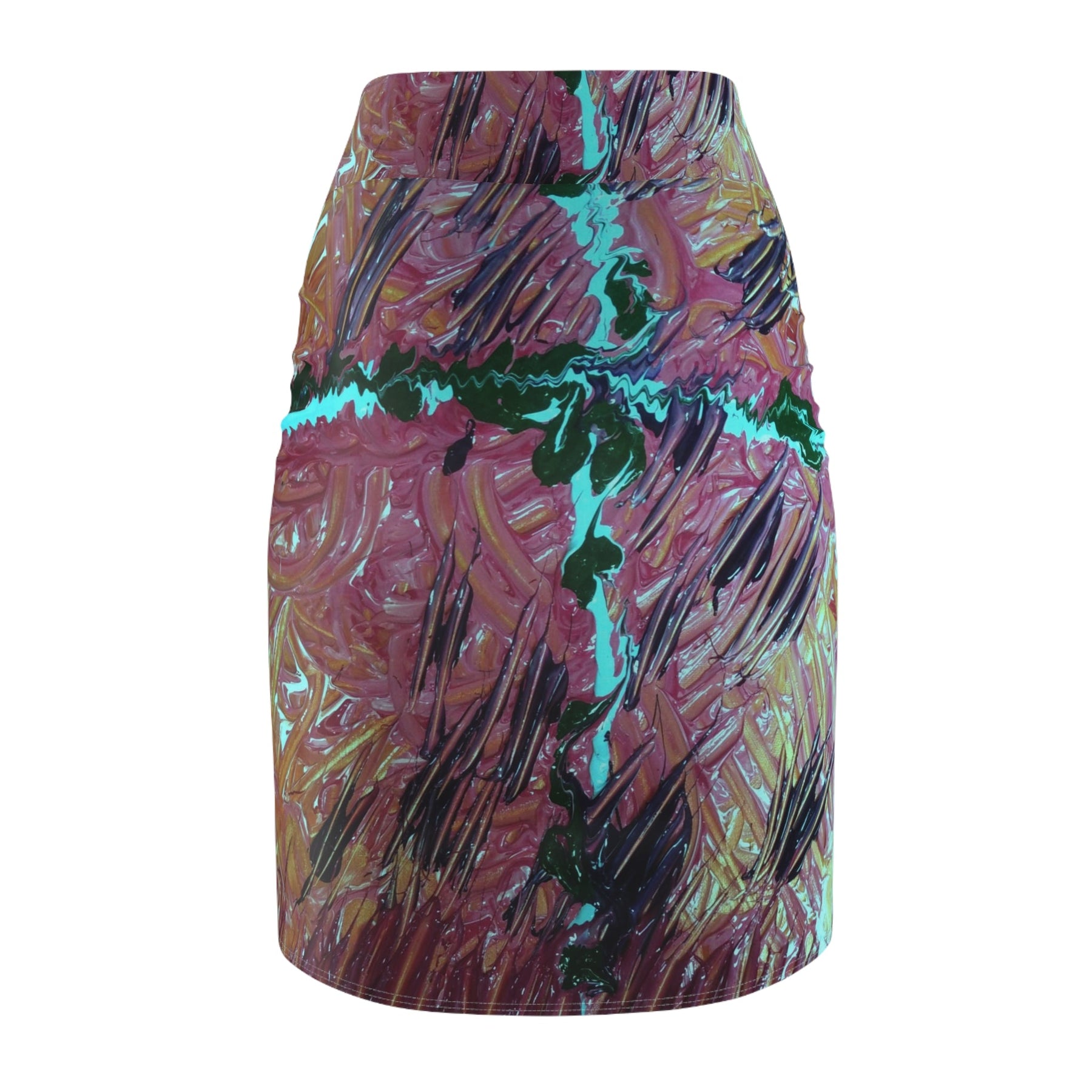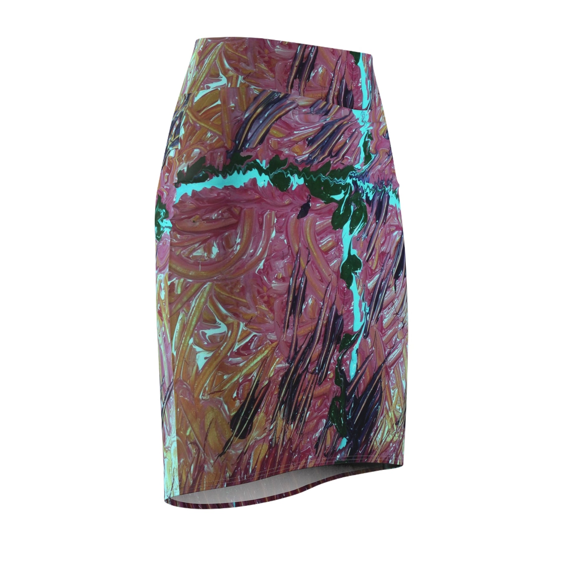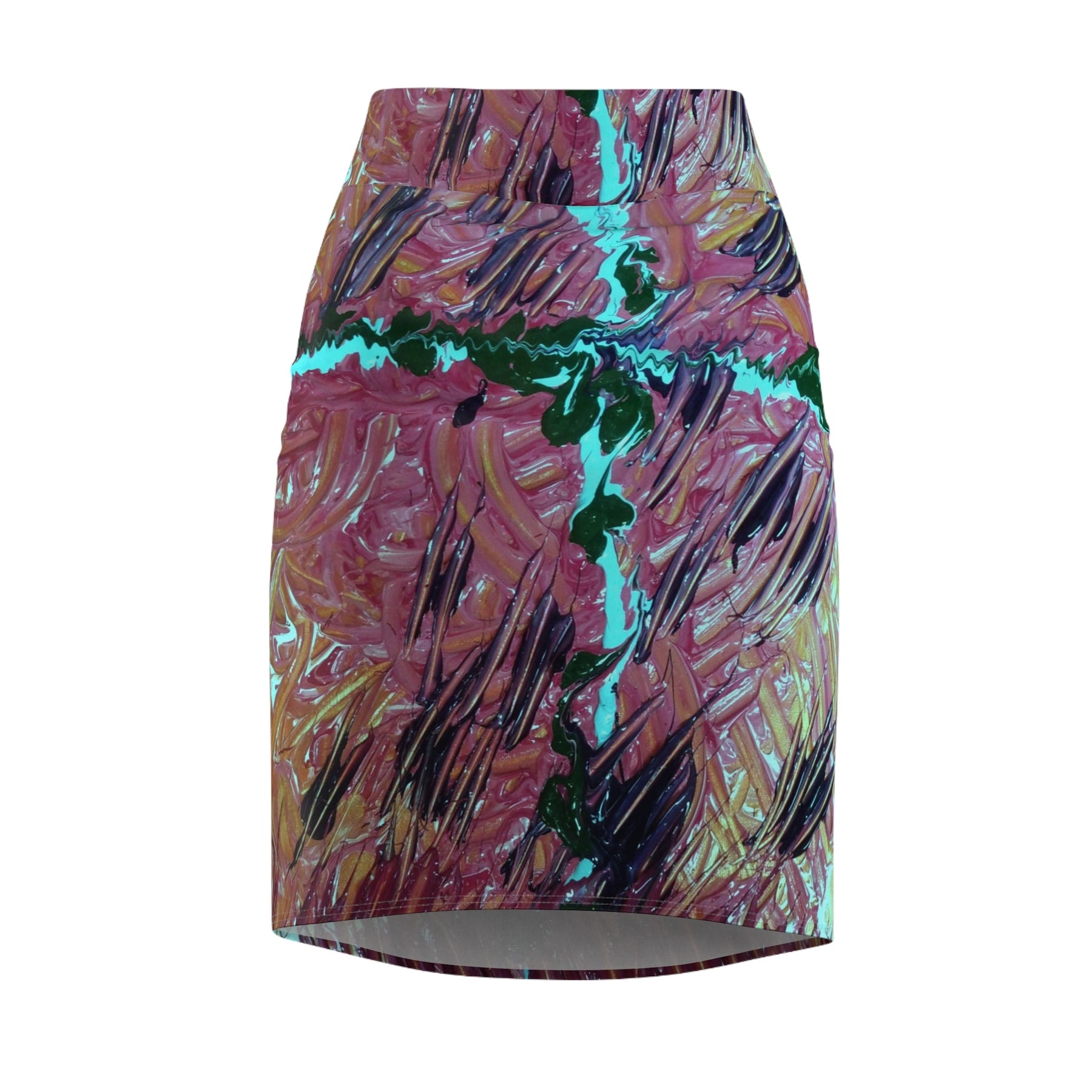 This knee-length pencil skirt carries a painterly, abstract print that reads like a close-up of layered brushstrokes — warm terracotta and rose tones braided with deep greens and bright turquoise accents. The mid-rise silhouette sits smoothly at the waist, hugging curves while allowing movement thanks to four-way stretch. Imagine slipping it on for a studio visit, a gallery evening, or a city stroll: it feels both artful and wearable, a quietly bold piece that sparks conversation without shouting. The full-wrap print keeps the design continuous and dynamic from every angle, and flatlock seams give a clean, low-profile finish against the skin.