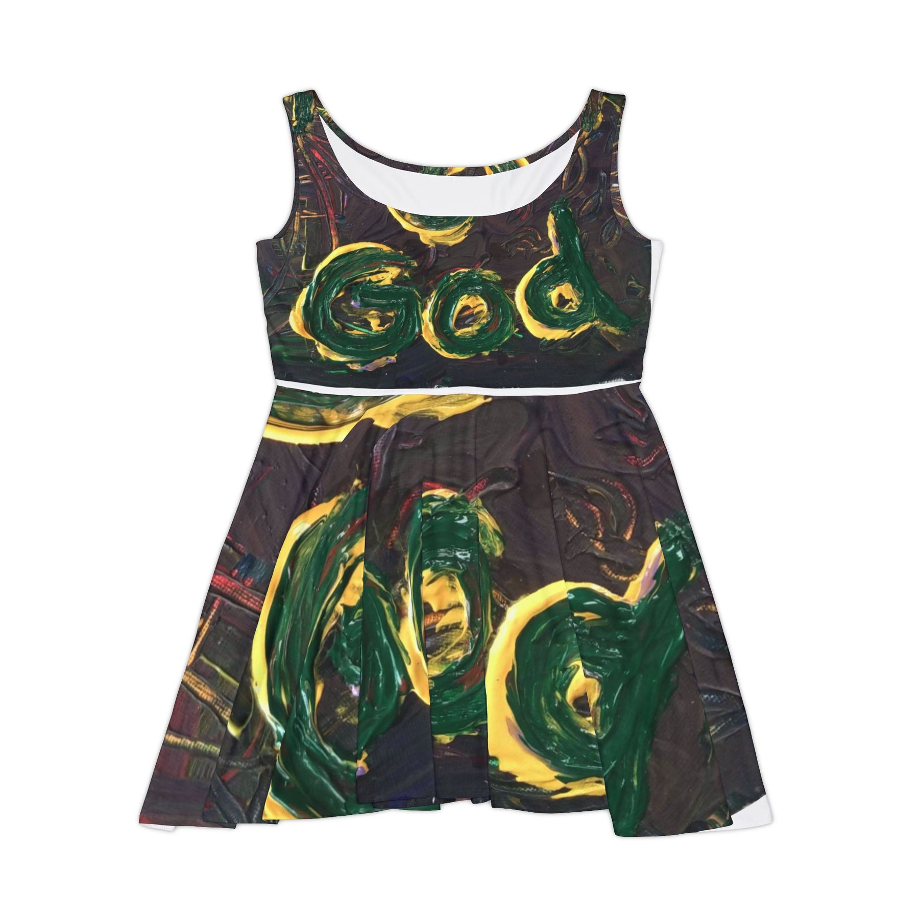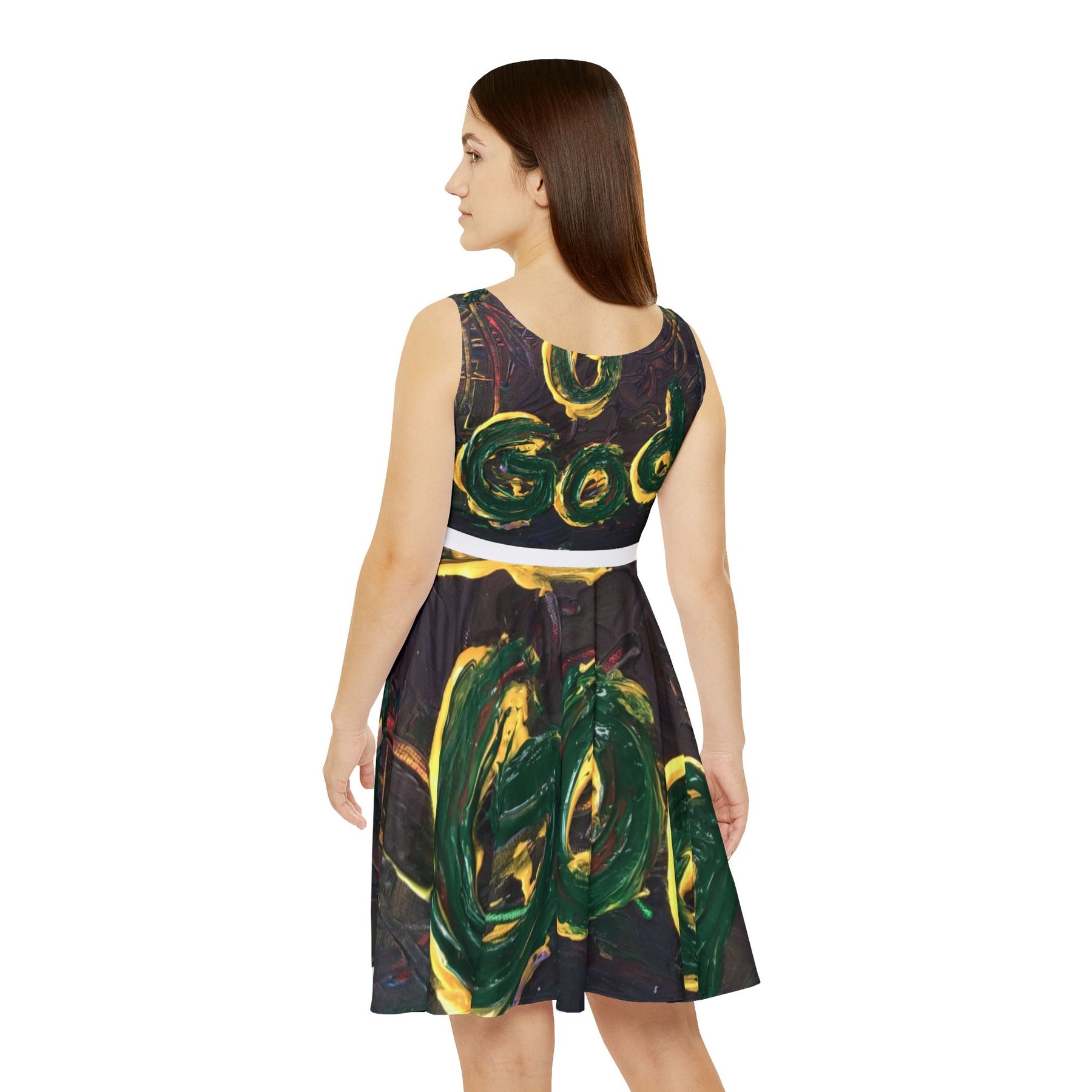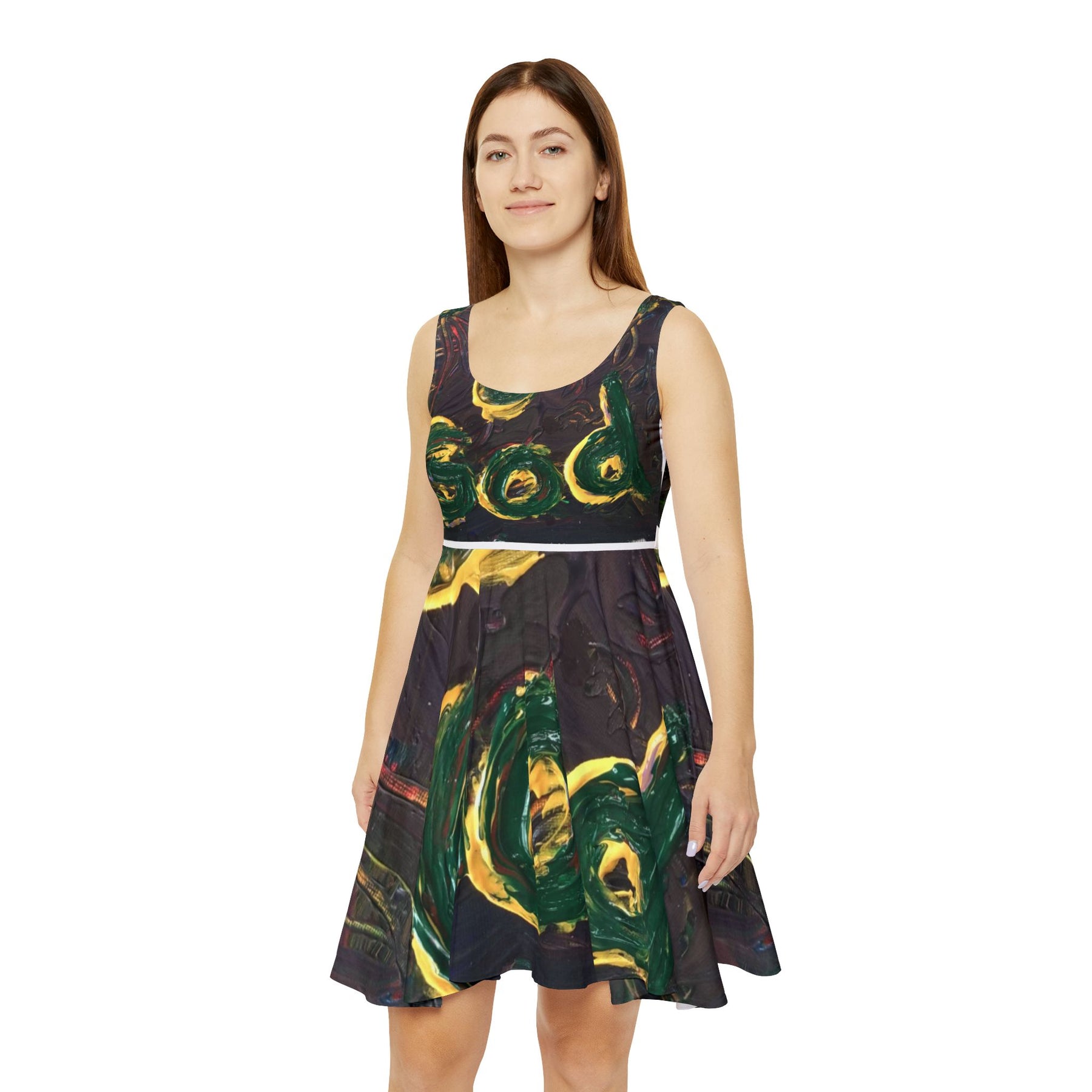 This mid-length skater dress carries an artful, hand-painted energy—deep greens and golds swirling across a moody, textured background. The fitted bodice and high-cut scoop neckline frame the shoulders while the flared, asymmetrical skirt moves with a free, expressive rhythm. It feels like wearing a brushstroke: bold, tactile, and unexpected. Lightweight but substantial, the fabric holds vibrant color and a flattering shape, so the dress works for creative nights out, gallery strolls, or slow afternoons in a sunlit café. It dresses the wearer in confidence without shouting, blending wearable comfort with an artist’s touch.
