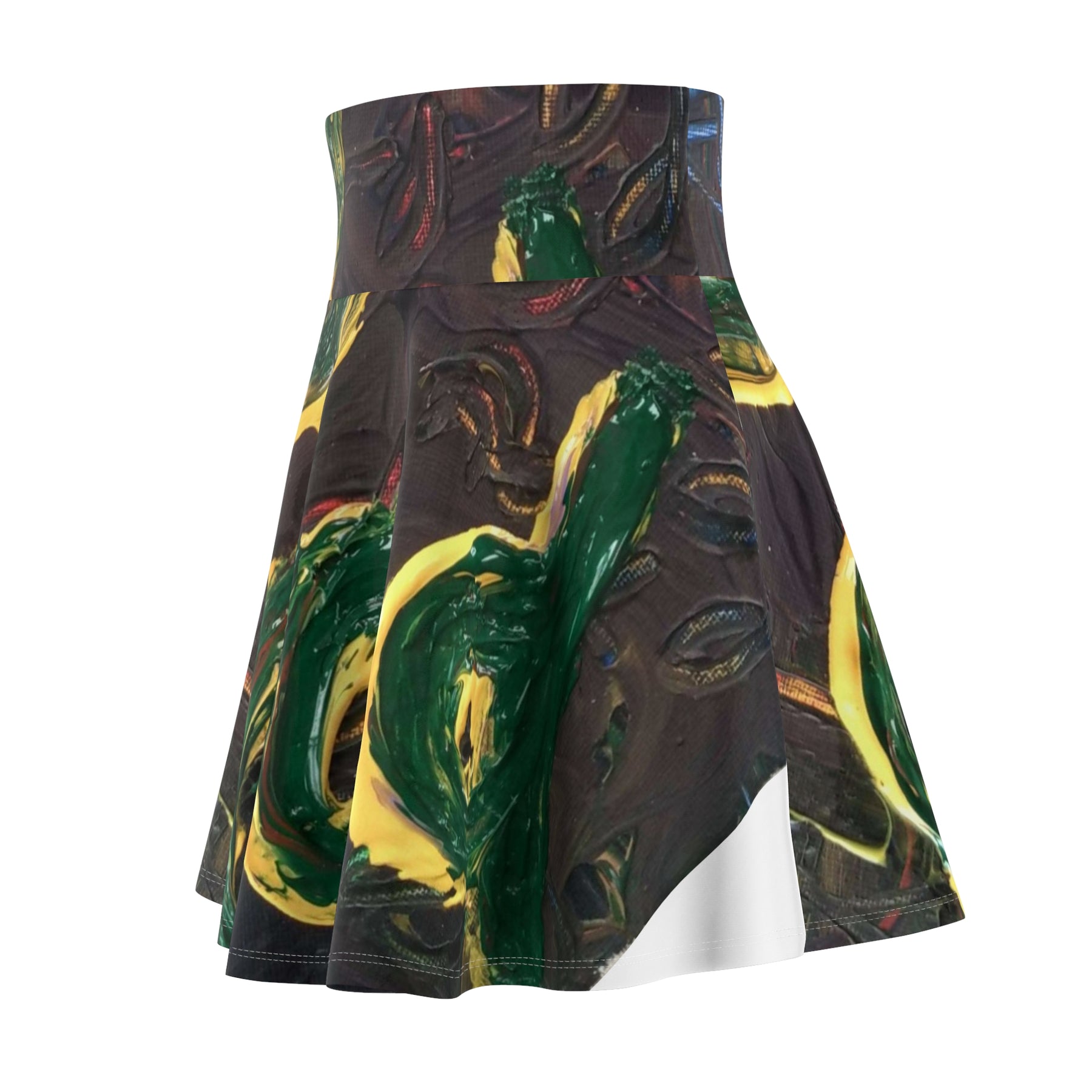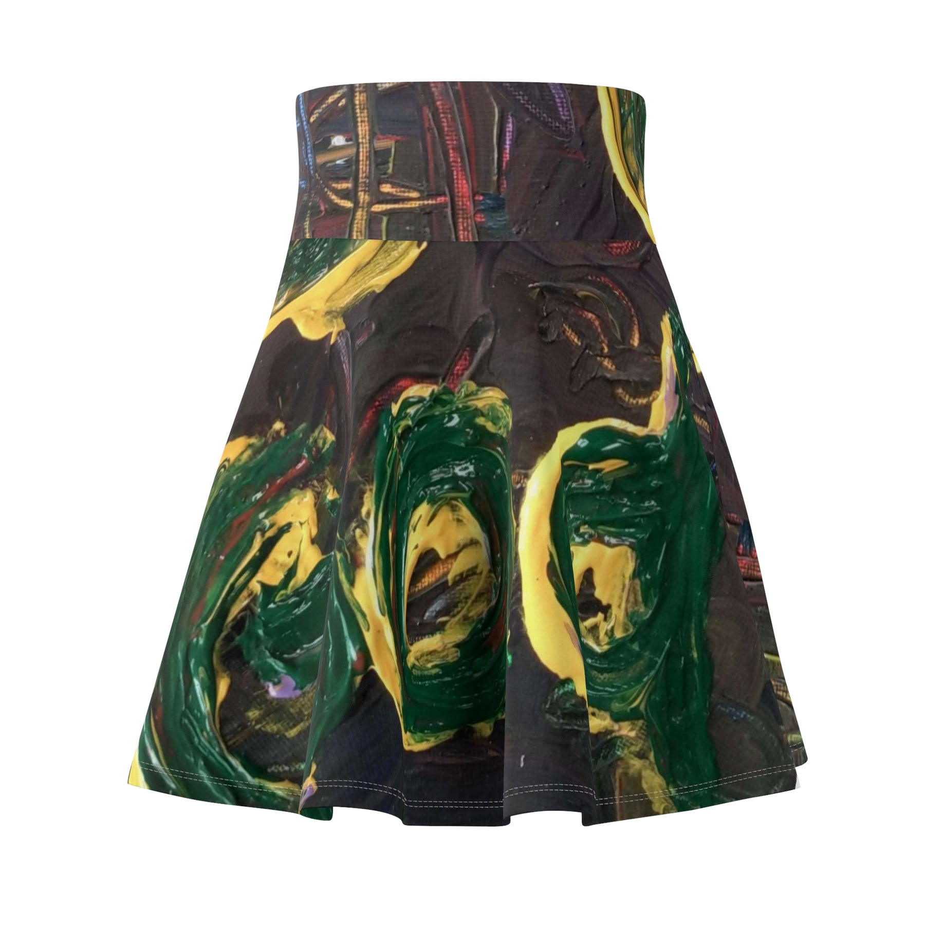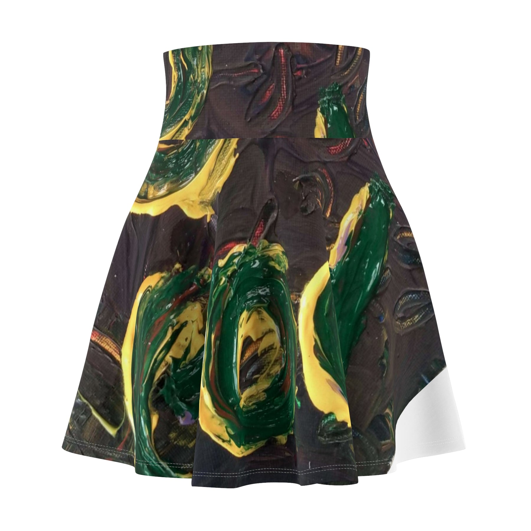 This high-waist skater skirt brings painterly energy to everyday wear. Rich, earthy swirls of green and deep brown blend with strokes of warm yellow, creating a hand-crafted, art-studio mood that moves with you. The wide double waistband sits high and secure while the flared skirt drifts open with a lively, feminine swing — great for wandering city streets, gallery nights, or coffee shop sketch sessions. Soft stretch fabric and flat seams keep the focus on comfort and flow so you can wear it all day and still feel like you stepped out of the studio.
