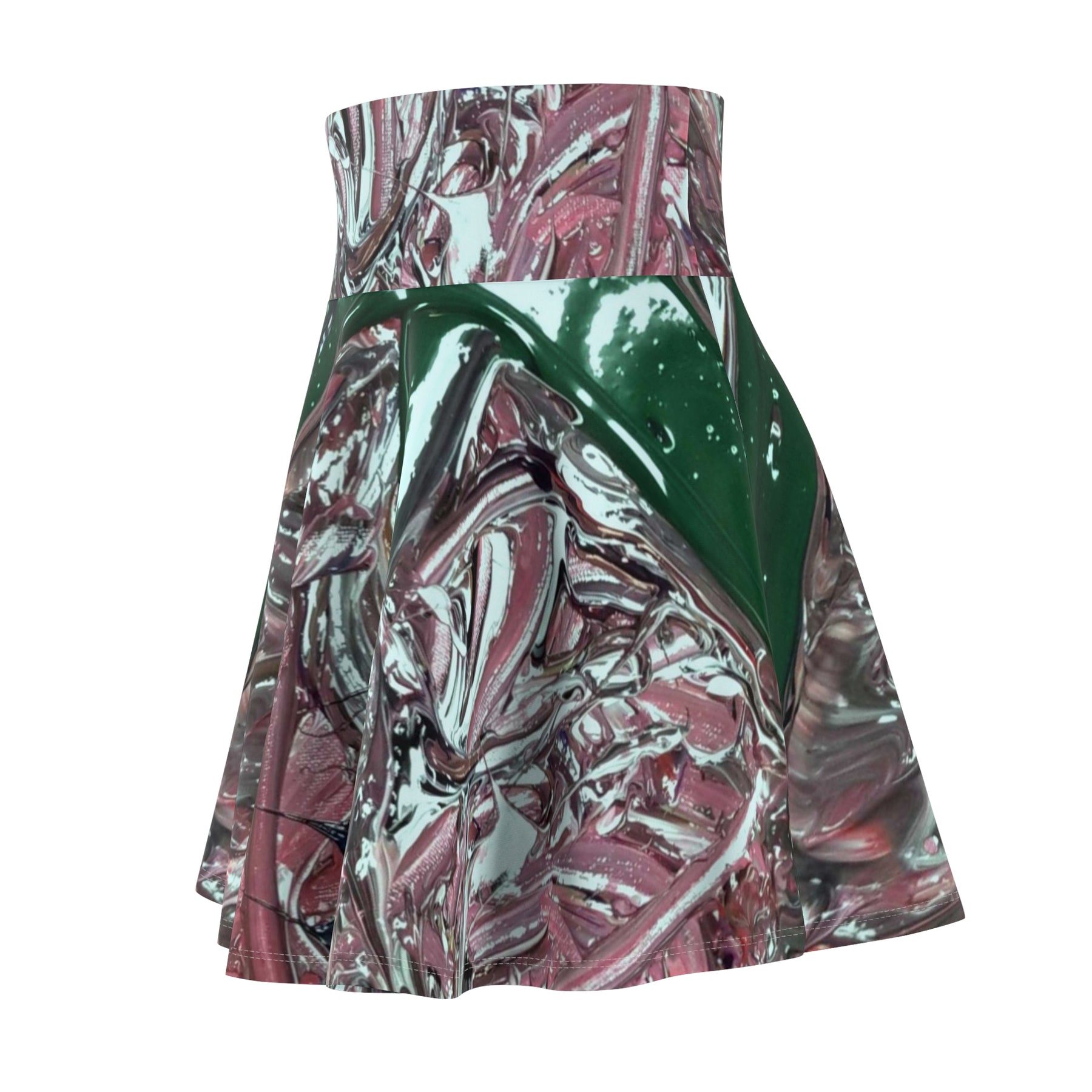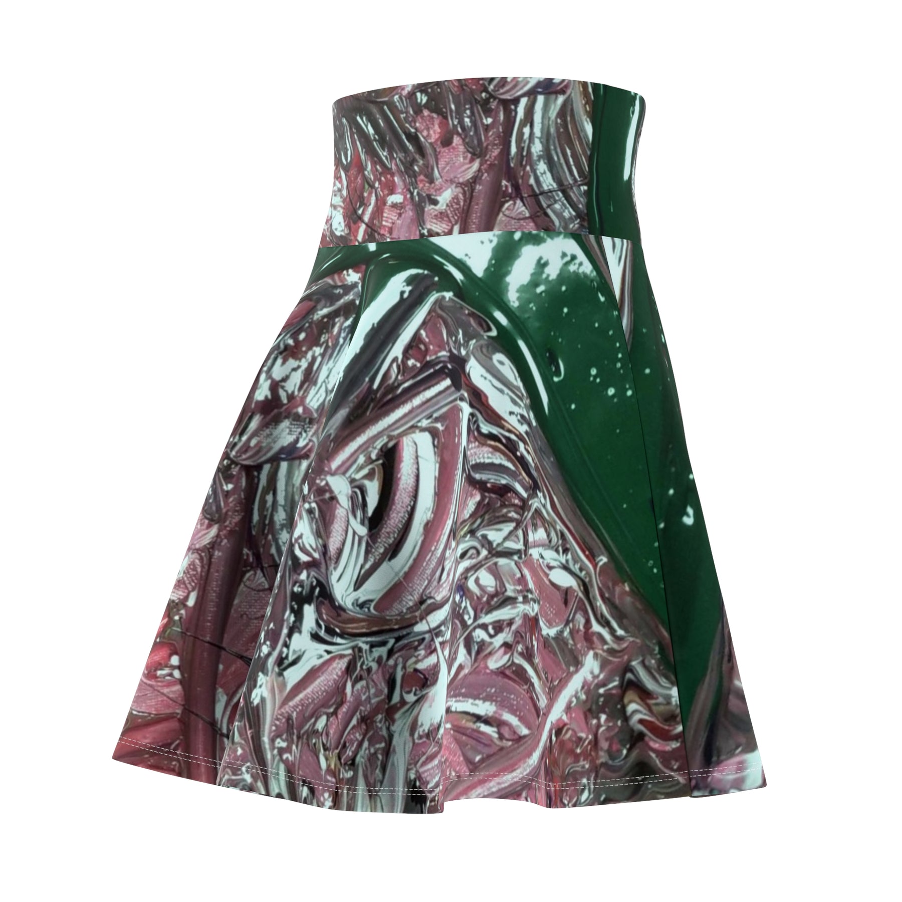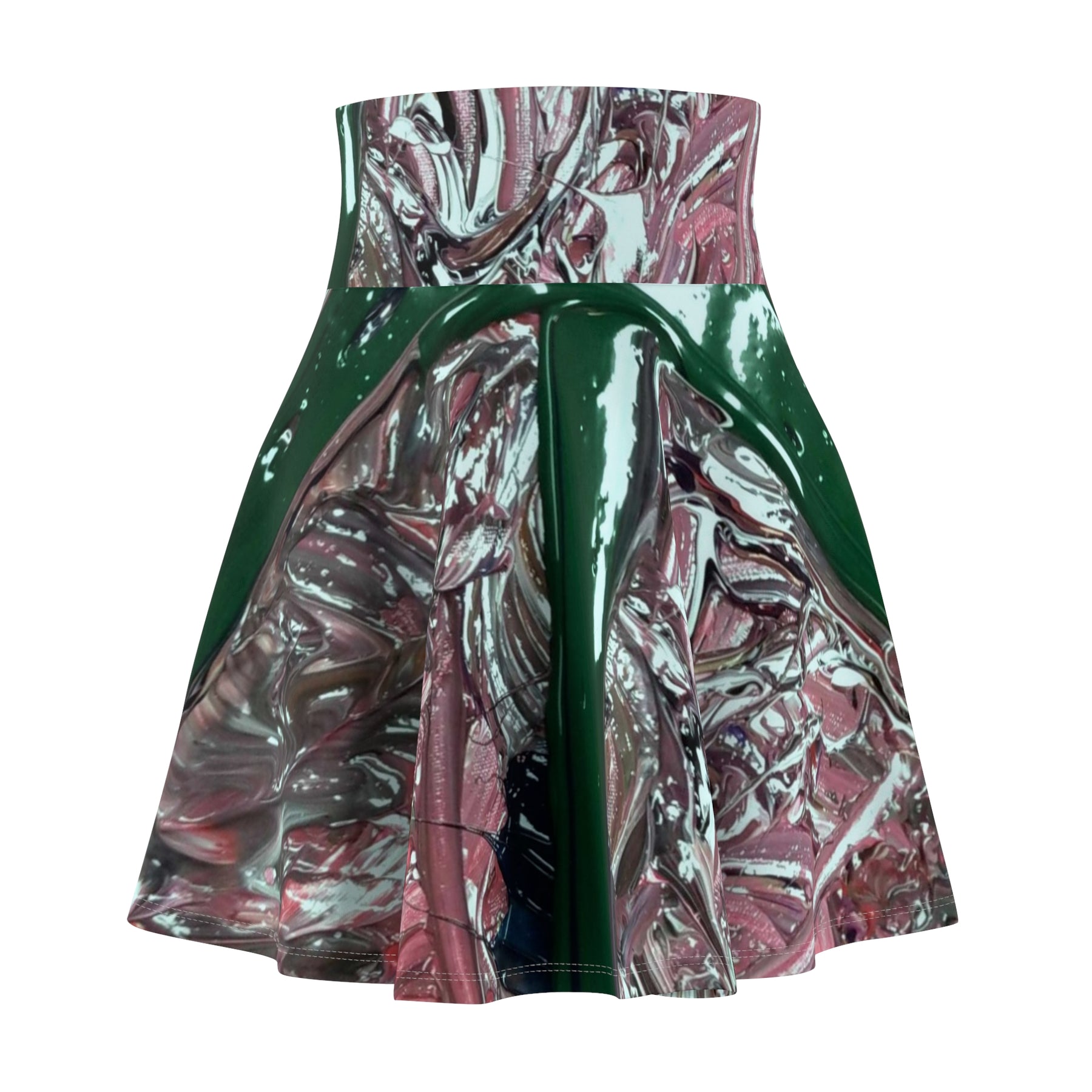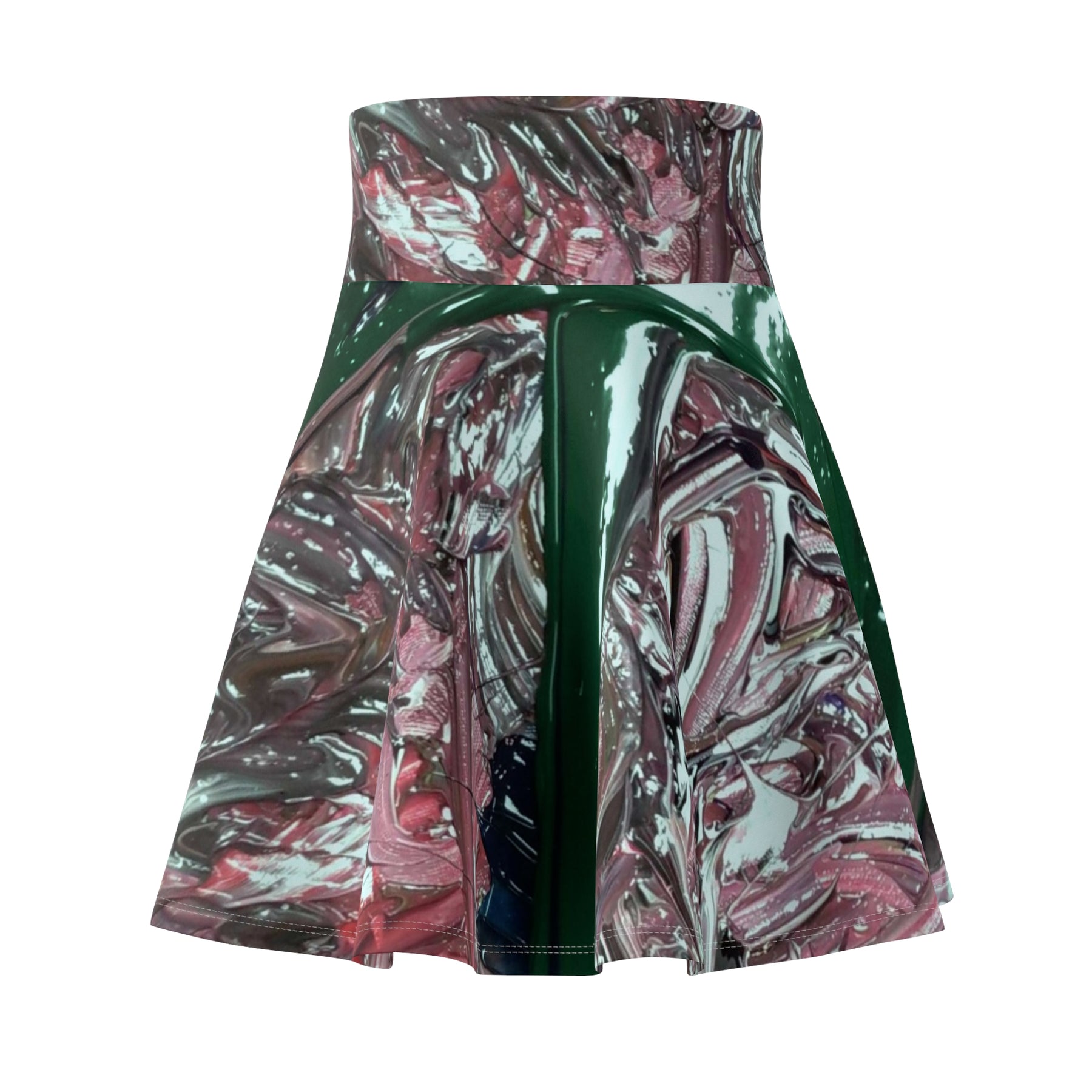 A flattering skater skirt that moves with you — soft, stretchy, and designed to sit high on the waist. The swirling abstract print mixes deep forest greens with dusky rose and metallic highlights, creating an artful, slightly mysterious look. The wide double waistband smooths and supports while the full, flared silhouette lightly skims the hips for effortless motion. Wear it with chunky boots and a cropped sweater for weekend wandering, or pair with tights and a leather jacket for nights out. It’s for people who love wearable art and subtle drama in everyday dressing.