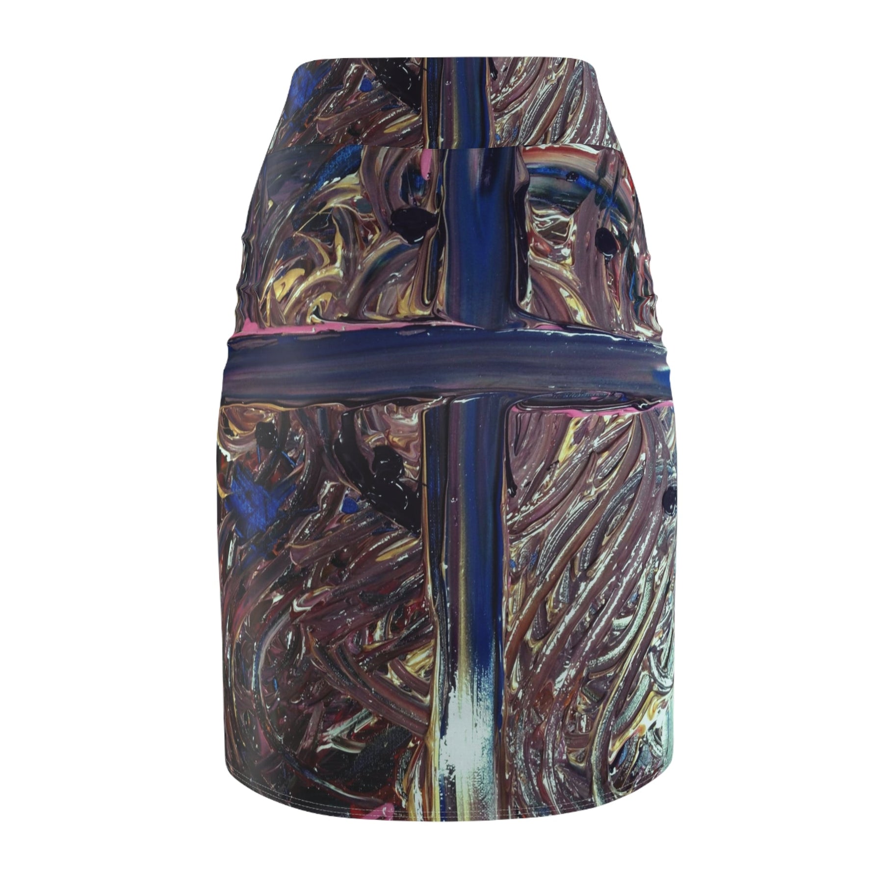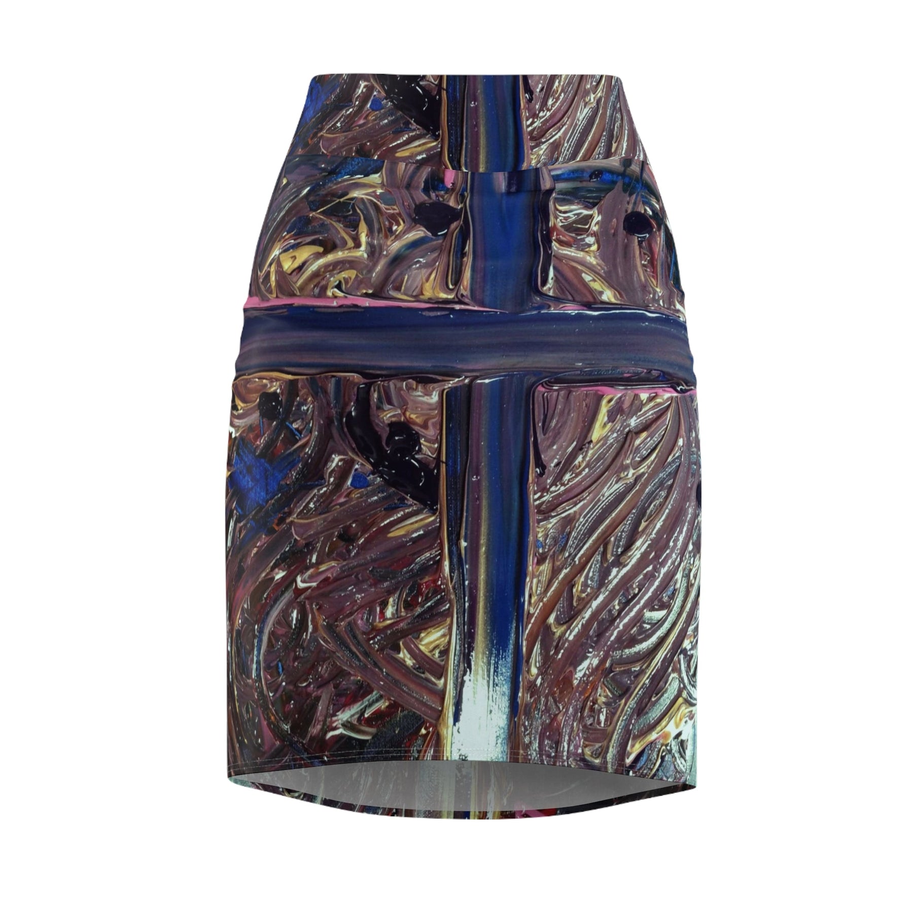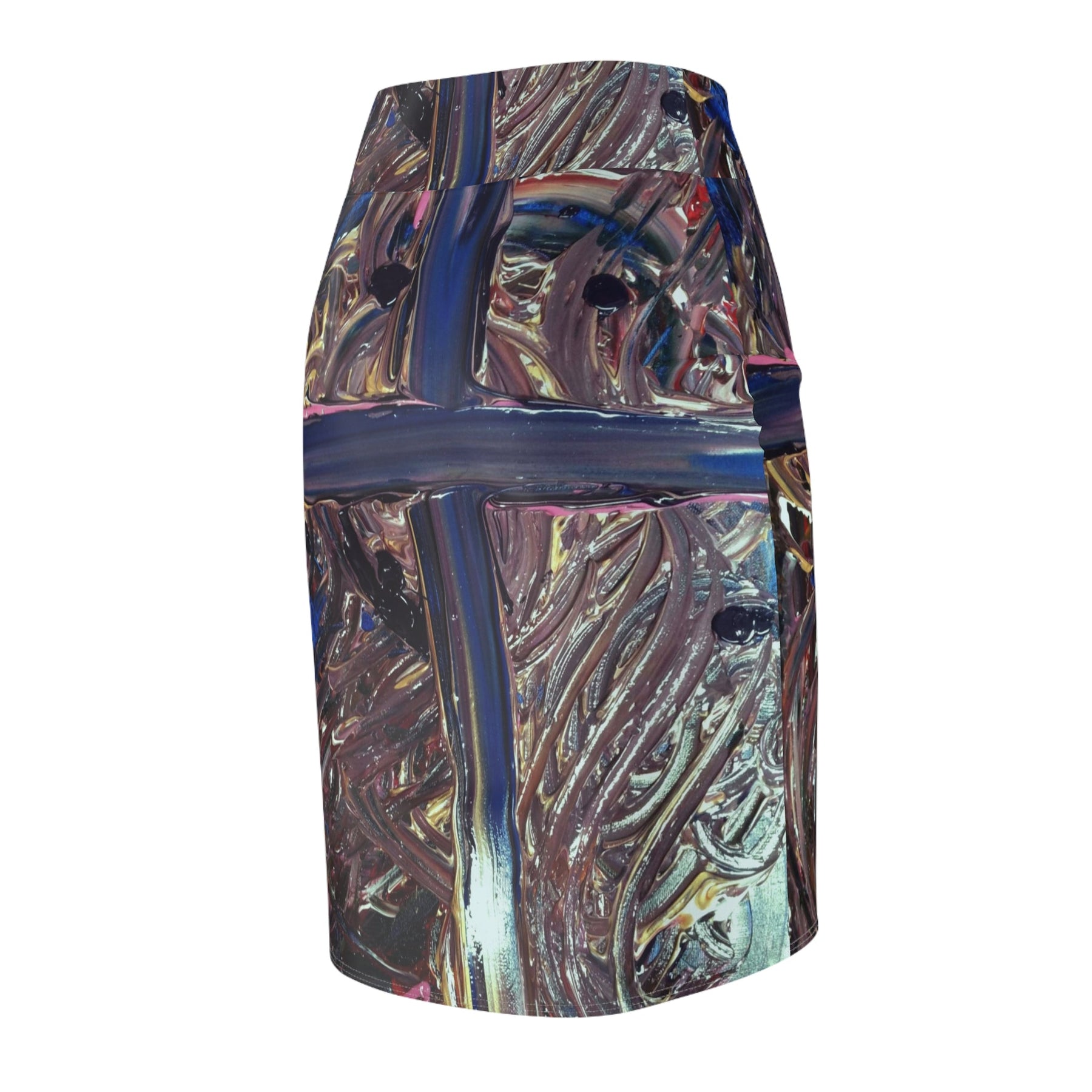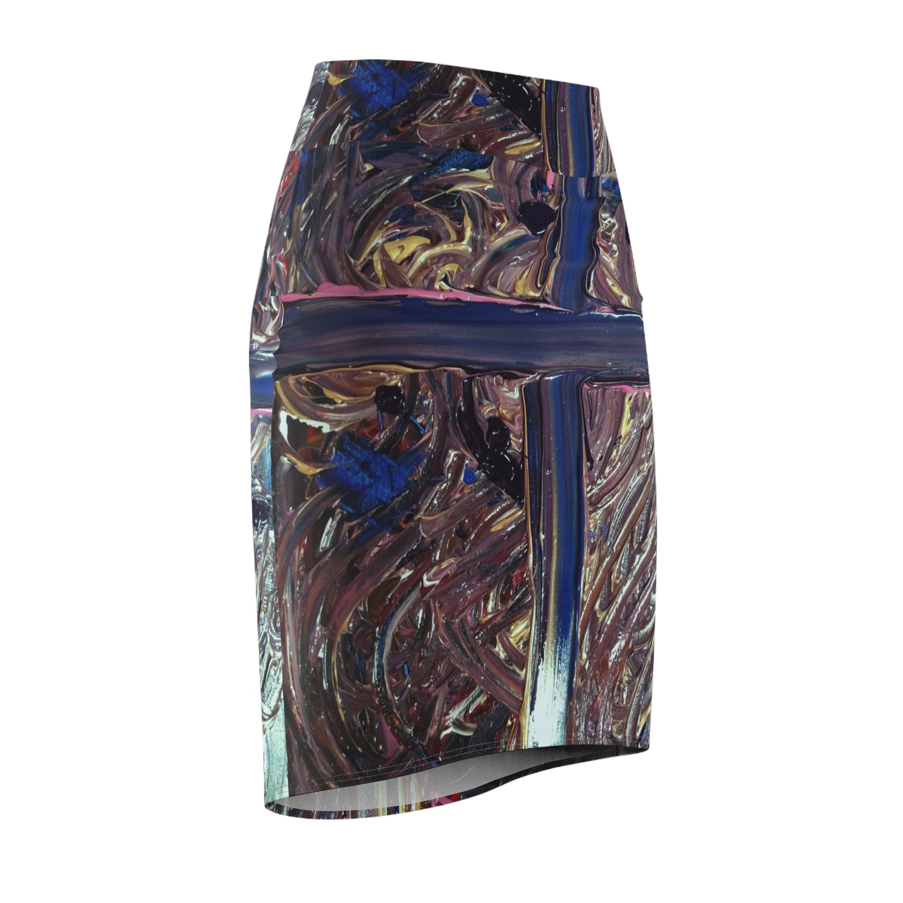 A sleek, mid-waist pencil skirt printed all over with a rich, abstract painterly pattern. The deep, layered colors and bold cross motif read like a handcrafted canvas — wearable art that moves with you. The fabric stretches four ways for comfortable, form-fitting wear while flatlock seams keep the silhouette smooth under jackets and layers. Lightweight and durable, this skirt slips into both gallery nights and city commutes, bringing an expressive, textural accent to simple tops and structured coats.
