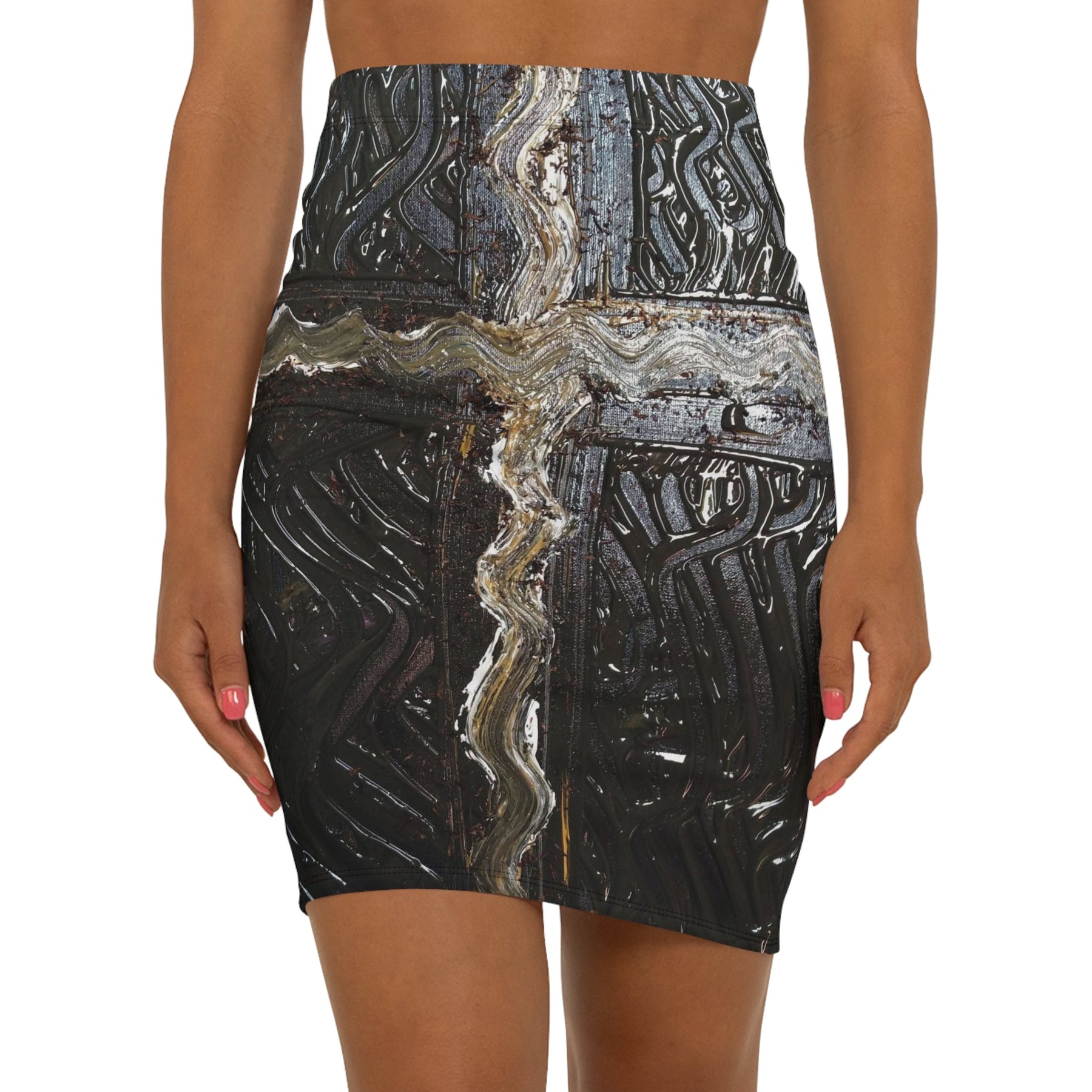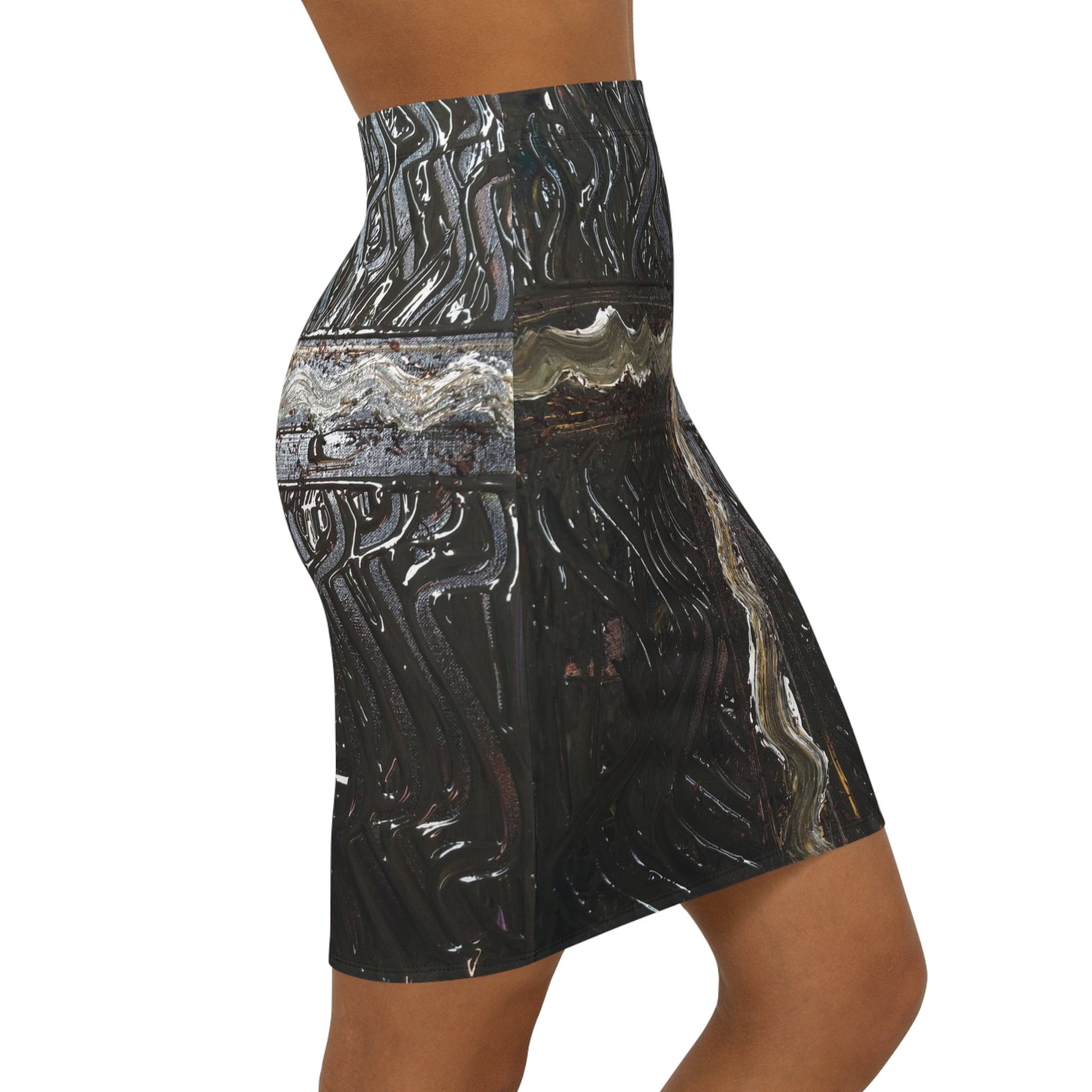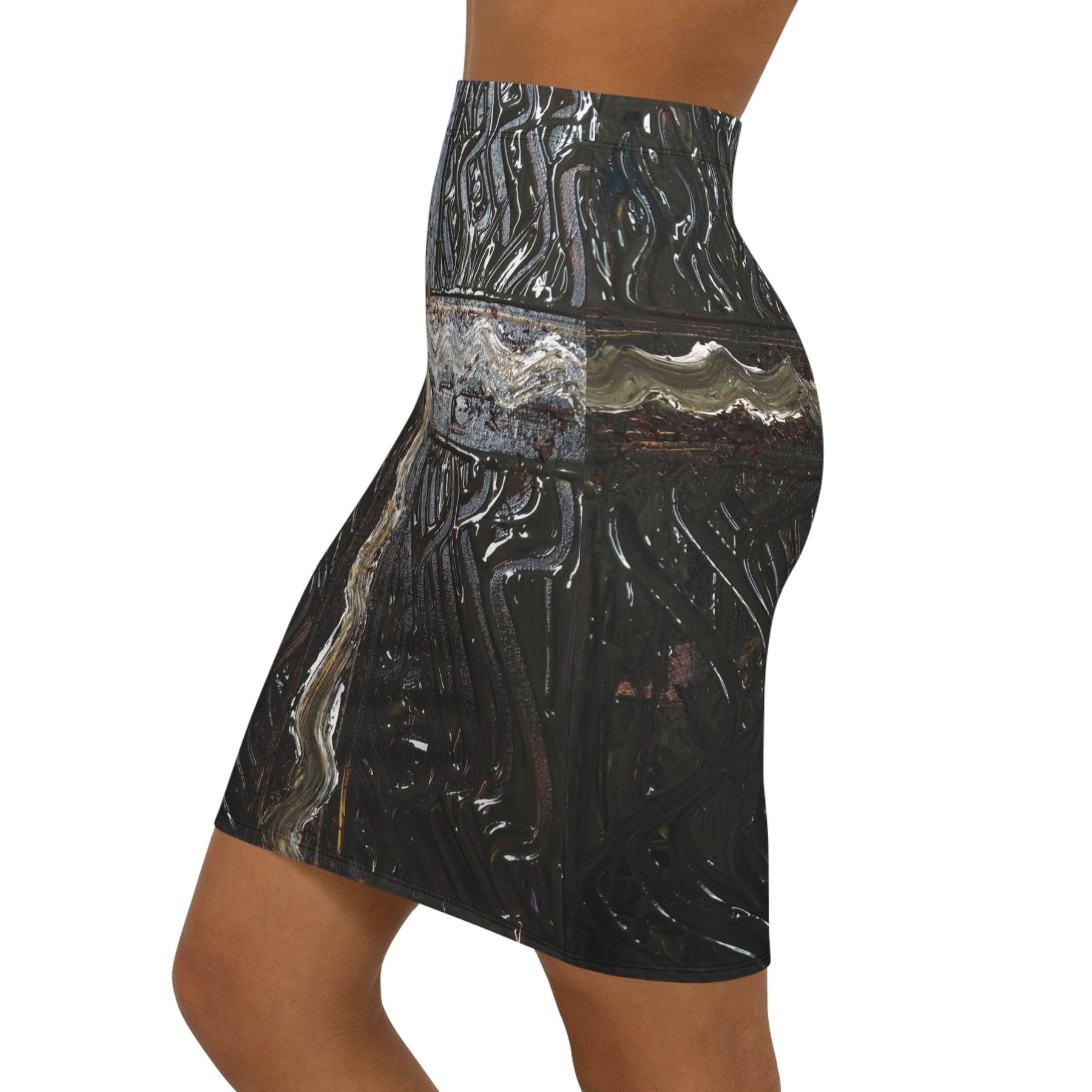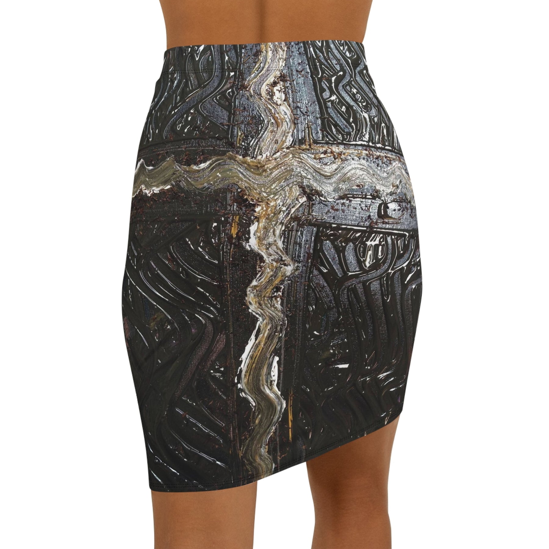 This mid-waist pencil skirt brings urban grit and subtle edge to your everyday wardrobe. Dark, textured patterns read like weathered metal and industrial murals — an unexpected statement that layers easily under a cropped jacket or over a slouchy knit. The slim, mid-rise cut hugs curves without restricting movement, while the elastic waistband and 4-way stretch let you move from morning meetings to late-night shows with quiet confidence. Colors stay rich thanks to all-over printing that wraps the skirt in high-contrast detail. Wear it when you want your outfit to feel deliberate, artful, and a little rebellious.
