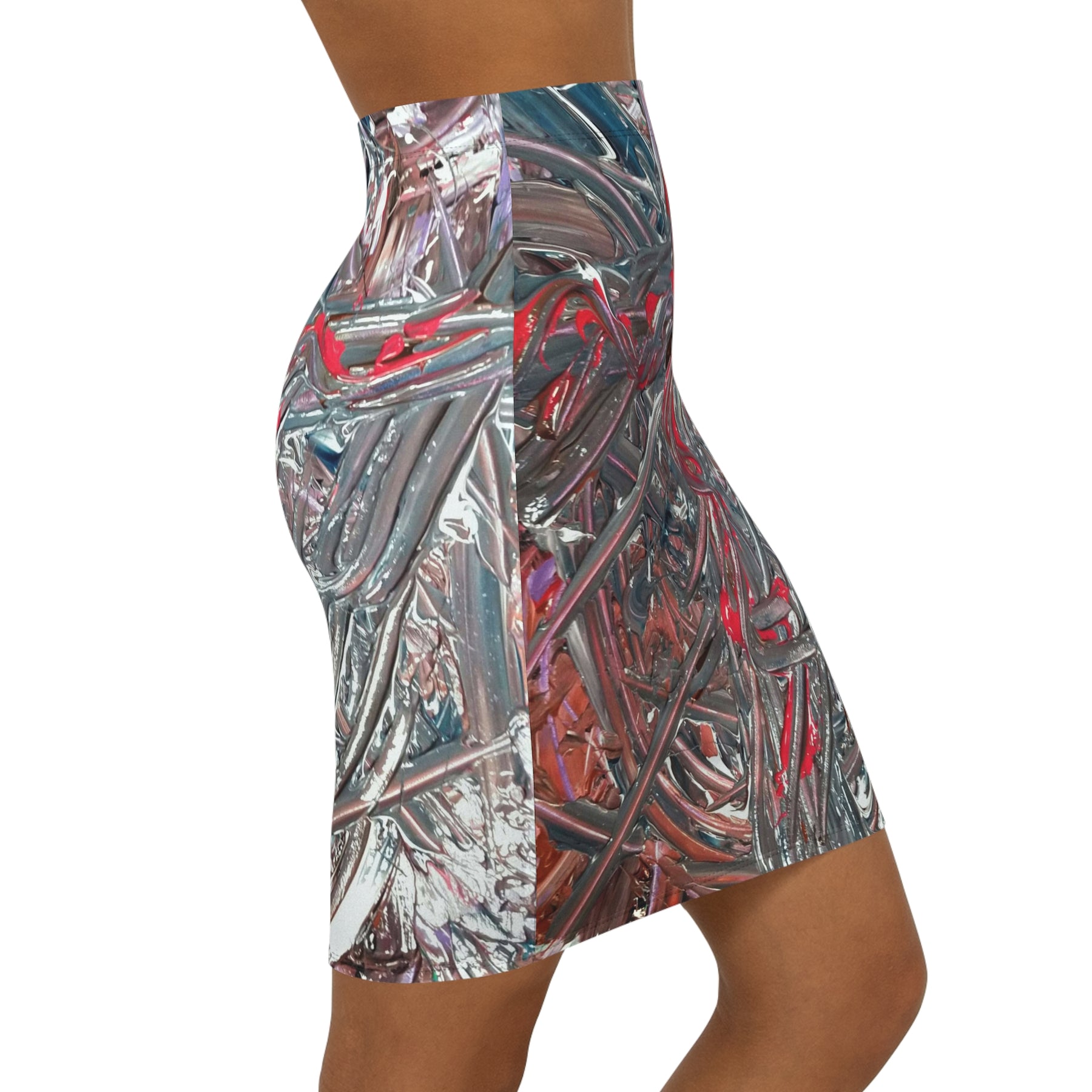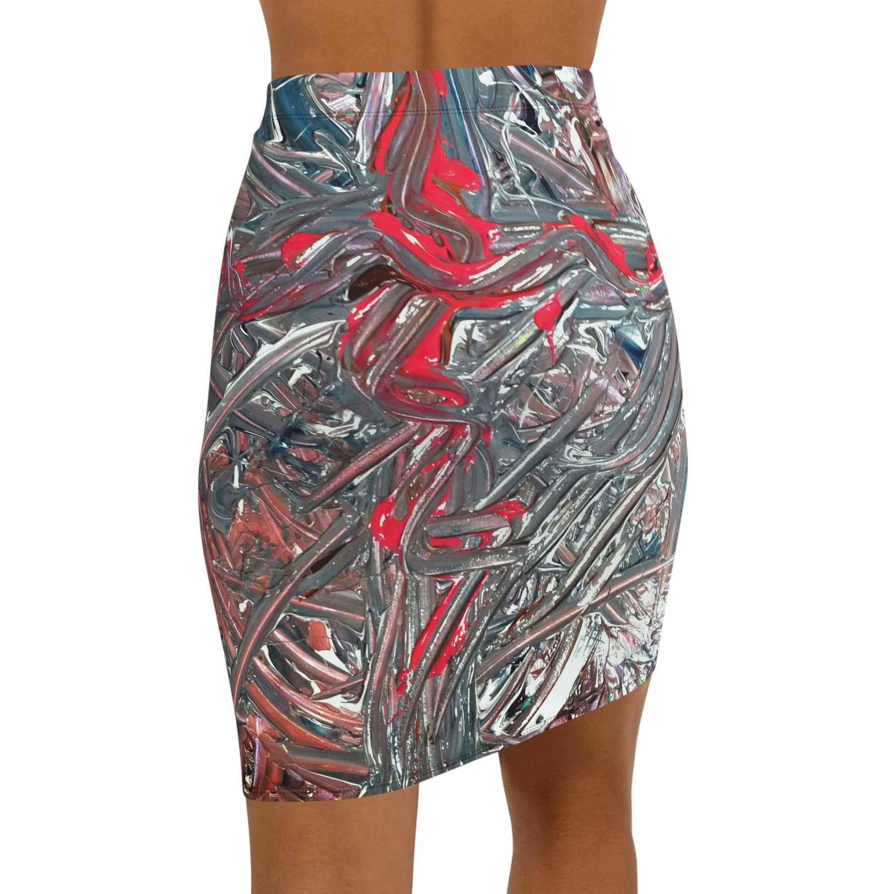 Abstract Red & Silver Brushstroke Pencil Skirt — Women's Mid‑Waist AOP