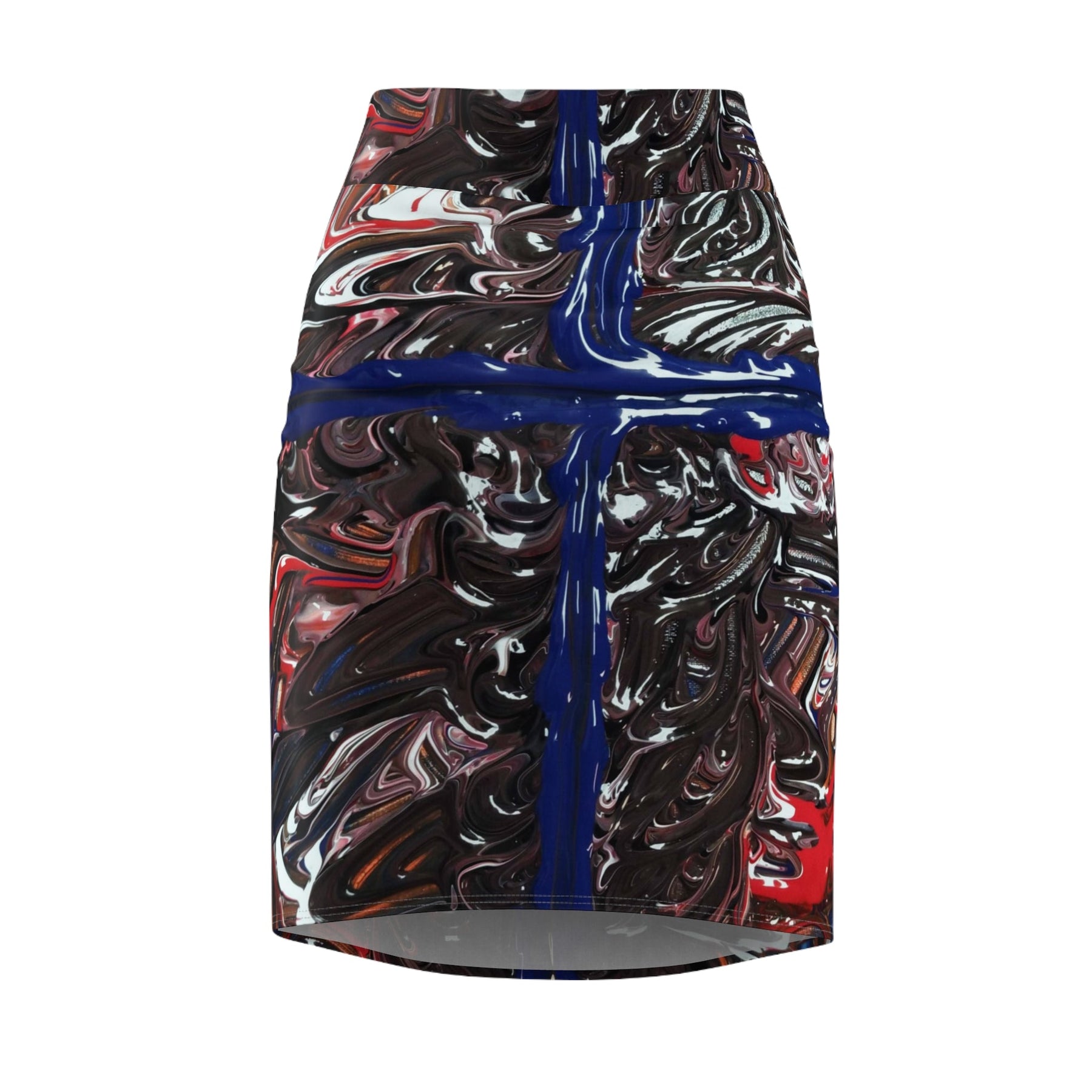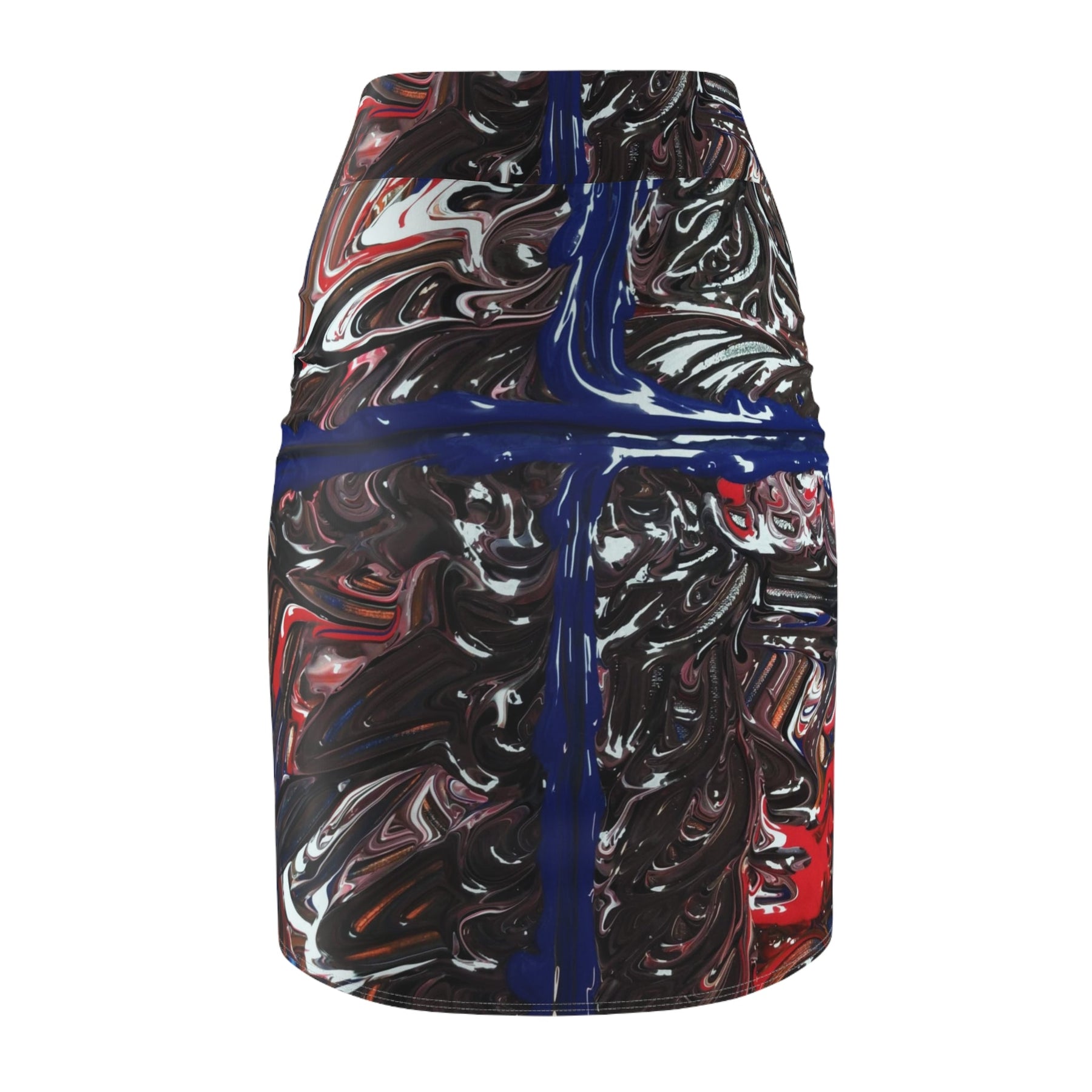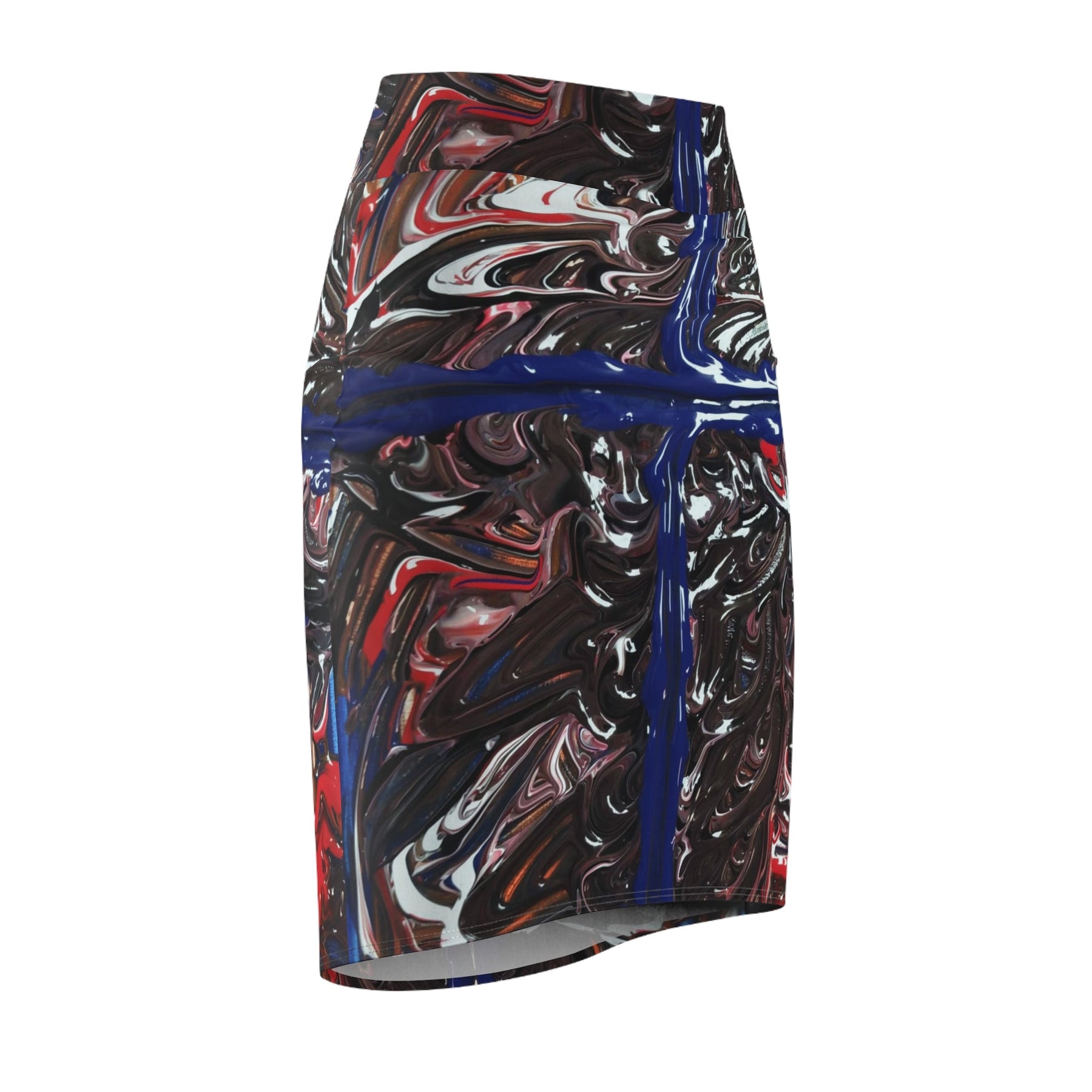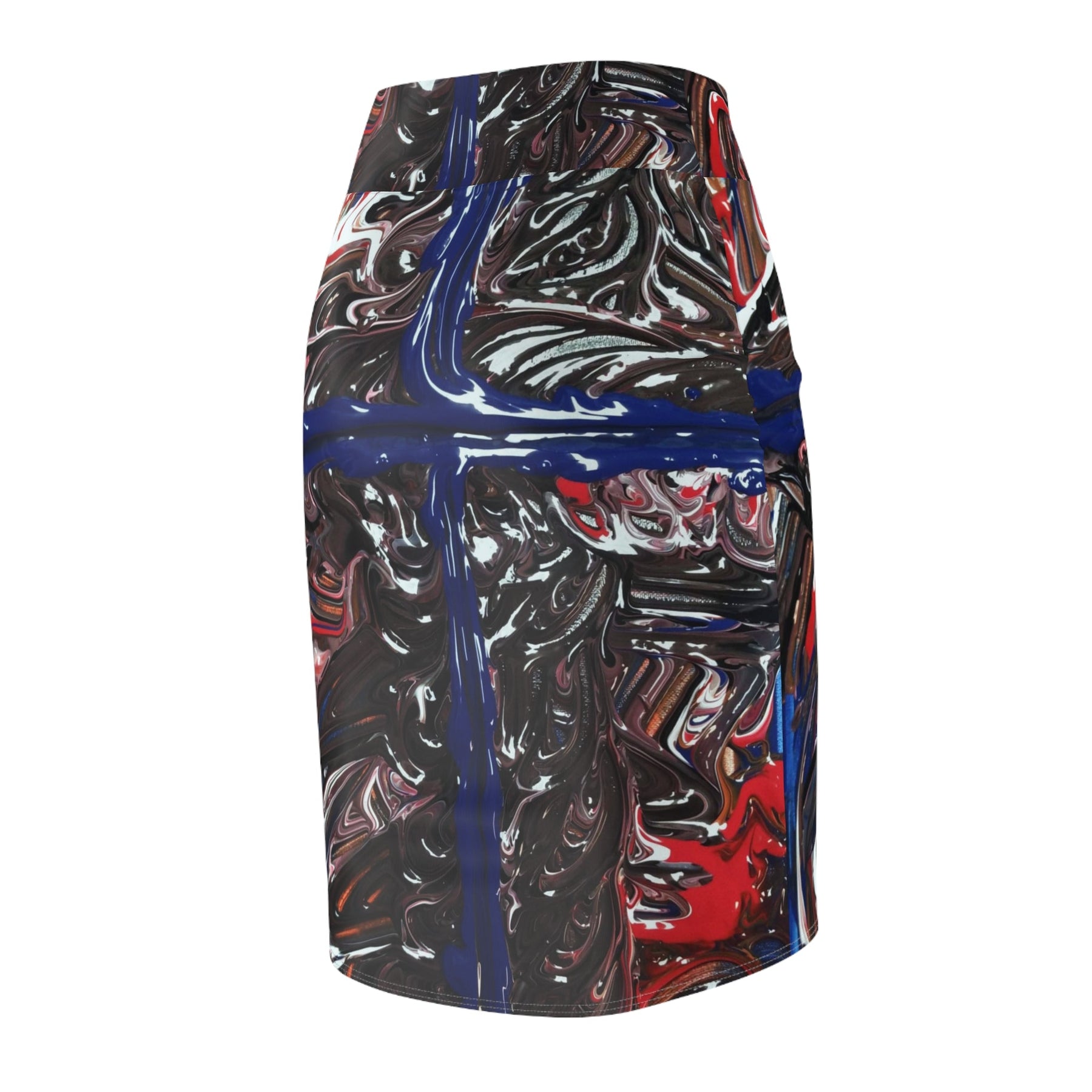 This mid-waist pencil skirt brings bold abstract art into everyday wear. Its all-over swirling print mixes deep blacks and browns with bright streaks of blue and red, creating a dynamic, painterly effect that moves with you. The fabric’s four-way stretch and soft polyester-spandex blend hug curves comfortably while allowing easy movement. Flatlock seams keep the silhouette smooth under layers, and the continuous roll-to-roll printing ensures the design wraps seamlessly around the skirt. Wear it to gallery openings, creative workdays, or nights out when you want an outfit that reads like a personal canvas — confident, modern, and unmistakably artistic.