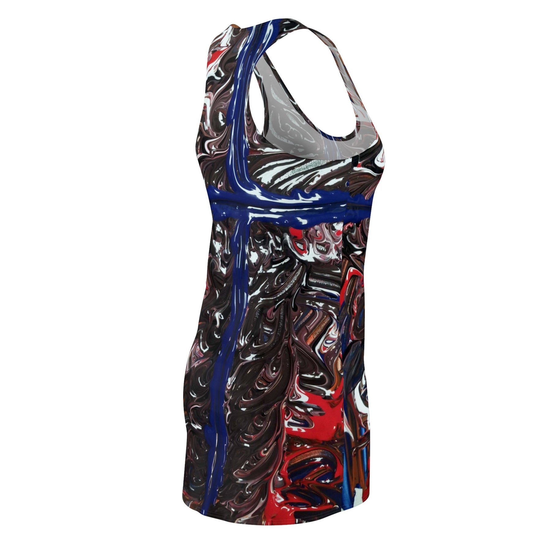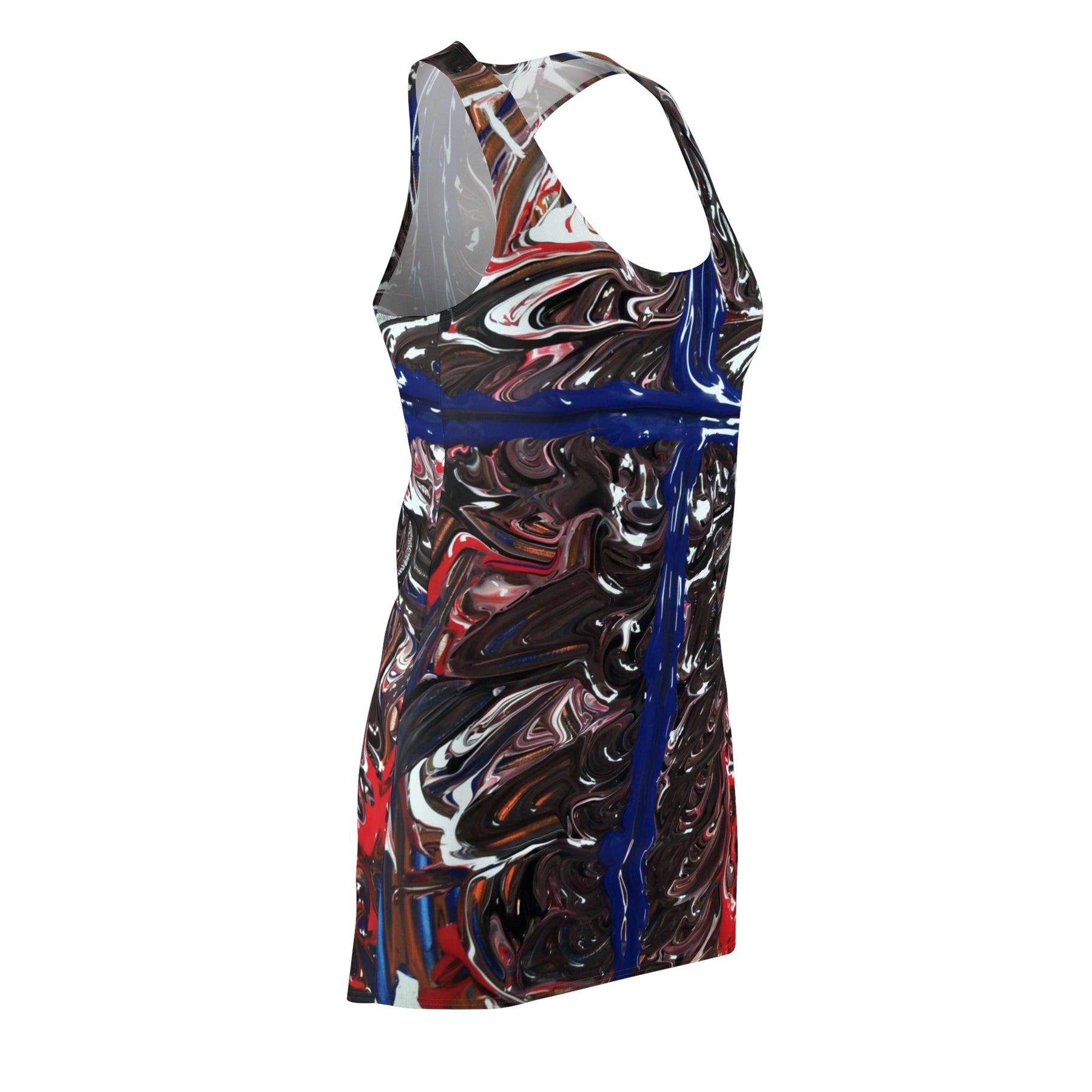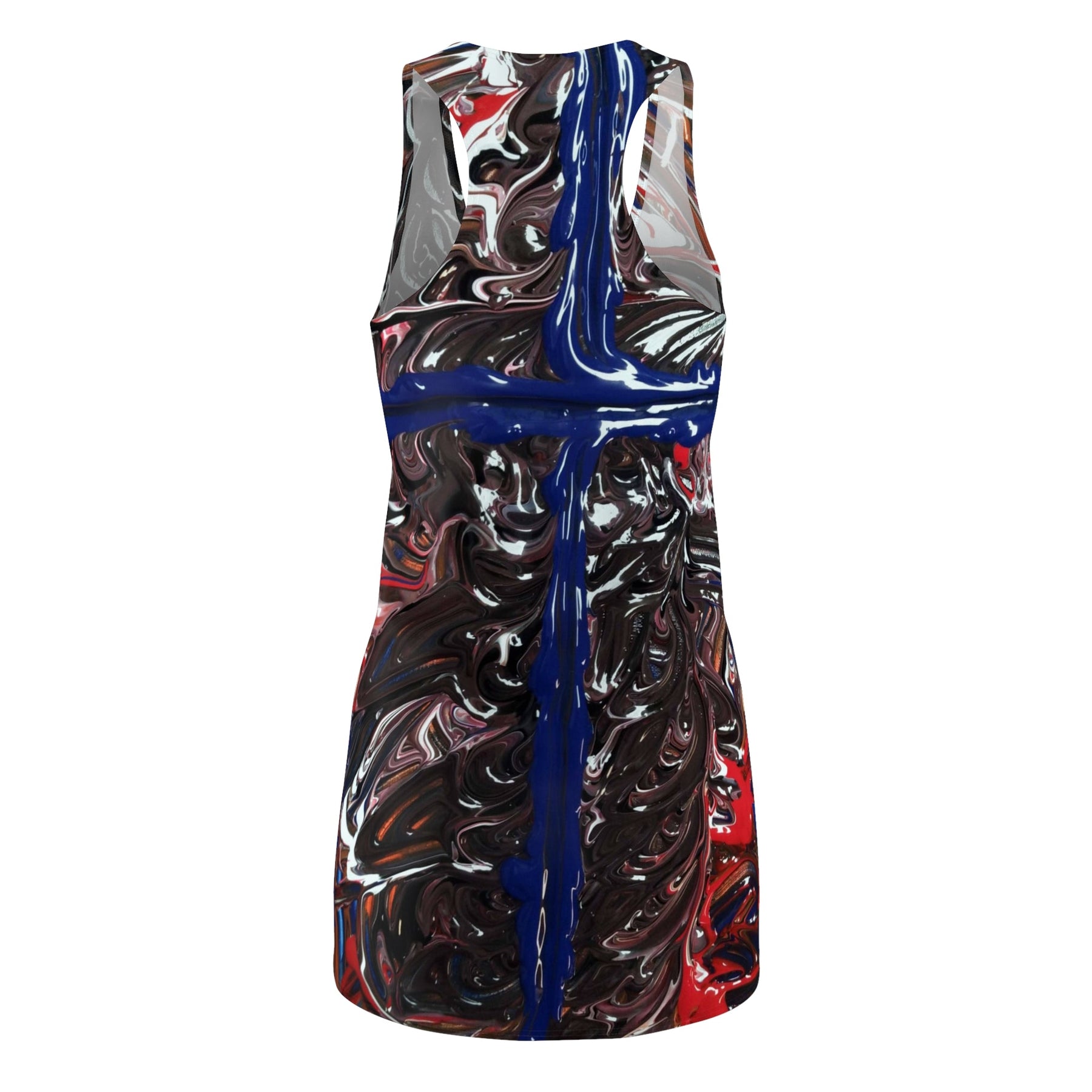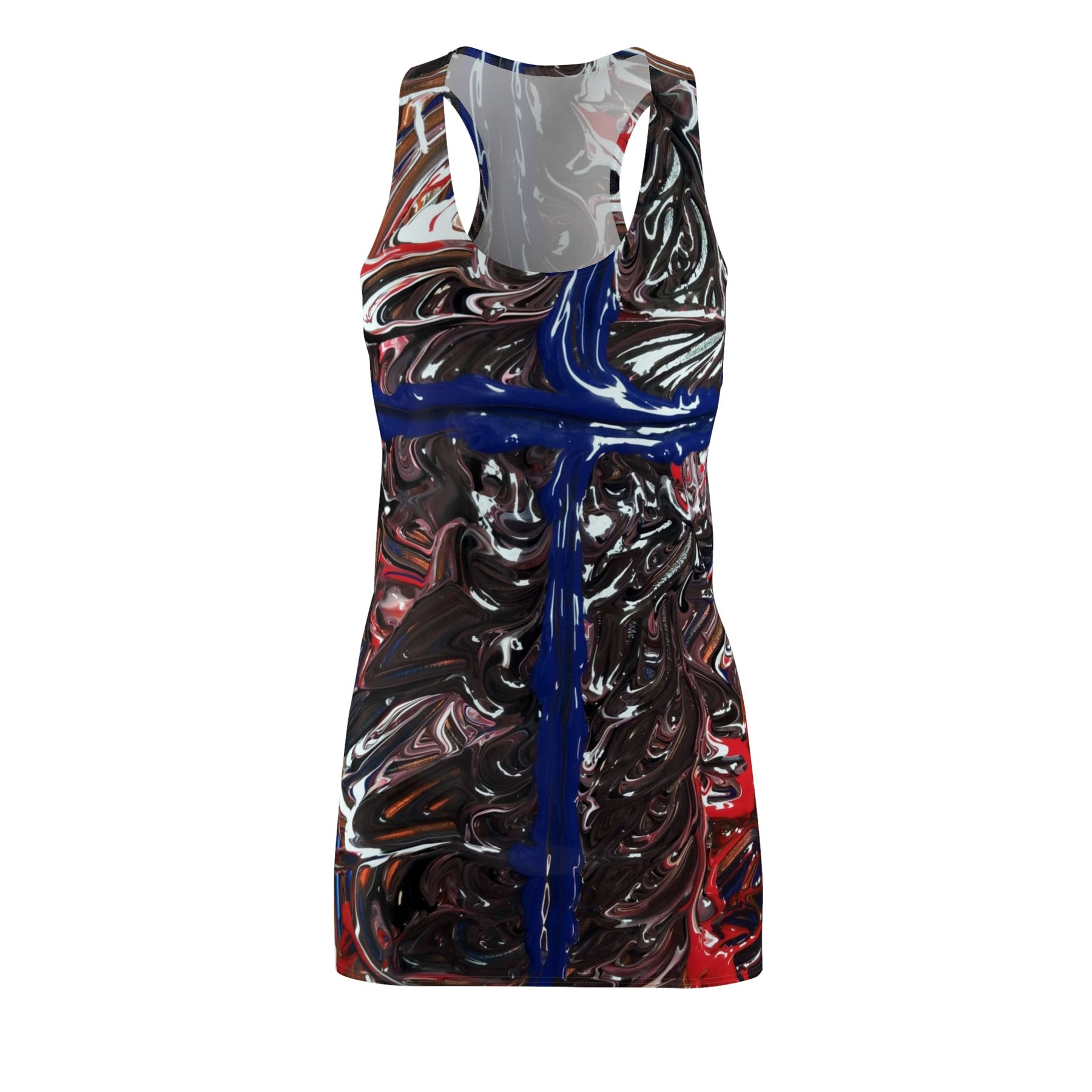 This racerback dress brings bold, painterly energy to everyday wear. The all-over print looks like thick, glossy brushstrokes — deep blacks and reds swirl around a striking cobalt cross that runs down the center. Lightweight and athletic in cut, the dress moves with you: it sits close to the body without feeling stiff, breathes on warmer days, and dries quickly after a long commute or an afternoon outdoors. Wear it layered under a denim jacket for gallery nights, or alone with sneakers for city wandering. The visual drama of the print makes it a conversation starter; the sporty fit keeps it comfortable during long hours of exploring or running errands.