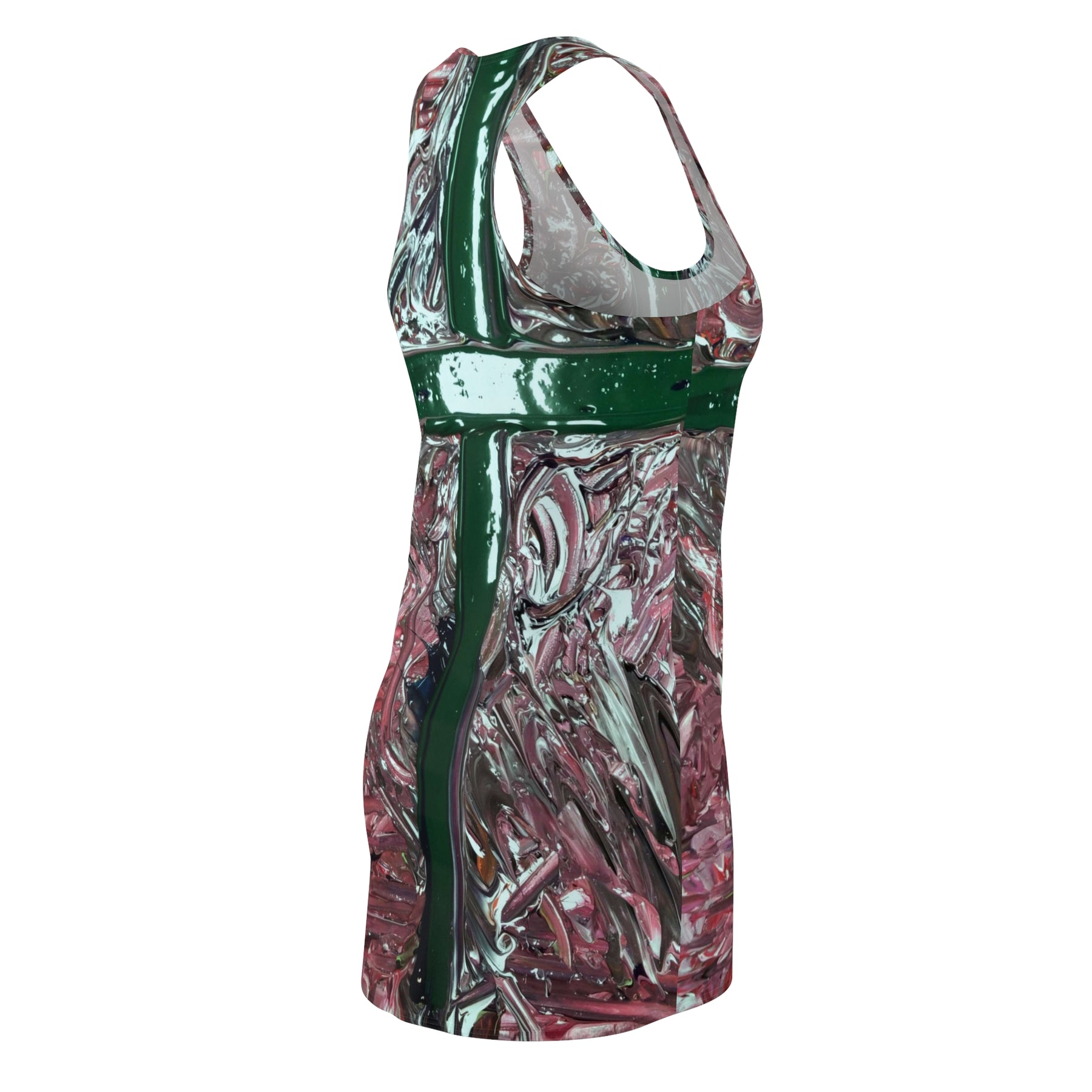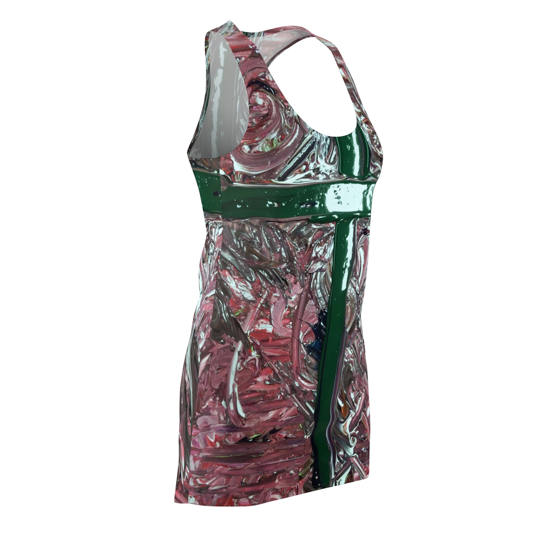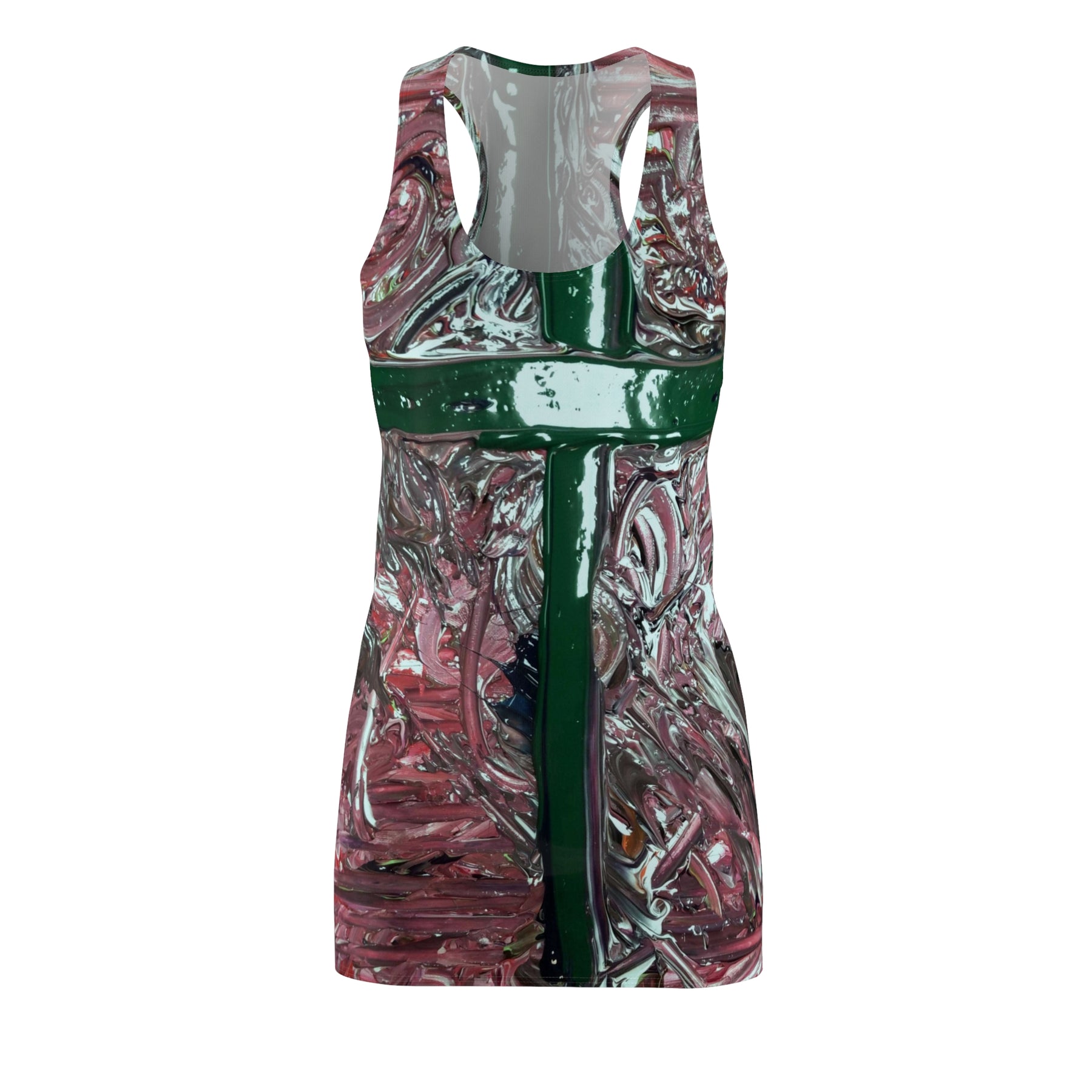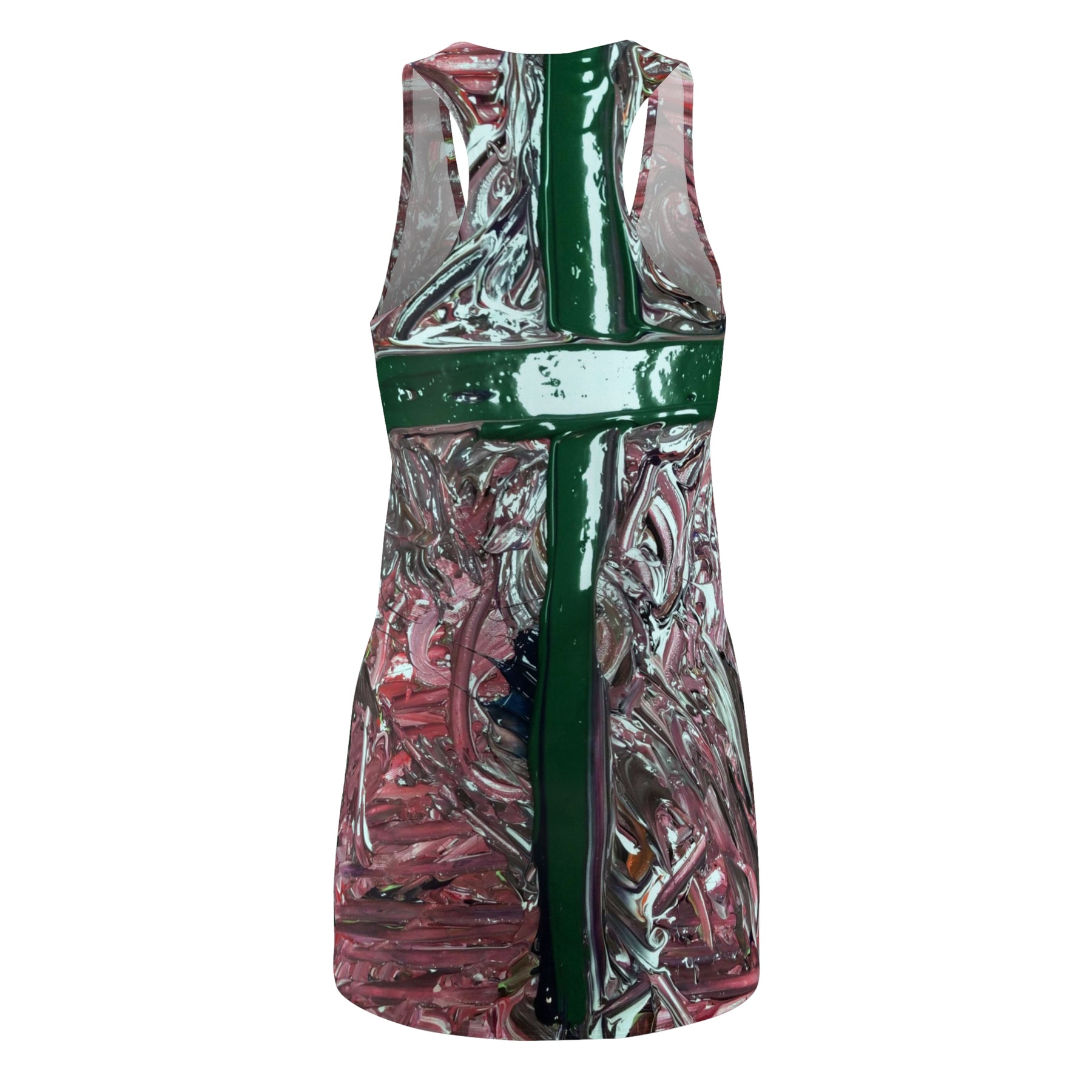 This lightweight racerback dress brings bold, abstract brushwork into active wardrobes. The all-over print wraps in swirling maroon and rose tones, sliced by a glossy, deep-green cross that reads like hand-painted enamel. Sporty and streamlined, the dress moves with you — breathable polyester, a clean tagless finish, and self-fabric binding keep the silhouette tidy during runs, studio sessions, or city afternoons. Wear it when you want artful energy without fuss: it layers under a denim jacket for market strolls, stands alone for studio rehearsals, or pairs with chunky sneakers for an urban gallery hop. The texture-like print feels tactile and expressive; the racerback cut frees your shoulders for movement while maintaining a flattering, athletic line.