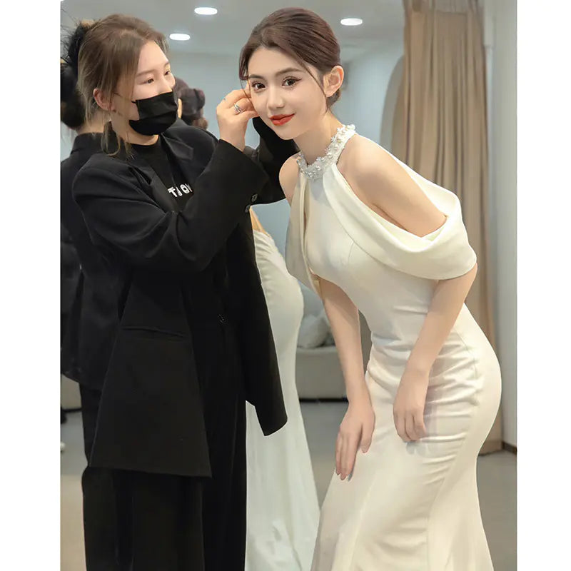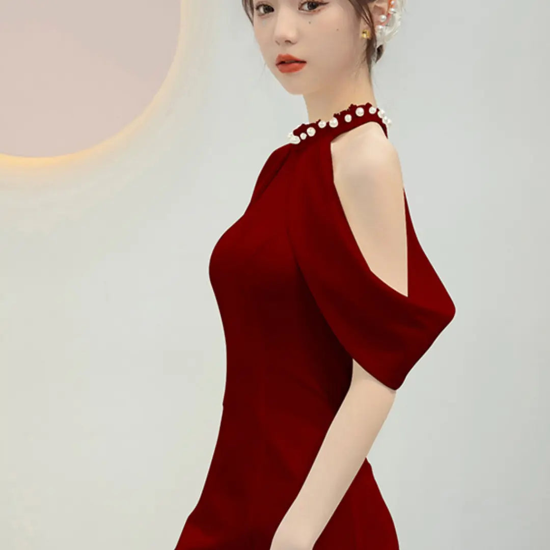 Elevate your special occasion with our stunning Wine Red Luxury Neck Hanging Wedding Dress. Designed for the modern bride, this exquisite engagement party dress combines elegance with a touch of sophistication.