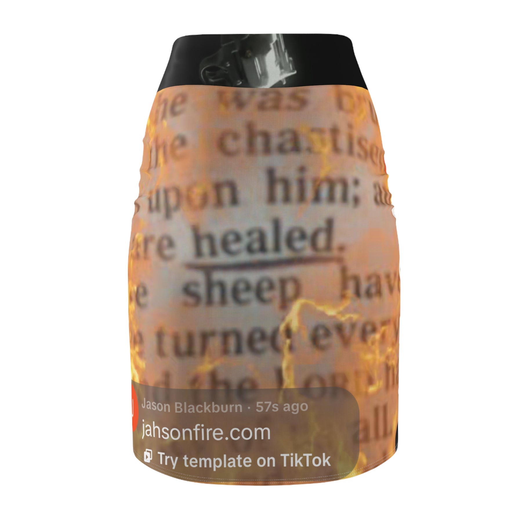 This mid-waist pencil skirt blends bold, expressive imagery with a sleek, body-hugging silhouette. The all-over print wraps flames, a metallic handgun detail, and worn text into a dramatic collage that reads like a page scorched by memory. Stretchy fabric moves with you while flatlock seams keep the surface smooth. Wear it to nights when you want an outfit that feels like a statement — moody, resilient, and unapologetically direct.