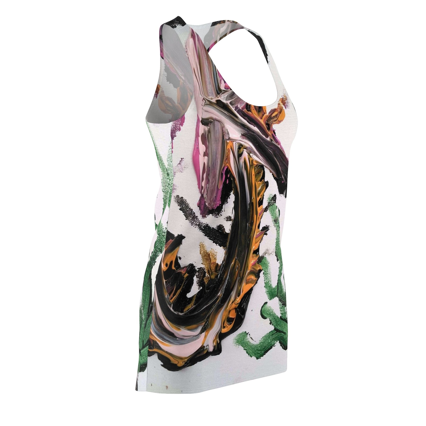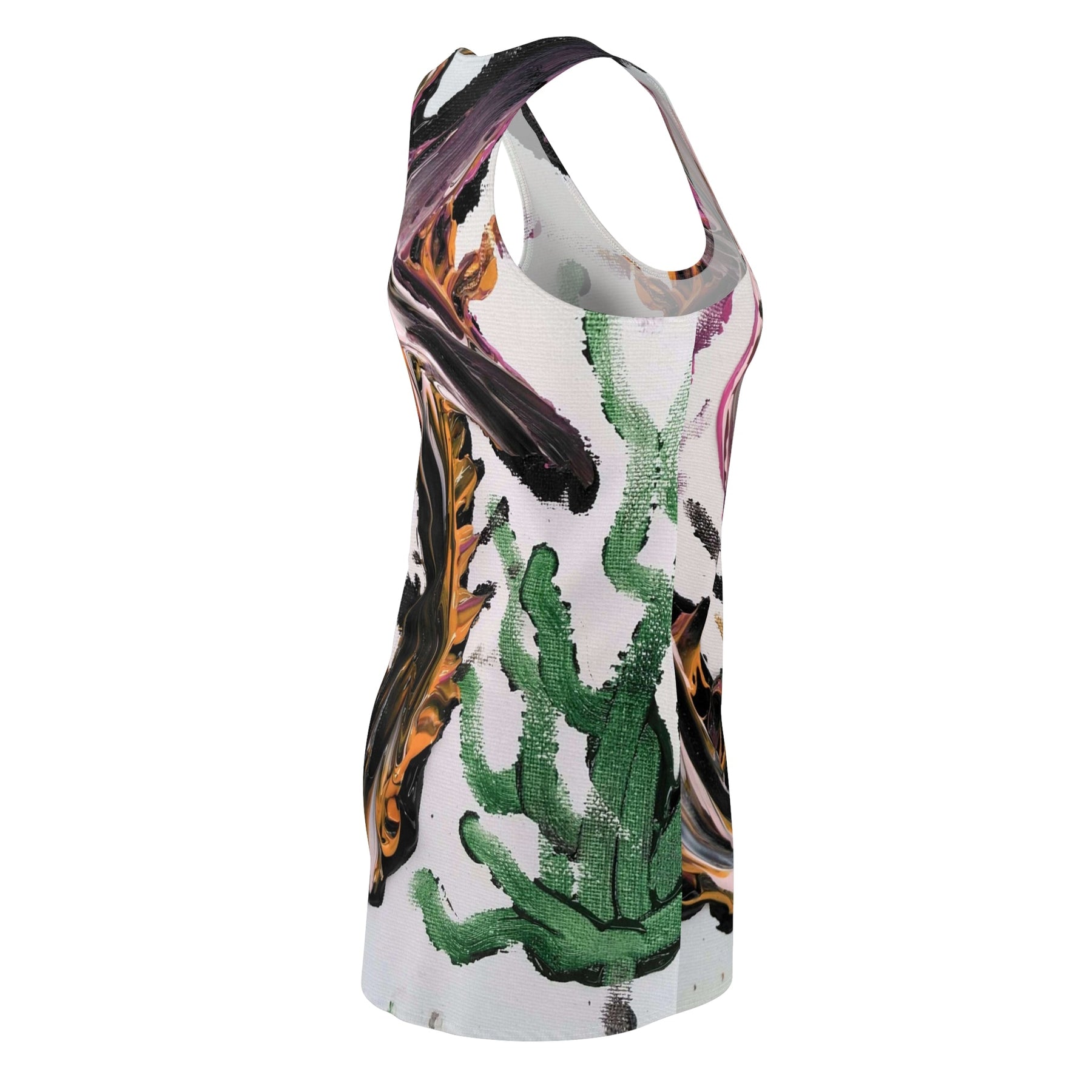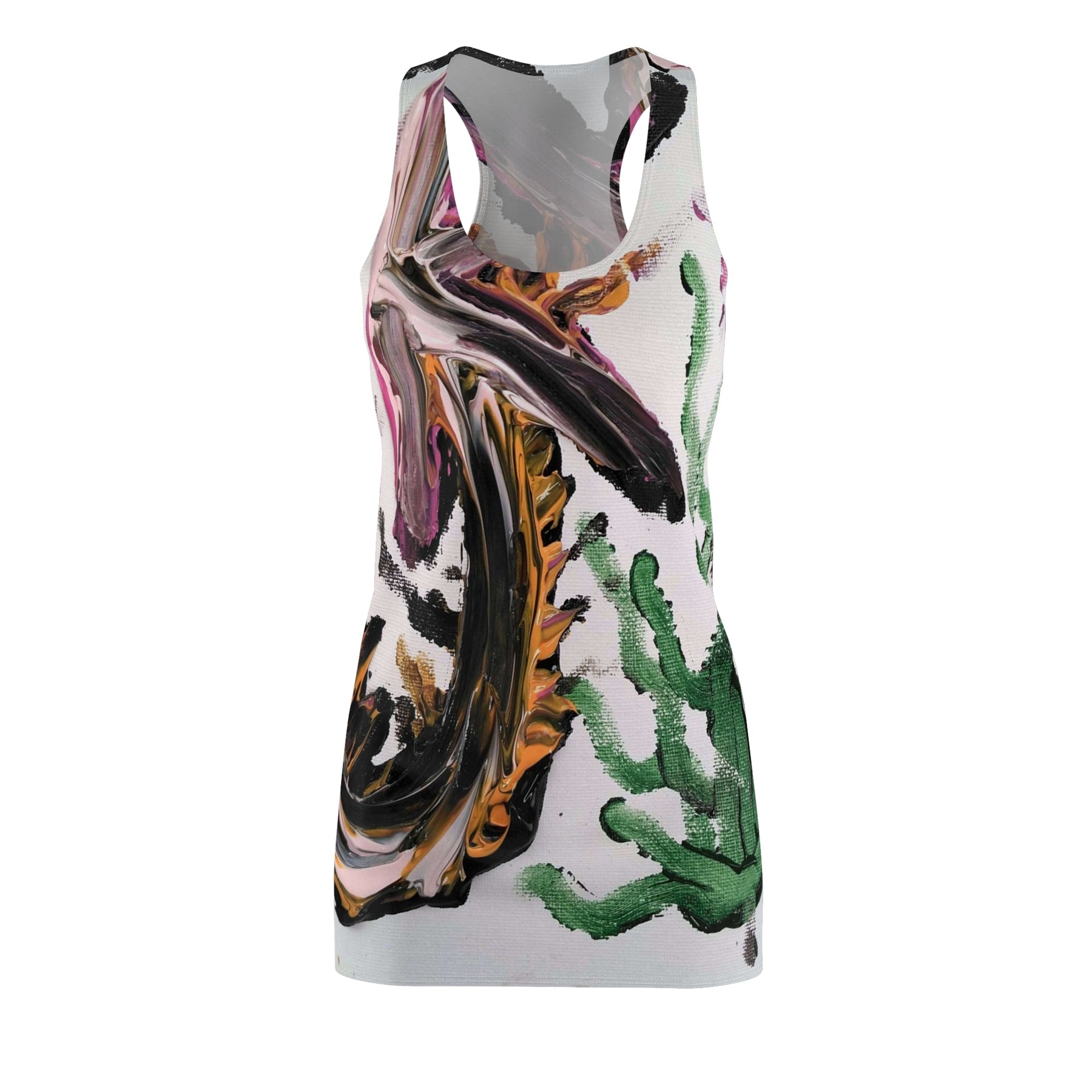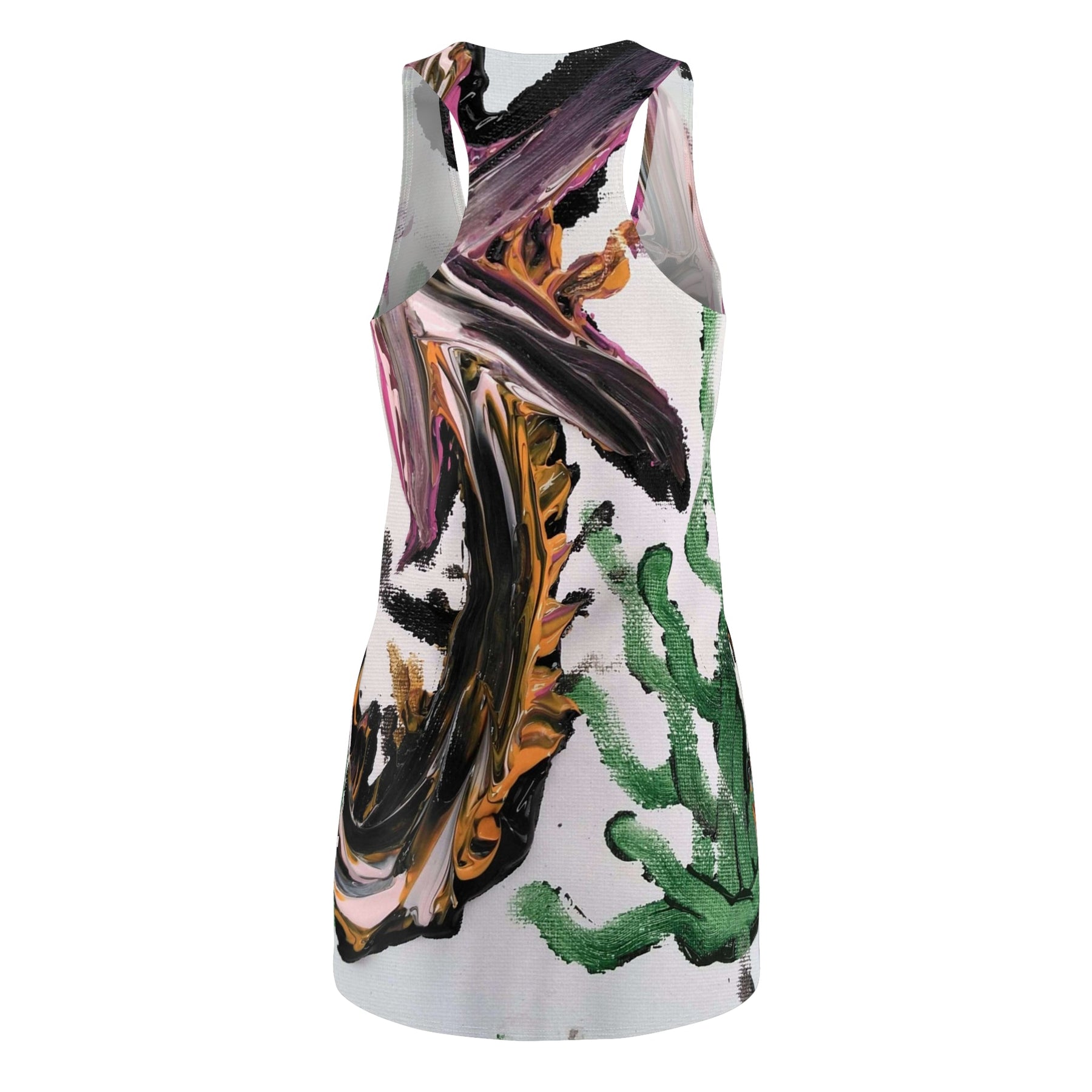 Breathe color and motion into your wardrobe with this racerback dress. Broad, painterly strokes of black, ochre, and magenta sweep across a fresh white base, punctuated by vibrant green shapes that feel like sunlit succulents. The sporty racerback silhouette lets your shoulders breathe and moves with you—whether you're wandering a Saturday market, sketching in a sunlit studio, or meeting friends for an alfresco lunch. Lightweight and resilient, the fabric sits close to the body without restriction, carrying the art of the print into every step. This dress wears like a morning you don’t want to end: lively, a little bold, and quietly confident.