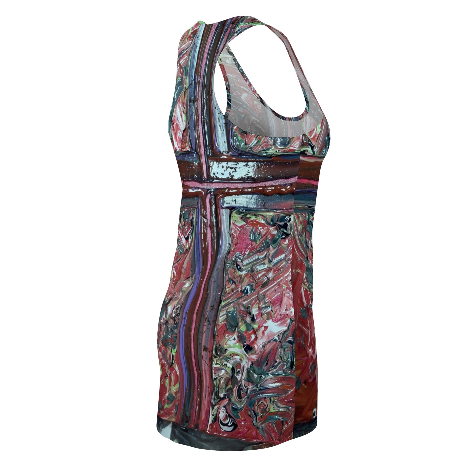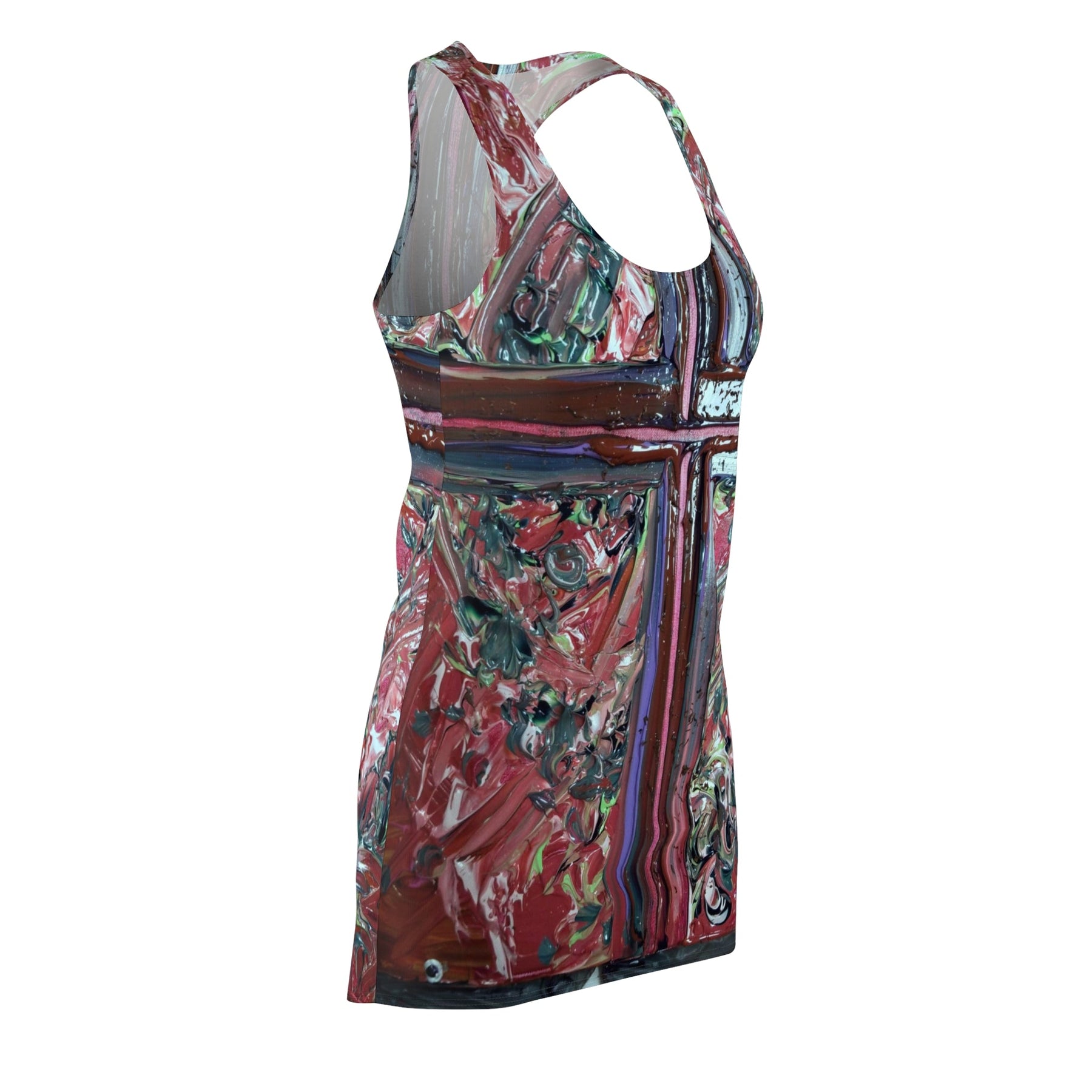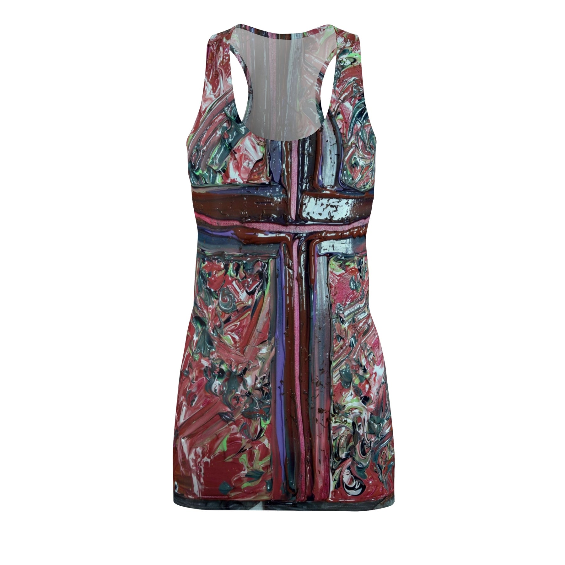 This lightweight racerback dress brings an art-studio energy to everyday wear. Painted, textured strokes form a bold vertical cross down the front and back, with layered reds, muted teals, and deep browns that feel handcrafted and expressive. The sporty silhouette moves with you—breathable, quick-drying polyester keeps the print vivid while staying comfortable in warm weather or layered with a jacket. Wear it when you want an outfit that reads like a wearable canvas: confident, free, and a little raw around the edges.