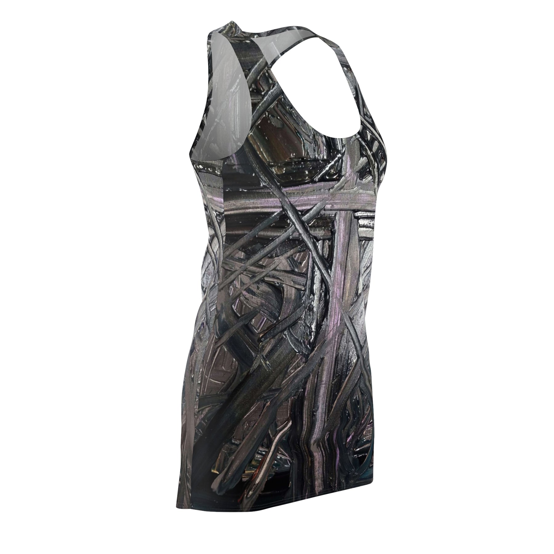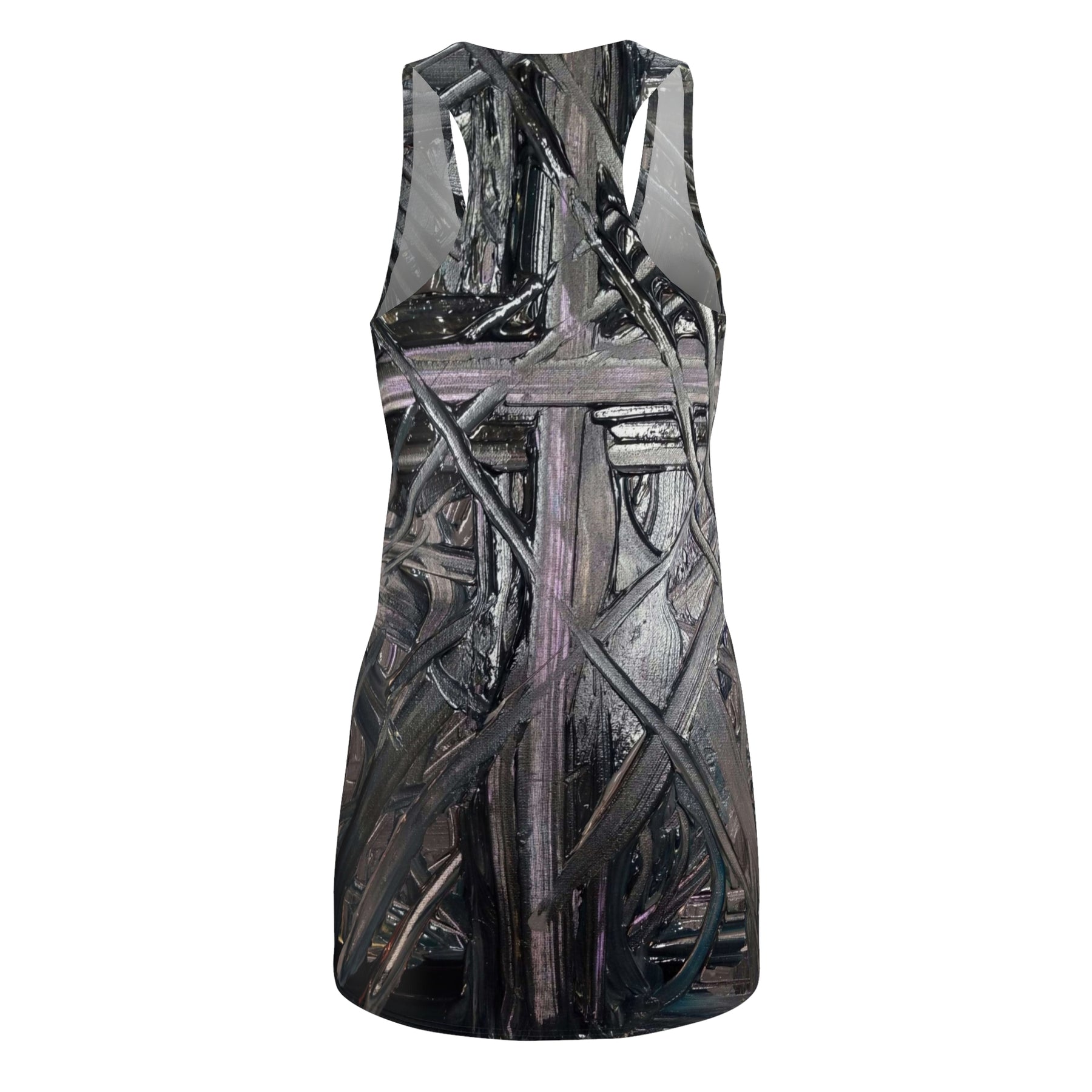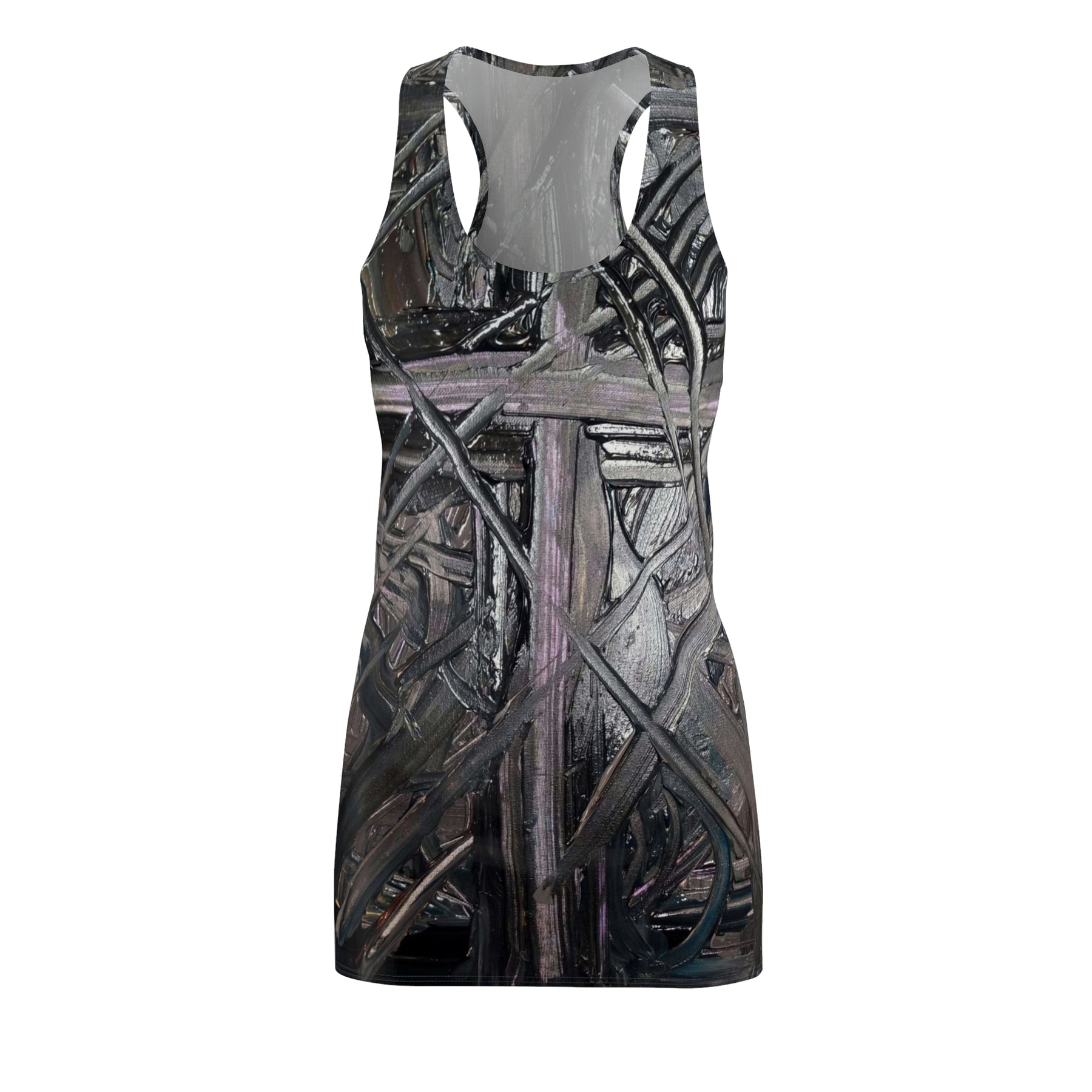 A lightweight racerback dress that blends activewear comfort with dark, sculptural artwork. The all-over print wraps a layered, textured cross motif in muted grays and pewters across a sporty silhouette. Wear it for days when you want mobility without losing an edge — the fabric moves with you, breathes easily, and keeps the printed detail crisp through wear. It sits close to the body with a racerback cut that frees the shoulders and shows off layered jewelry or a simple tank beneath. Slip it on for a gallery night, an urban walk, or when you want an outfit that reads both strong and quietly expressive.