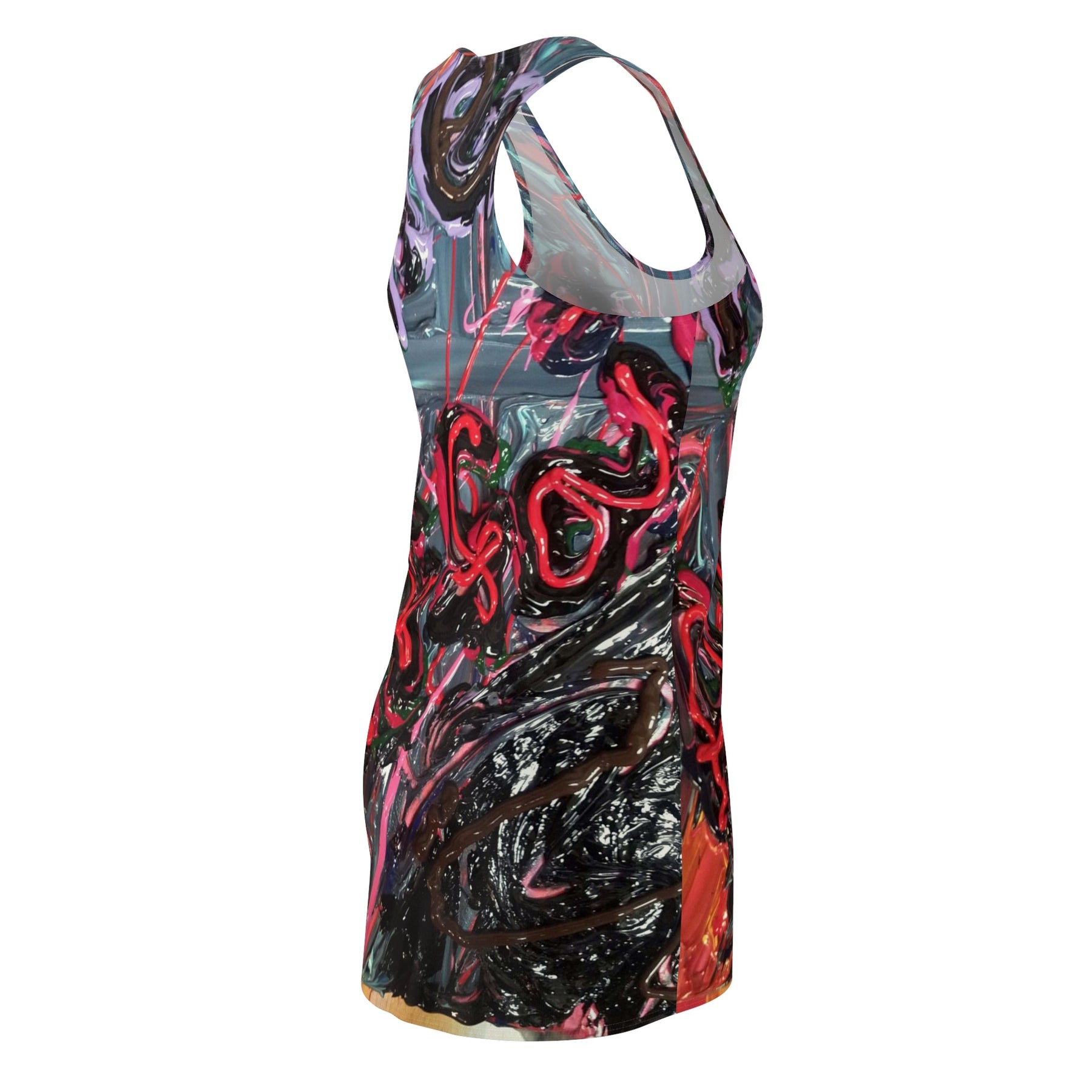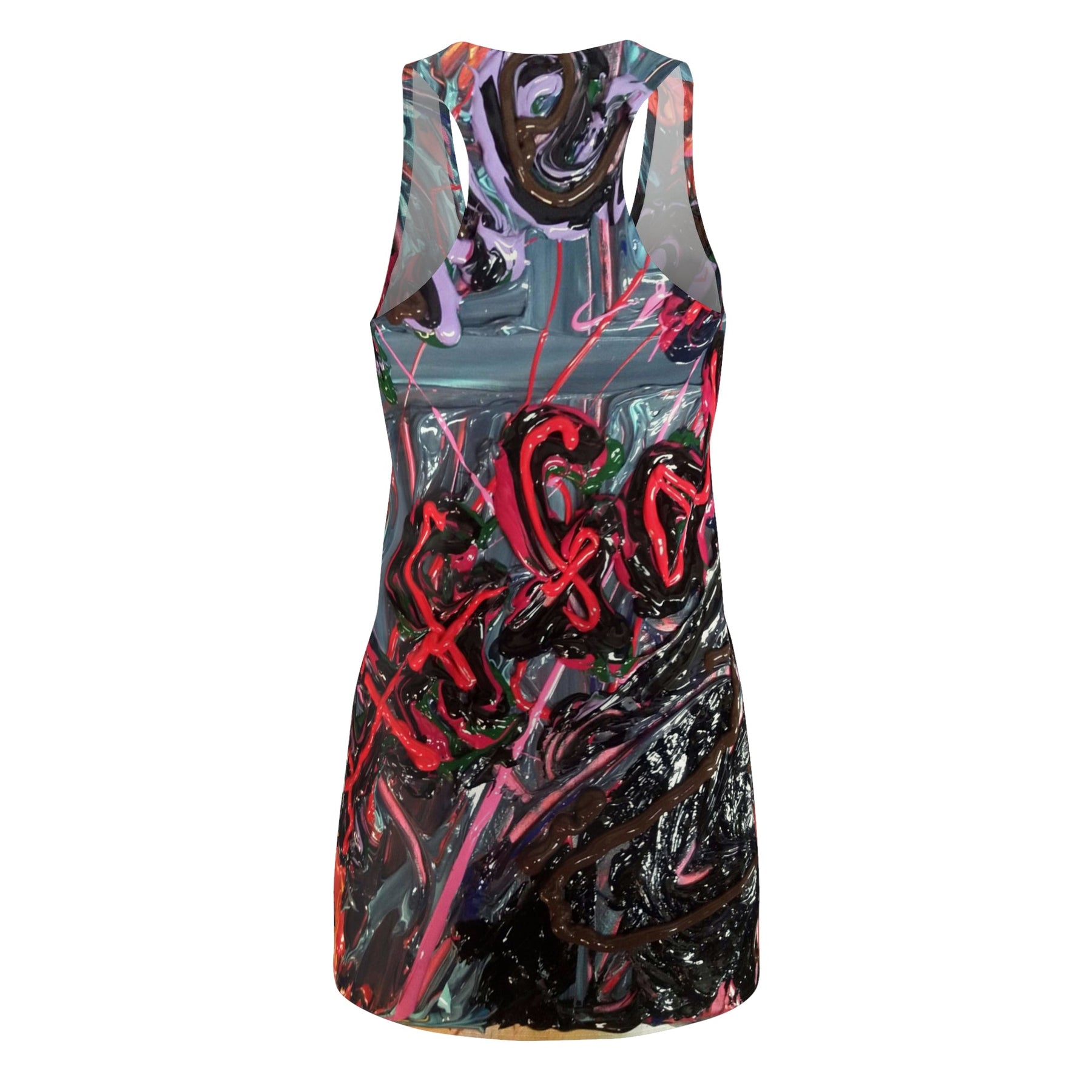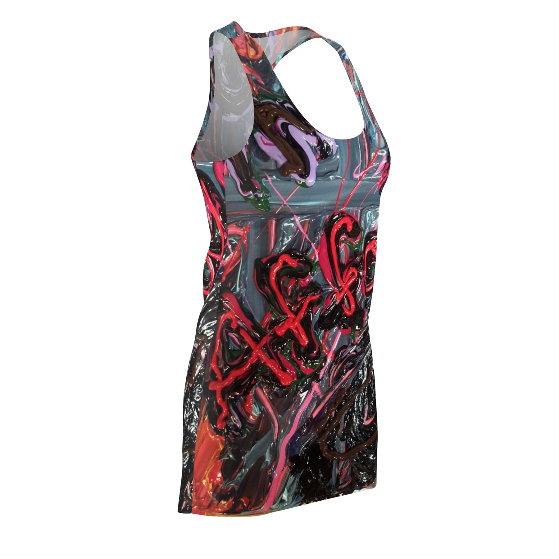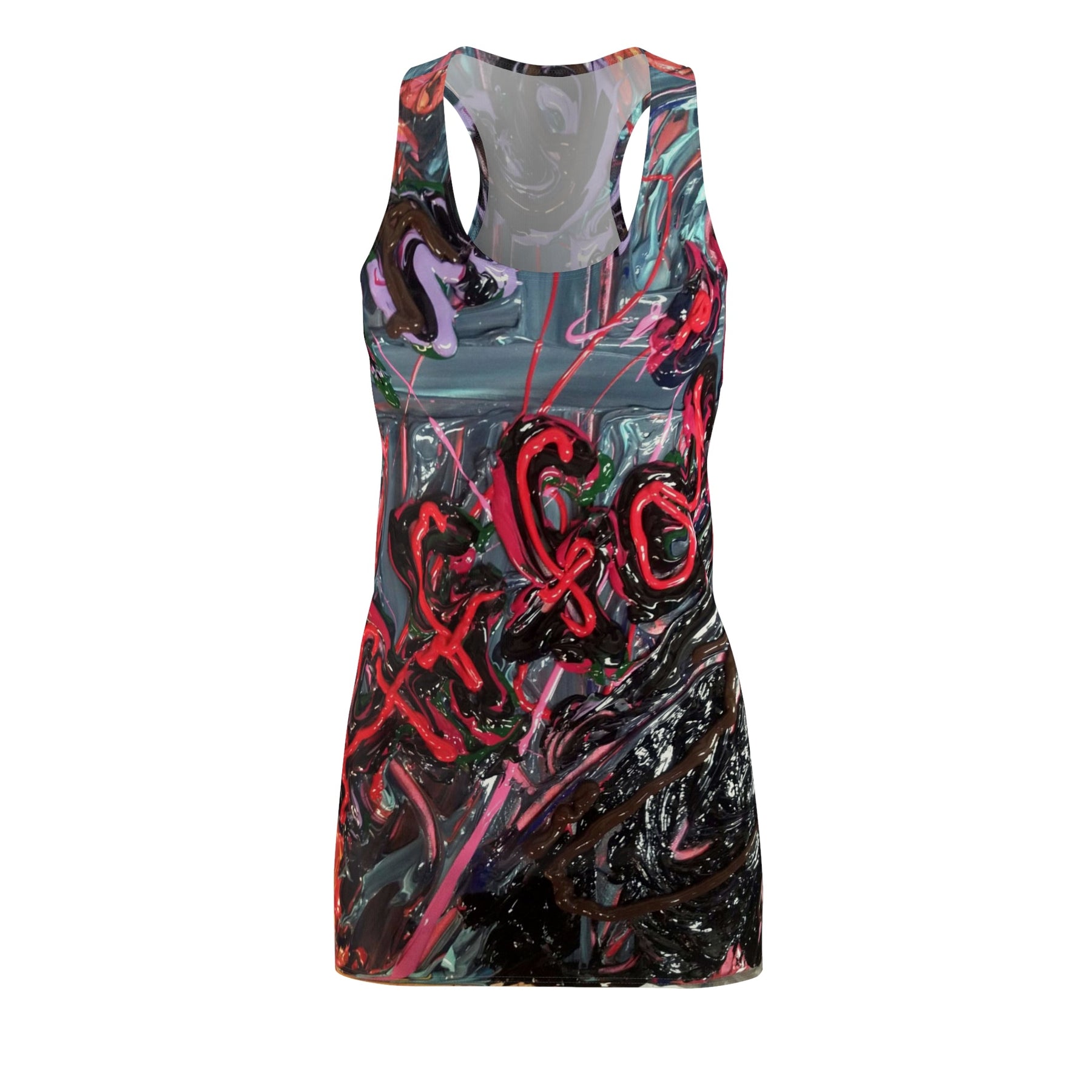 This racerback dress carries an urban, expressive energy — like wearing a piece of street art that moves with you. Vibrant, layered strokes of red, pink, teal and black create a bold, painterly surface that reads like graffiti under glossy varnish. The lightweight, athletic cut sits close to the body and lets the print speak: athletic straps and a racerback silhouette keep shoulders free while the clean side seams and self-fabric binding give the dress a finished, structured look. It dries fast and holds its shape wash after wash, so you can reach for it on hot gallery openings, late-night city walks, or when you want to bring attitude to daytime errands. Breathable and tagless, it feels easy against the skin while the vivid all-over print keeps every angle interesting.