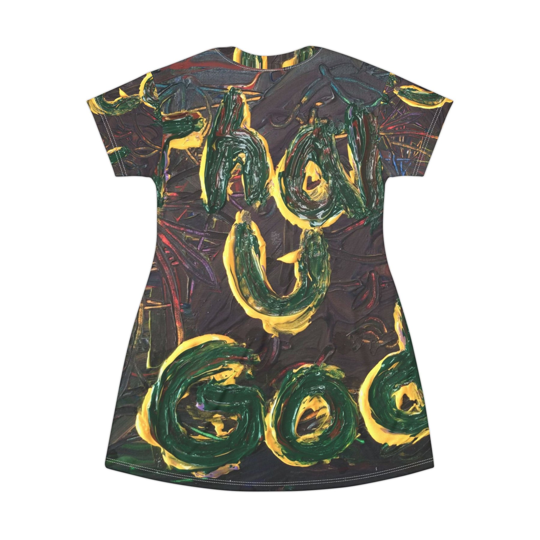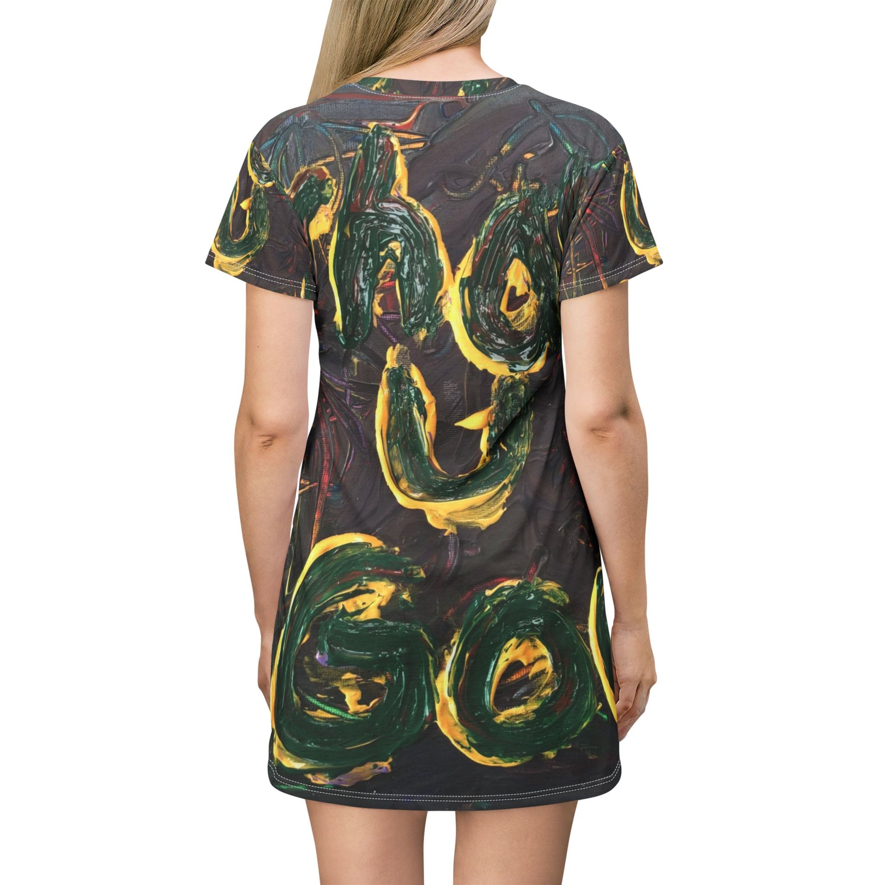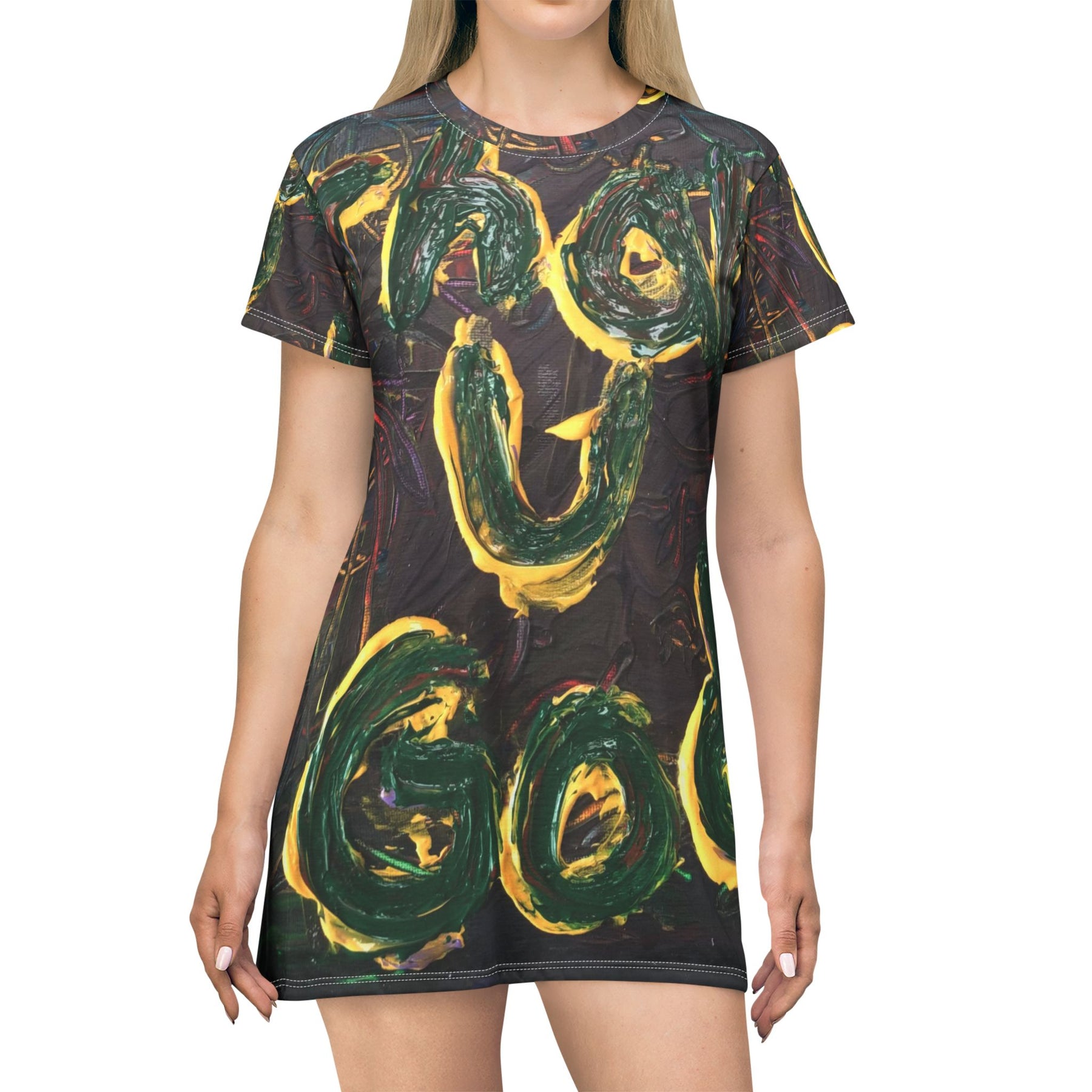 This lightweight dress brings bold, painterly energy into everyday wear. The all-over print features thick, textured strokes in deep greens and warm golds that read like an abstract, expressive canvas. Cut in a relaxed A-line shape, the dress moves easily through the day—breathable polyester keeps the silhouette crisp and quick-drying, while side seams and self-fabric binding give it subtle structure. Wear it layered over leggings for an art-studio morning, or let it stand alone for a gallery night when you want color that speaks louder than words. It feels lived-in without losing its intent: confident, creative, and unapologetically individual.
