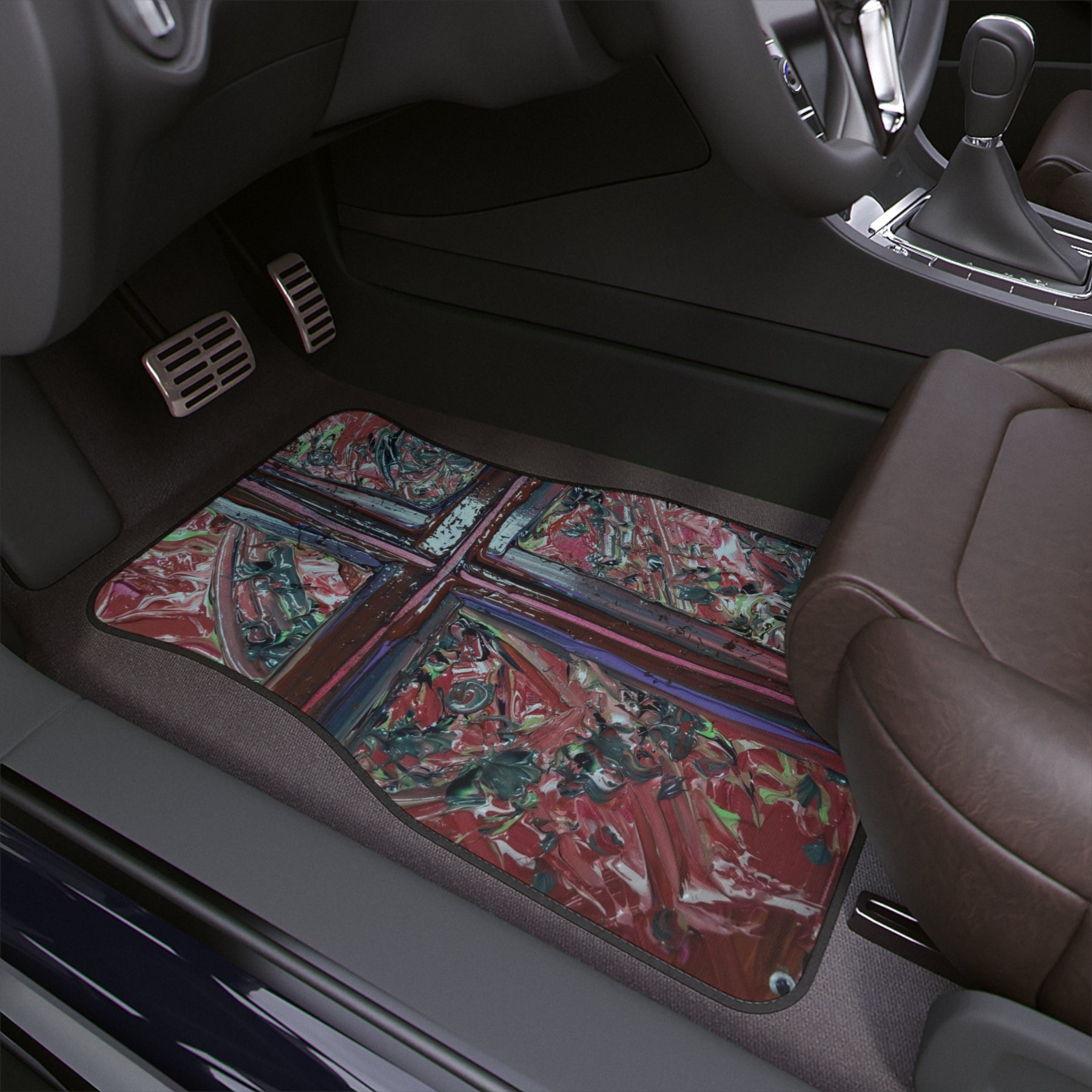 Hand-painted energy for your daily drive. This single-piece car floor mat brings a textured, expressive design to your vehicle — rich reds, layered brushstrokes, and a bold cross-like motif sit against a durable loop-polyester face that takes the wear of shoes and the mess of life without losing its character. The heavy loop pile hides dirt while the rubberized non-slip backing keeps the mat firmly in place. It’s built to handle regular use and to keep its colors bright with modern printing, while showing a handcrafted, painterly personality that complements vintage interiors, artist-run studios, and drivers who prefer vehicles that feel lived-in and individual.