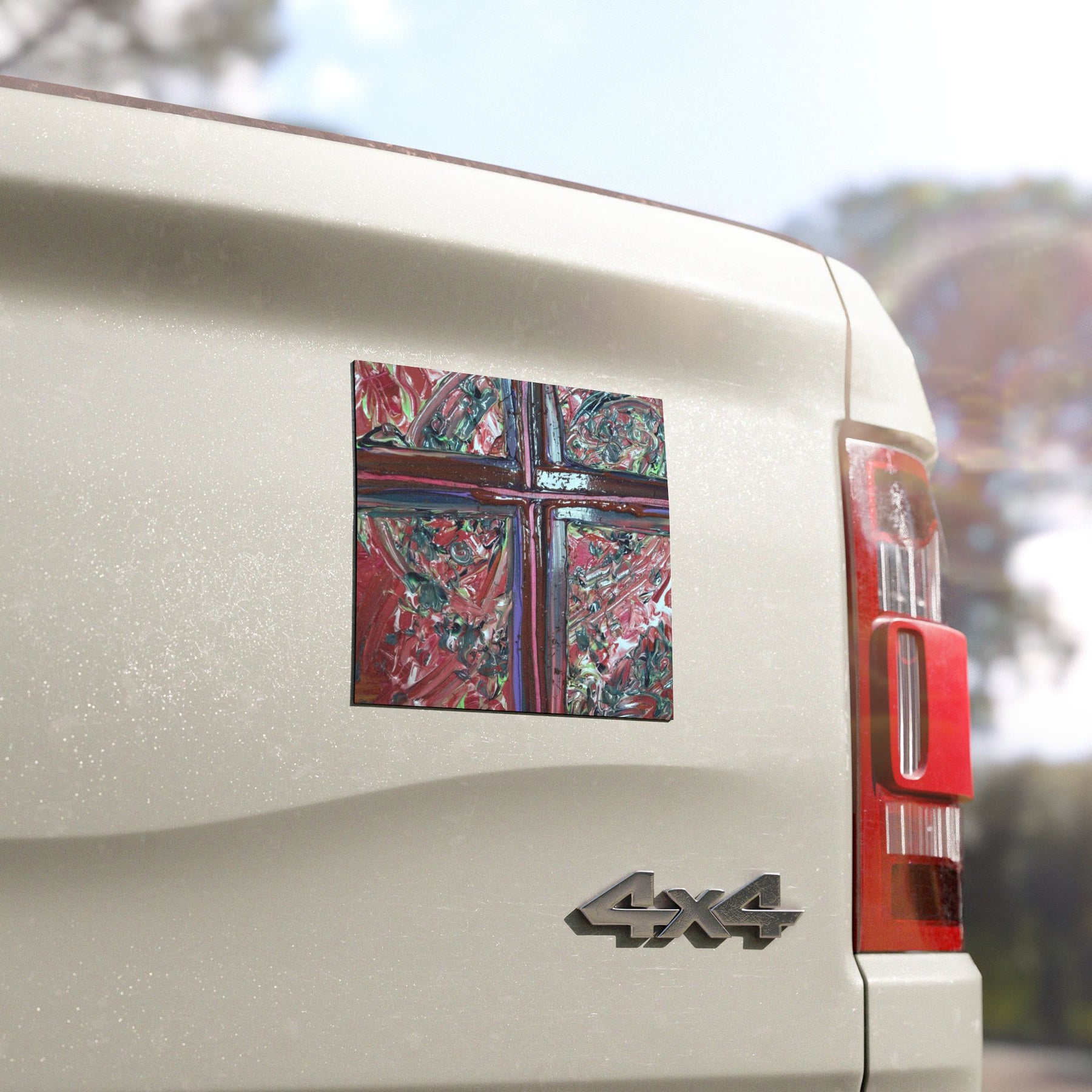 These vibrant car magnets bring a bold, textured art piece to your everyday drive. Painted-like swirls of deep reds, purples and greenish accents converge behind a cross-like division, creating a striking, tactile impression that reads like a miniature gallery on your vehicle. The matte white base gives colors a subtle, contemporary softness while the black magnetic backing keeps the piece firmly in place. Weather-resistant vinyl and direct-to-print color mean the image stays lively through rain and sun, making this an expressive accent for commuters, artists, and anyone who likes their car to reflect a creative spirit.