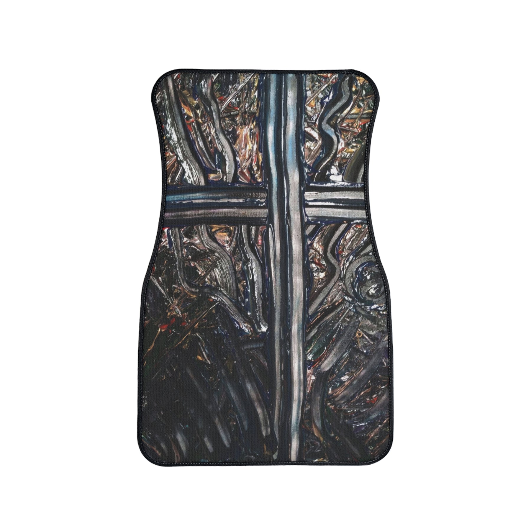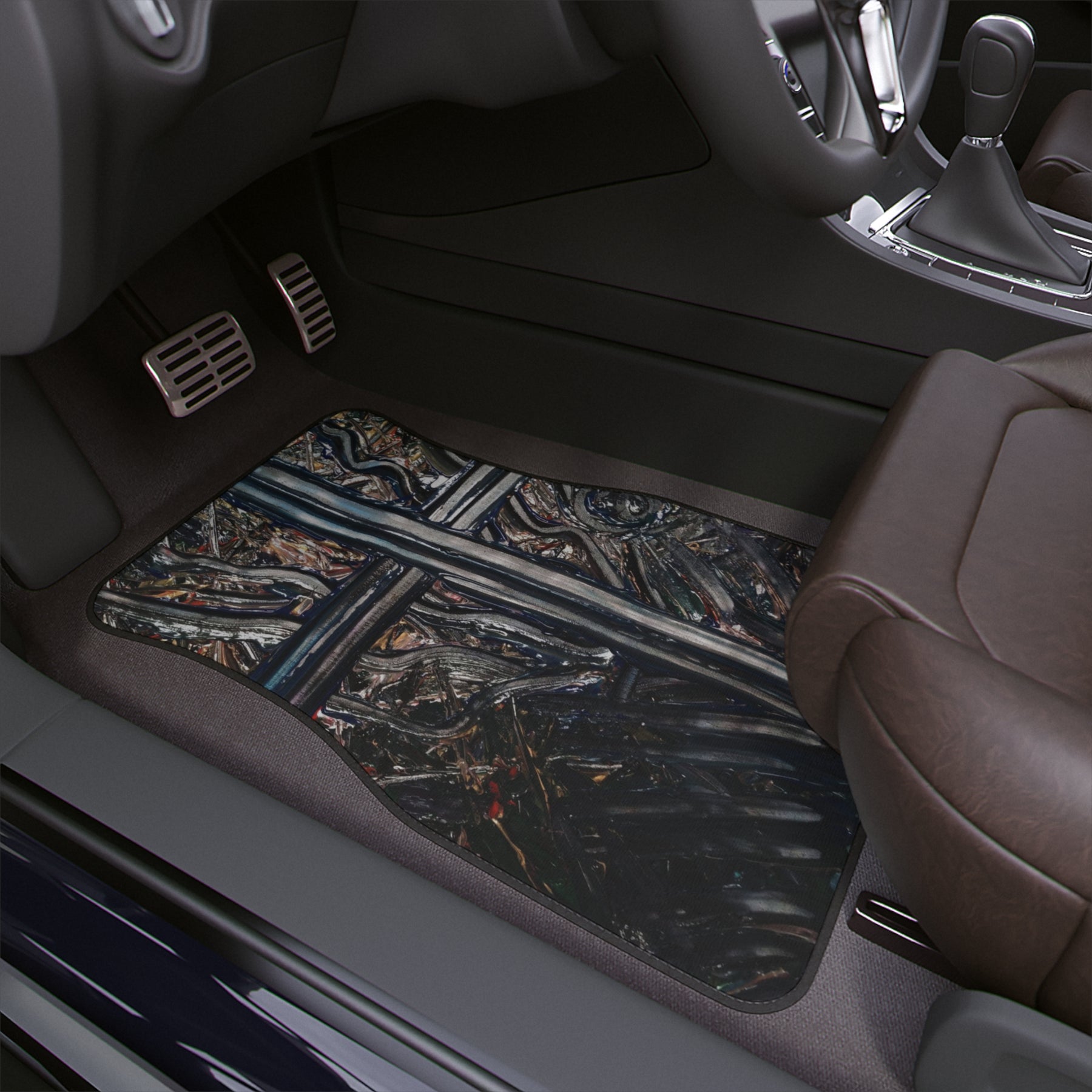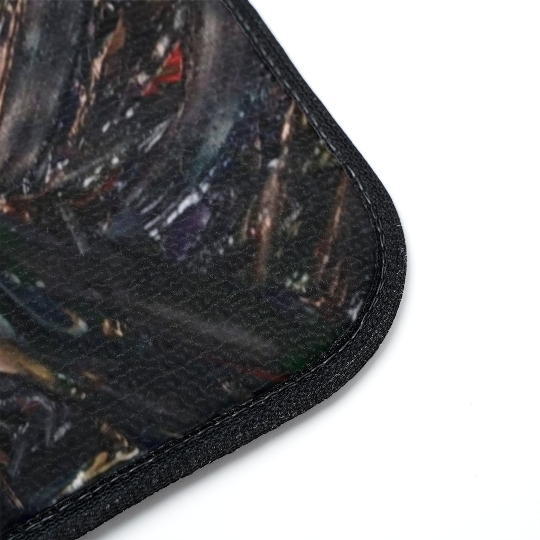 These car floor mats bring rugged character and protection to your ride. The dense 20oz loop polyester pile resists wear while the textured rubber backing locks each mat in place so it stays where you put it. The printed surface carries a moody, artful pattern with deep tones and painterly marks that hide dirt and scuffs—great for drivers who prefer a lived-in, expressive aesthetic. Choose front or rear sizing to match your seating layout; mats arrive assembled in the USA from globally sourced parts. Small production quirks like a white underbase visible when bent or slight print placement shifts are part of the process and won’t affect durability.