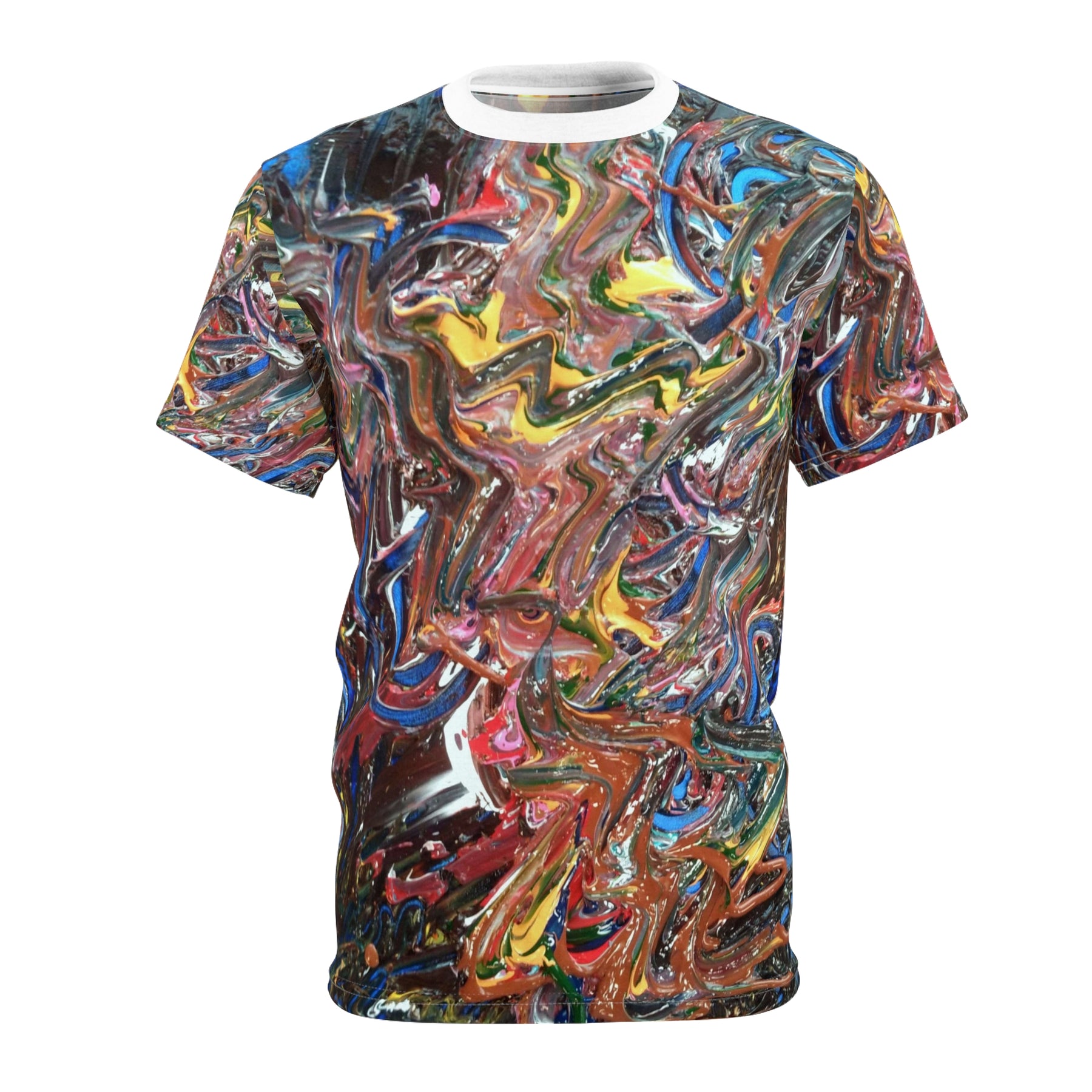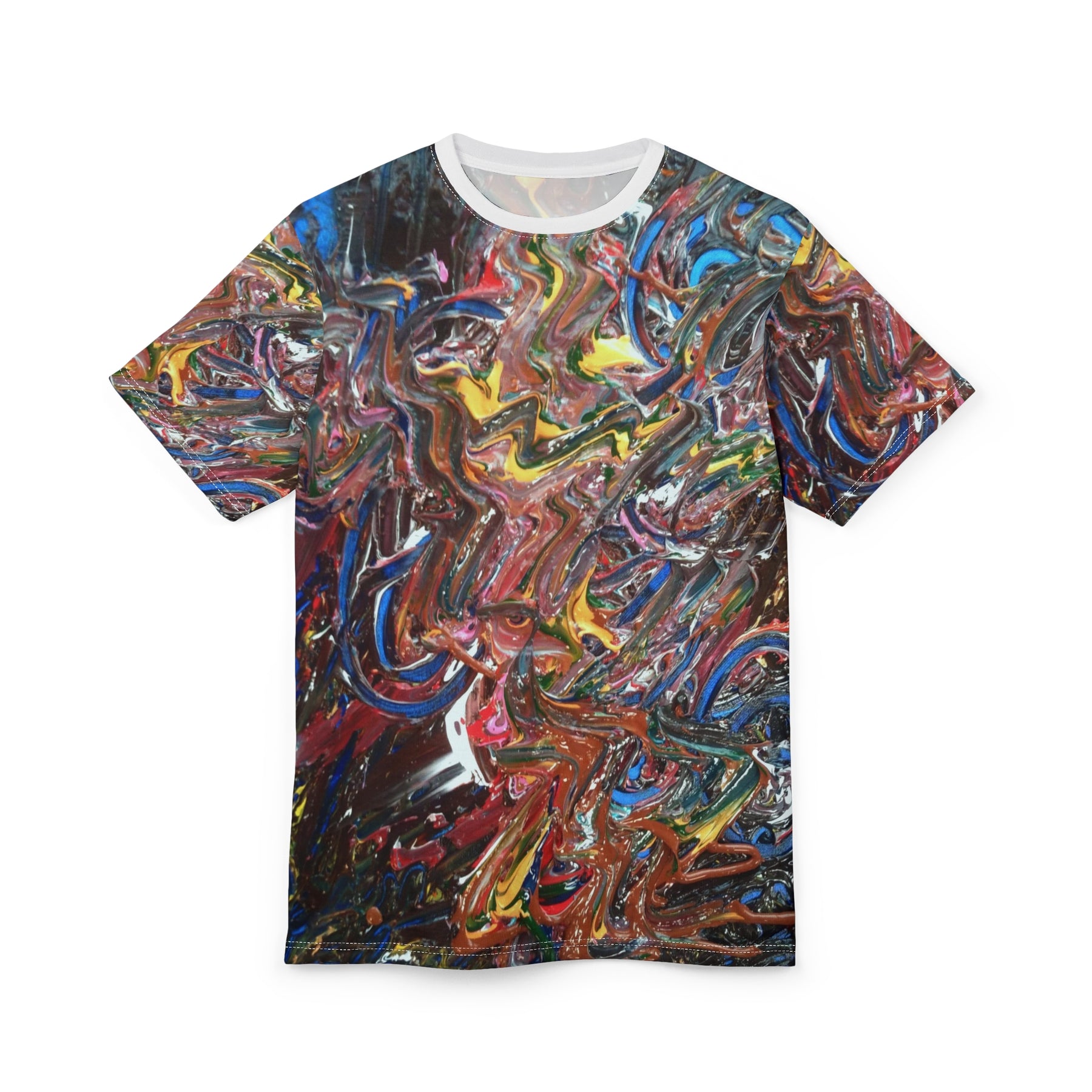 This all-over print tee captures the rush of color and texture from an expressive abstract painting. Swirls of deep blues, molten gold, brick red and hints of white flow together across the front and back, creating an energetic, wearable canvas that moves with you. Lightweight and quick-drying polyester keeps the print vibrant and the fit consistent wash after wash. Wear it to gallery nights, creative meetups, or days when you want your outfit to feel like a statement — not loud, but confidently alive.