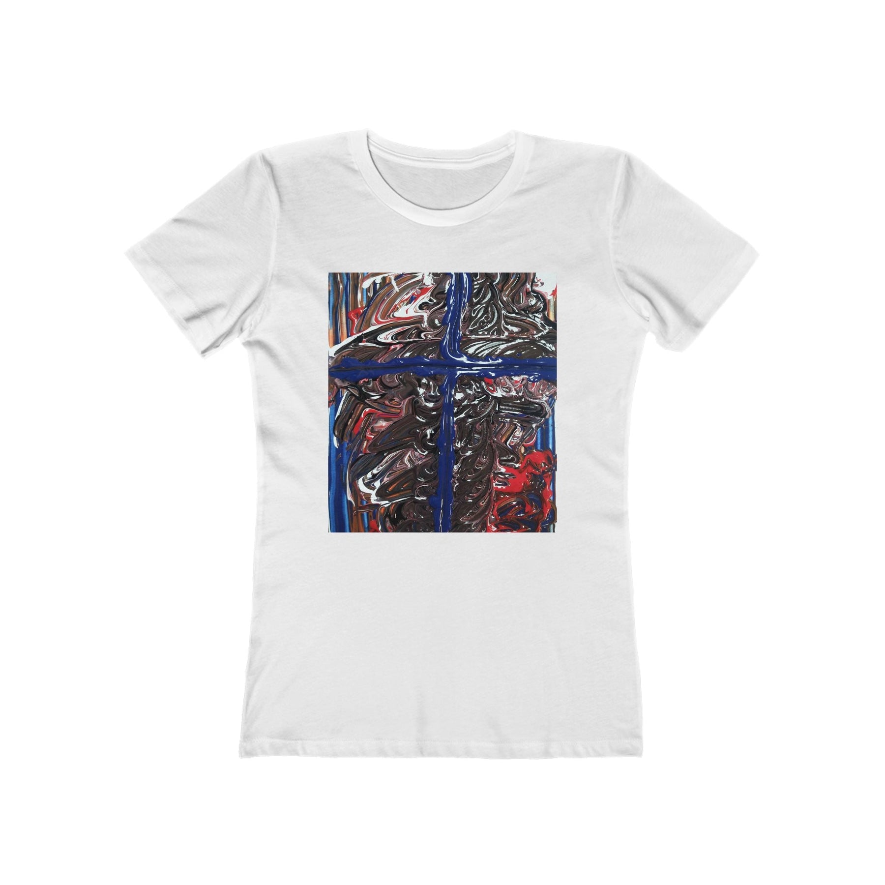A slim, longer-length tee that feels like a borrowed favorite — light and smooth against your skin with a bold, painterly square print on front and back. The abstract artwork reads like quick brushstrokes in deep blues, reds and earthy neutrals framed by a cross-like division, giving the shirt an art-studio, gallery-walk energy. Wear it as a relaxed layer for city wandering, late-night shows, or when you want an effortless statement that reads handcrafted rather than loud. The soft, combed ring-spun cotton and thoughtful construction (side seams, shoulder tape, ribbed collar) keep the tee feeling tidy and lived-in after many wears and washes. It runs slightly small and has a slim cut with longer body length — choose the size that matches your preferred fit if you like more room.