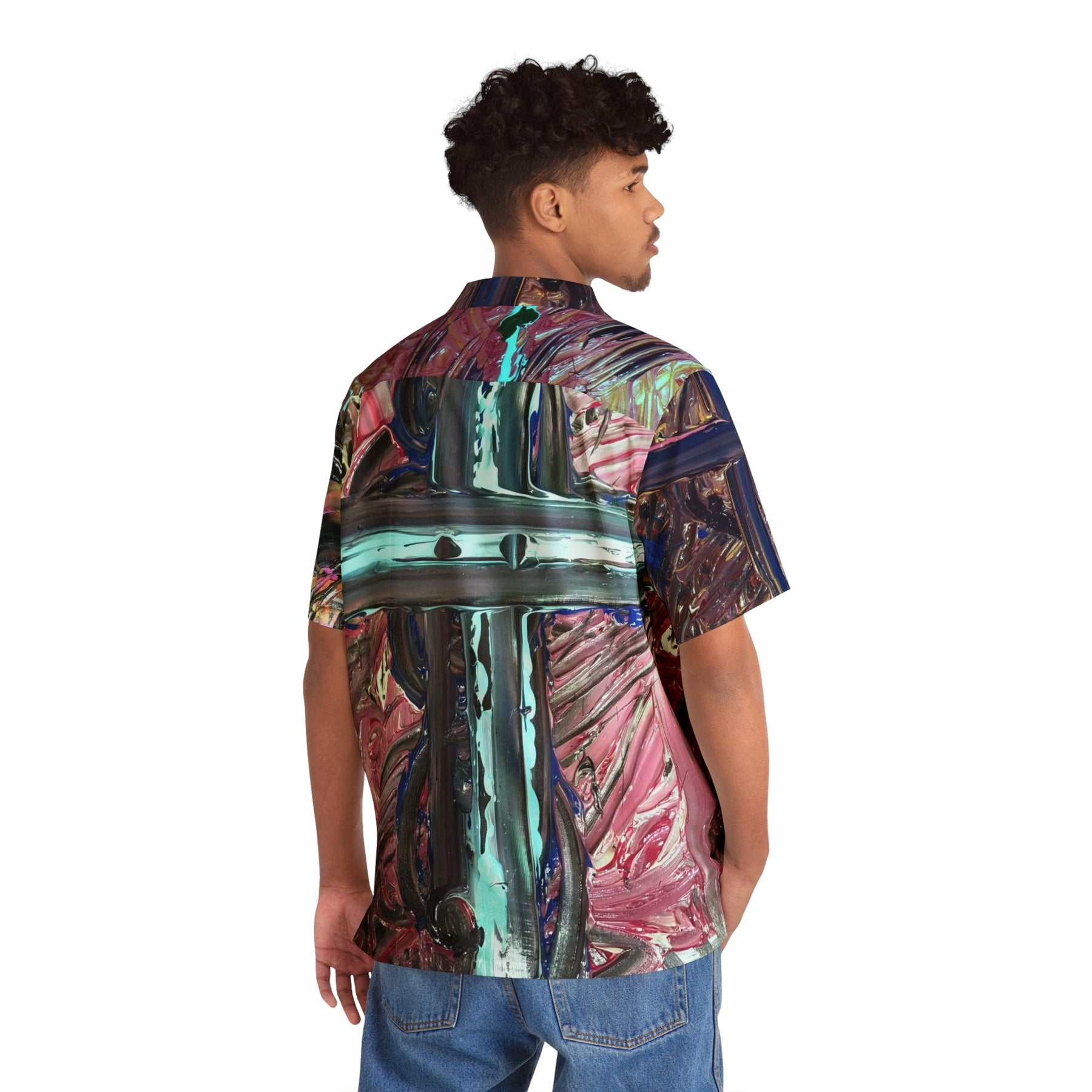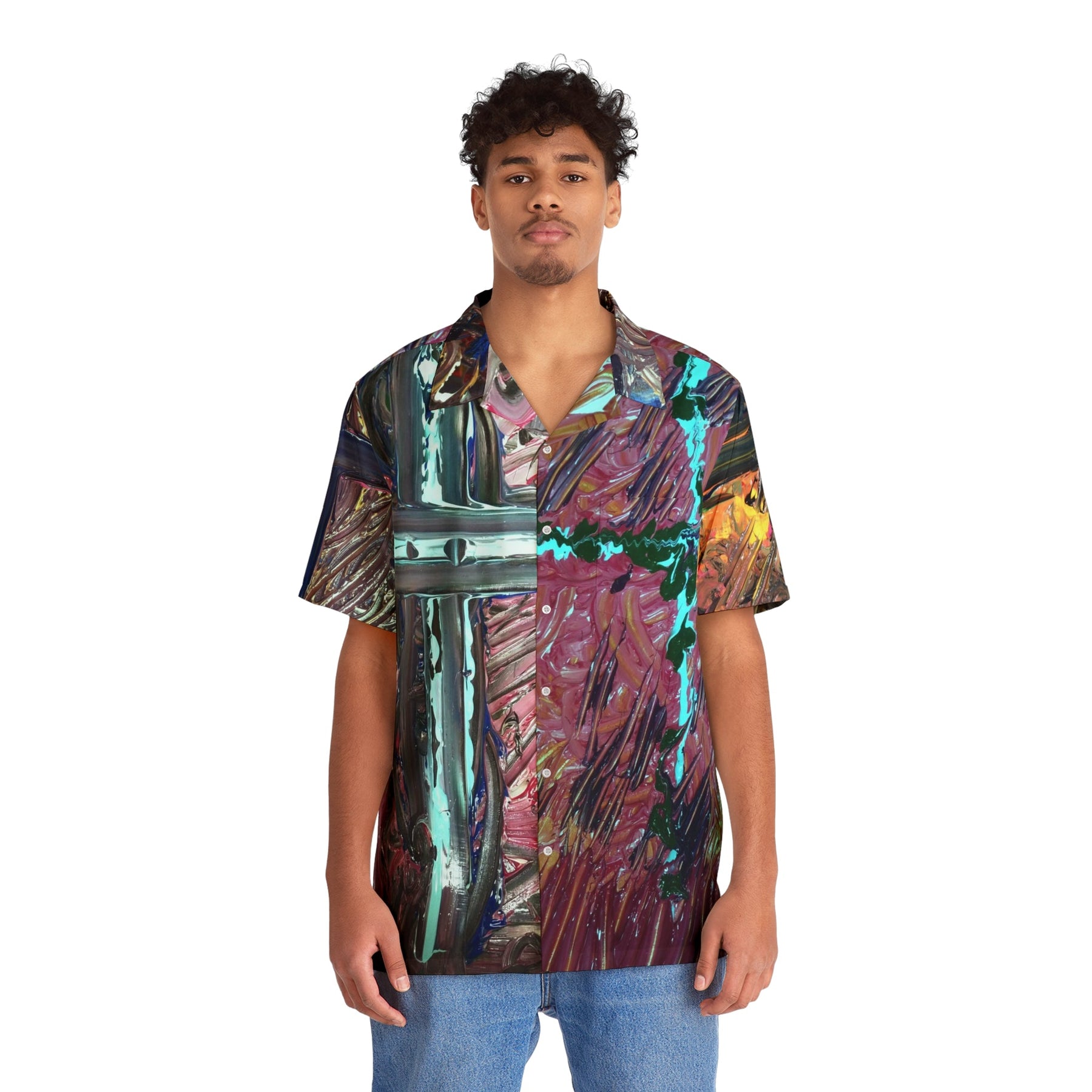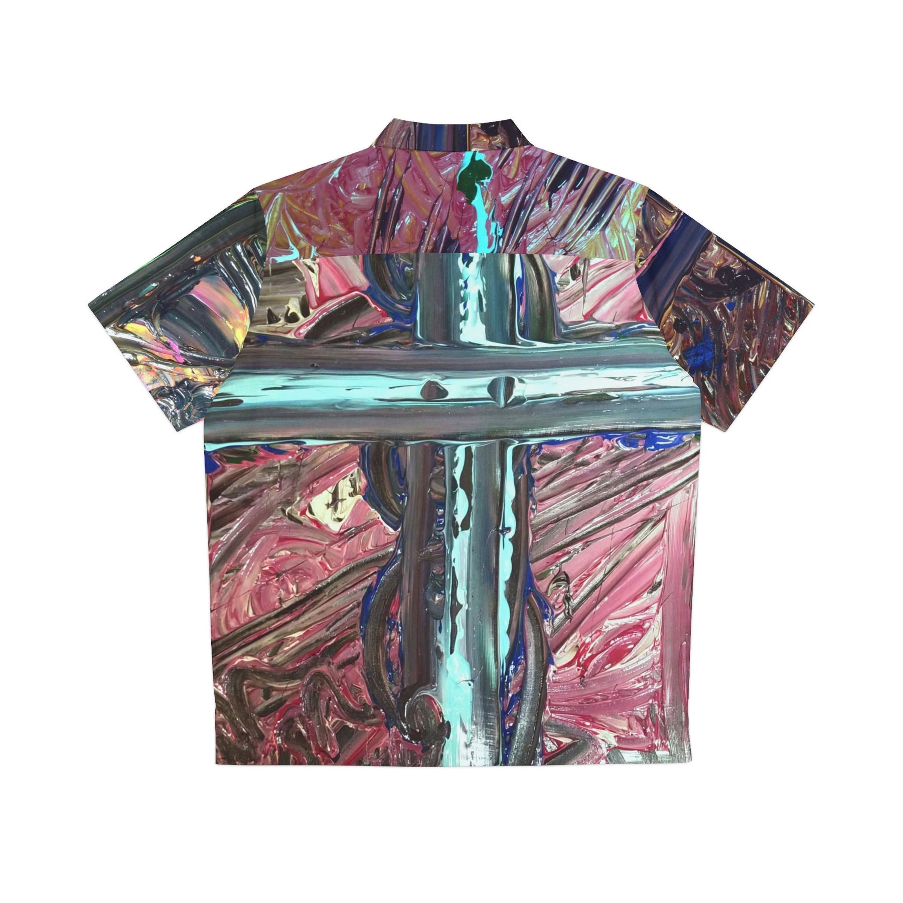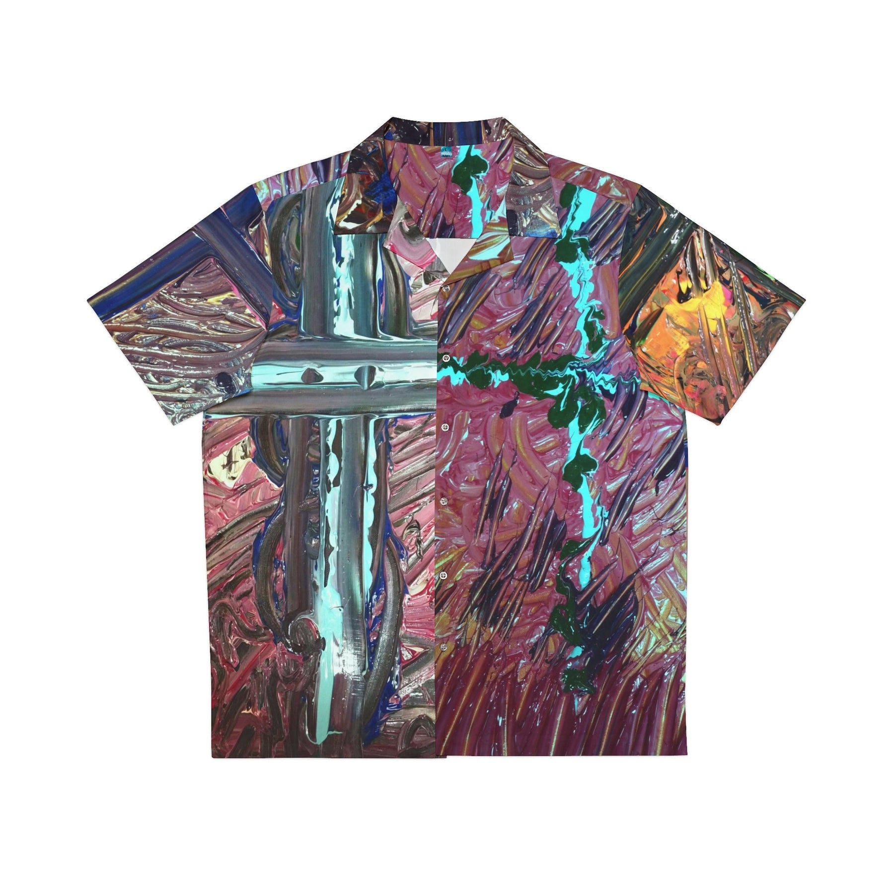 This relaxed Hawaiian shirt channels a lively, painterly energy—like wearing a bold canvas that moves with you. The all-over print blends metallic teal strokes and warm rose tones, creating a glossy cross motif that catches the eye from every angle. Lightweight with a boxy cut and a notch lapel, it drapes easy over shorts or linen trousers and keeps things breezy on sunlit porches, gallery openings, or seaside walks. The roomy chest pocket and full-button front add practical comfort without stealing the visual show. It’s the kind of shirt you reach for when you want to stand out quietly: artful, tactile, and ready for long afternoons and late-night conversations.
