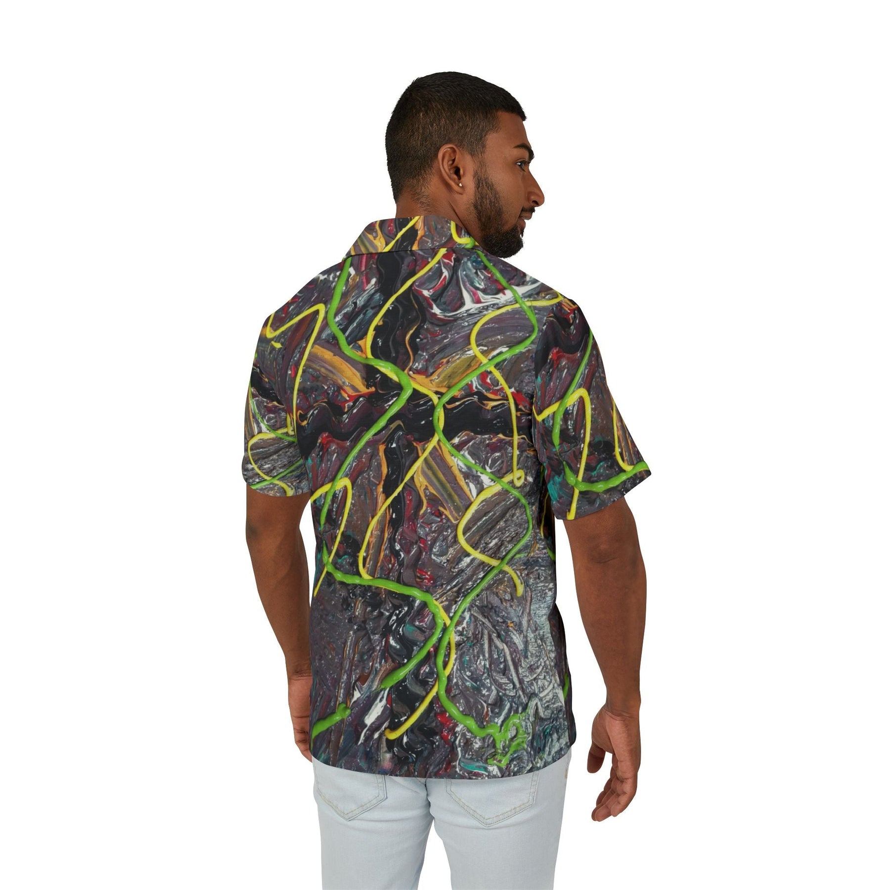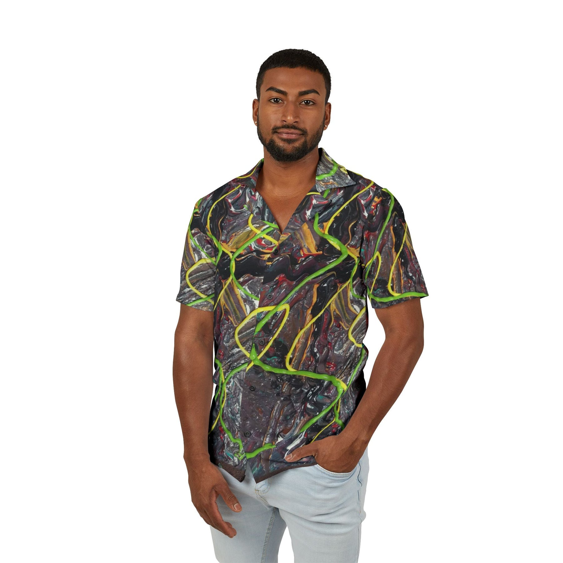 This lightweight Hawaiian-style camp shirt brings bold, painterly energy to warm-weather days. Vivid neon lines weave across a moody, textured backdrop, turning the entire shirt into a moving canvas. The linen-like surface and breathable polyester make it feel airy against the skin while the button-front silhouette keeps the look relaxed and easy. Wear it on afternoon drives, night markets, or backyard gatherings — it reads like wearable street art that holds up to humidity, travel, and long evenings.