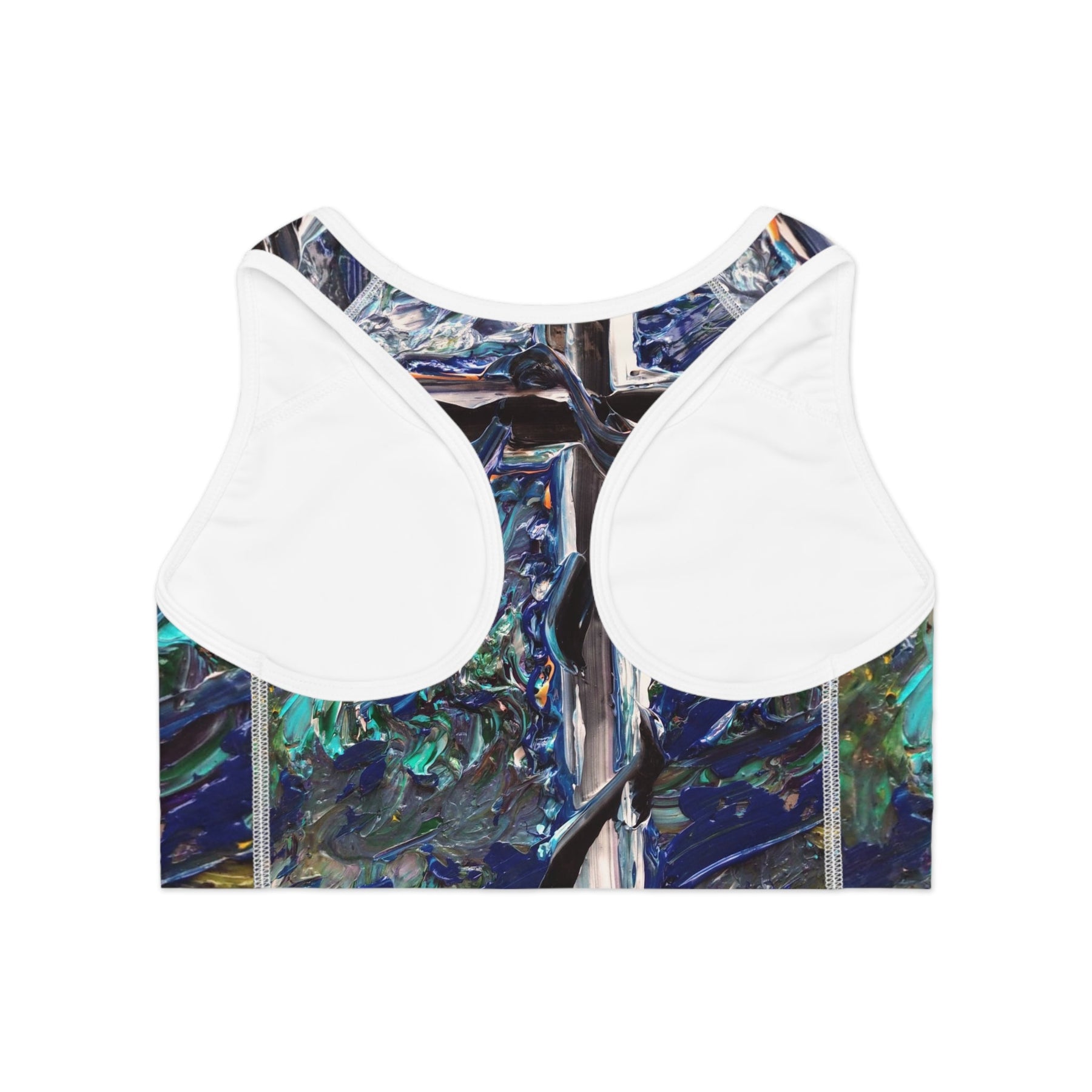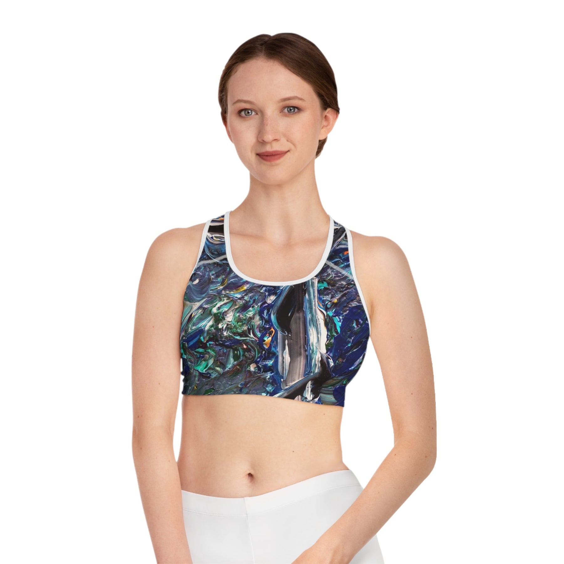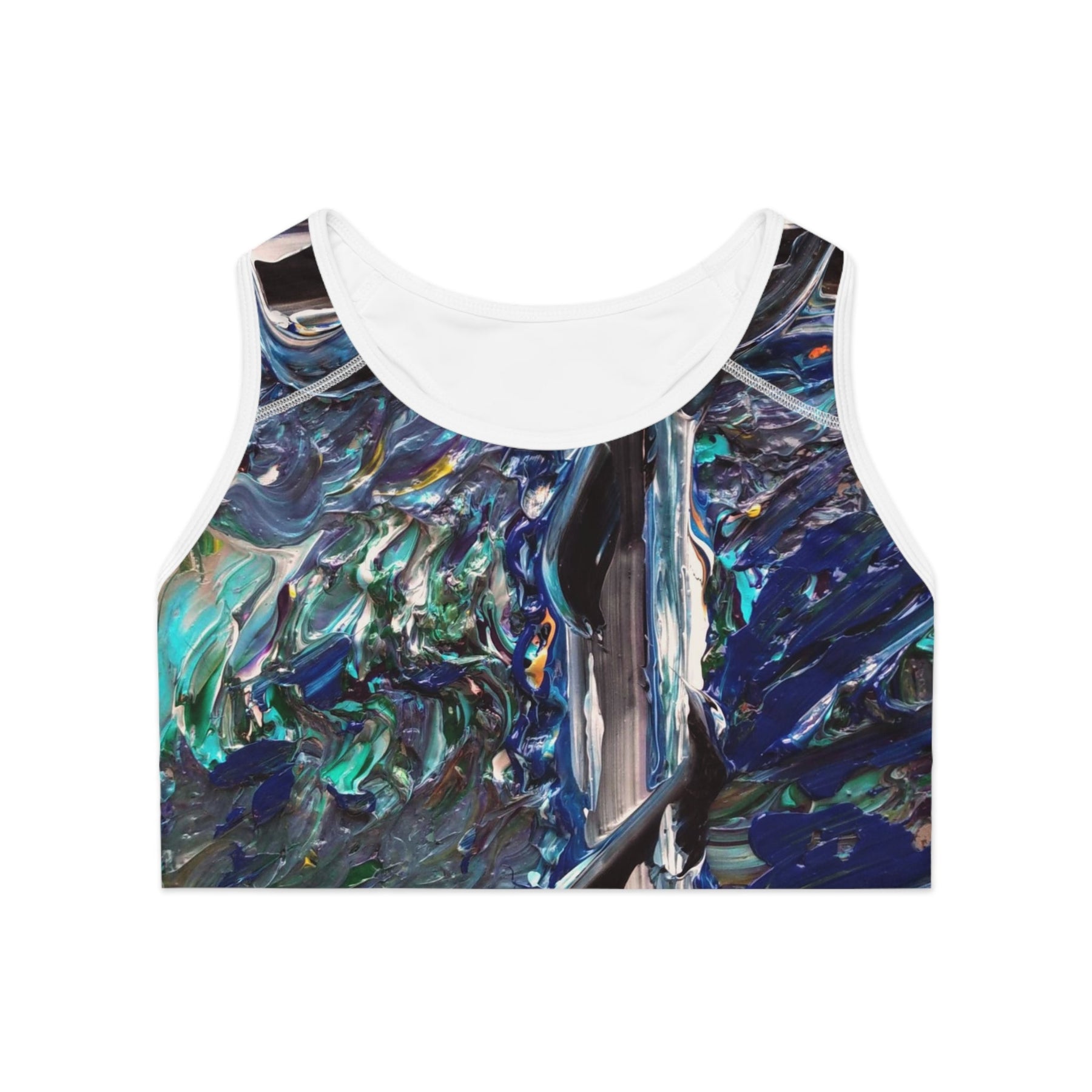 A vibrant, art-driven sports bra that brings painterly texture to your workout. The all-over print captures deep oceanic blues, teal highlights, and thick impasto strokes for a look that feels like wearing a small abstract canvas. The compression fit and double-layer front give steady support while moisture-wicking polyester keeps you cool through sweaty runs, yoga flows, or studio circuits. Wide elastic and reinforced shoulder straps hold everything in place without digging in. Lightweight but structured, it moves with you and lets the design stay bold session after session.