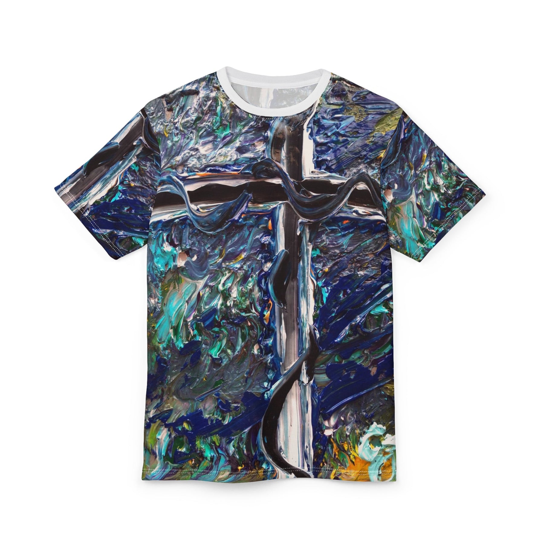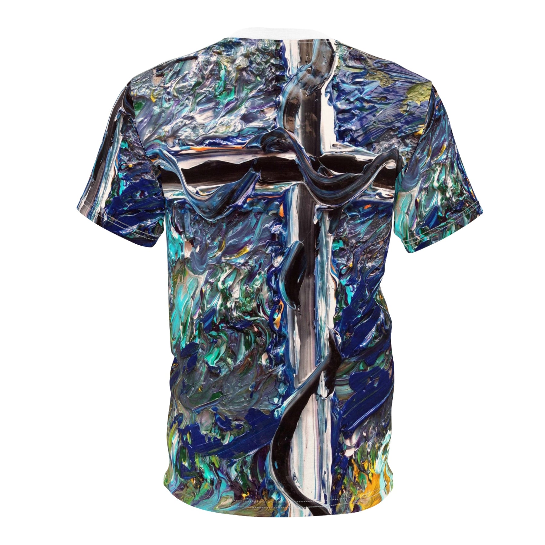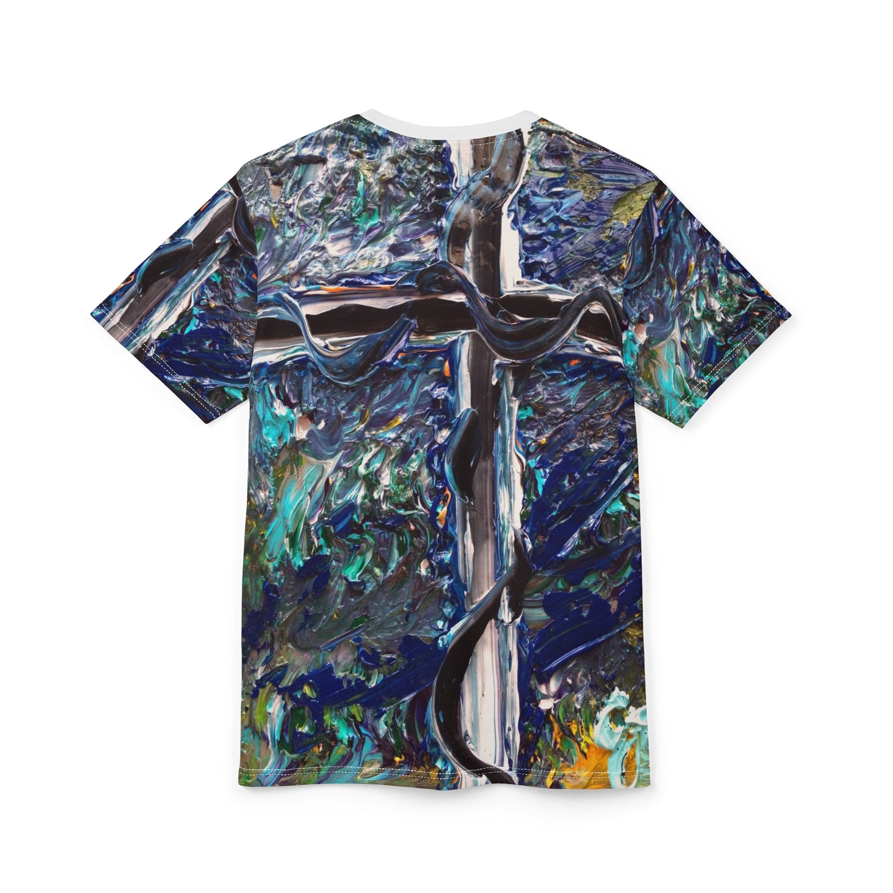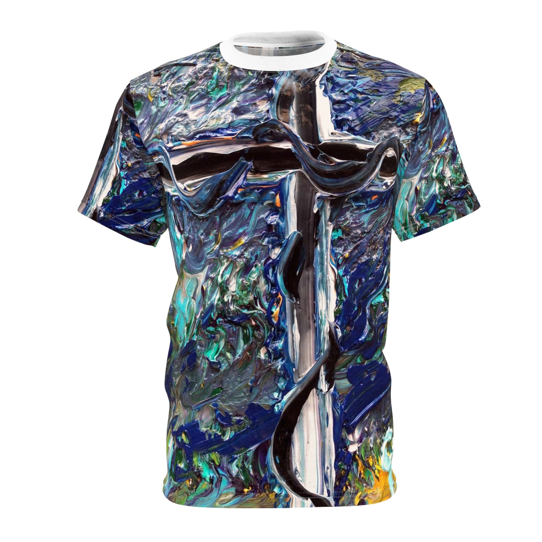 This all-over print tee wears like an artist’s statement — bold, textured, and alive. The swirling blues and sea-green strokes wrap around a strong, sculpted cross motif that feels both reverent and raw. Lightweight polyester keeps the colors vibrant and the print uninterrupted from front to back, so the shirt reads like a single continuous painting rather than a stitched panel. Wear it when you want your outfit to start a conversation: at gallery nights, creative workshops, or slow evening walks where the city lights catch each glossy brush mark. It sits cleanly on the body with a regular fit and ribbed collar, so the look stays intentional whether layered under a denim jacket or worn solo.