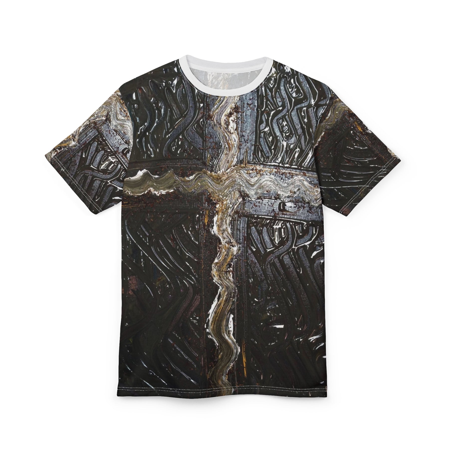 This all-over print tee carries a gritty, tactile aesthetic—dark, weathered textures form a bold cross motif that feels equal parts industrial and ritual. The shirt sits comfortably in everyday wear: lightweight, quick-drying polyester that keeps the print vibrant and details sharp. Wear it when you want your look to read like a map of well-worn places—street corners, music venues, late-night drives—without saying a word. The regular fit and tagless finish make it easy to layer or wear solo, while the ribbed collar and shoulder tape hold the shape through repeated wear. For anyone drawn to urban relics, reclaimed surfaces, and artful darkness, this tee blends visual grit with dependable construction.