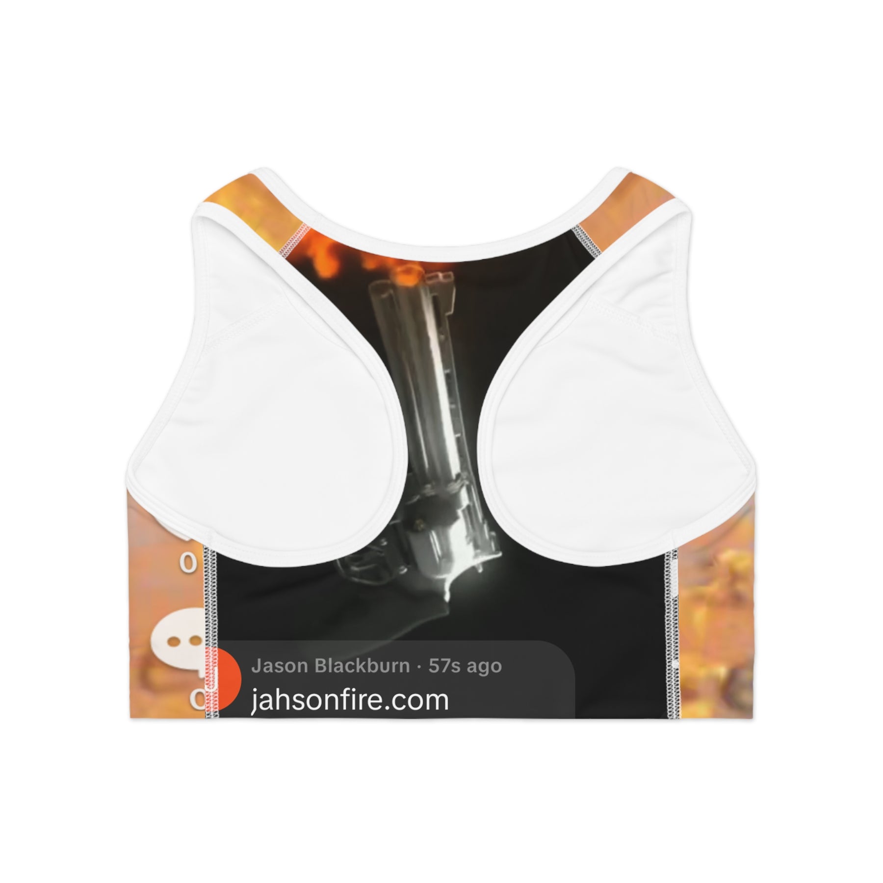This sports bra blends functional performance with a bold, story-driven print. The all-over design layers warm, fiery hues with a close-up of printed words, creating a piece that feels both intimate and energized. Made from a moisture-wicking polyester-spandex blend and offering compression fit with a supportive double-layer front and wide elastic band, it holds steady through runs, HIIT sessions, or strength days. The racerback silhouette and tear-away neck label keep comfort unobtrusive, while the vibrant print turns a workout staple into a statement. Wear it under a loose tank for layered gym looks or on its own when you want your movement to match your mood — focused, warm, and quietly defiant.