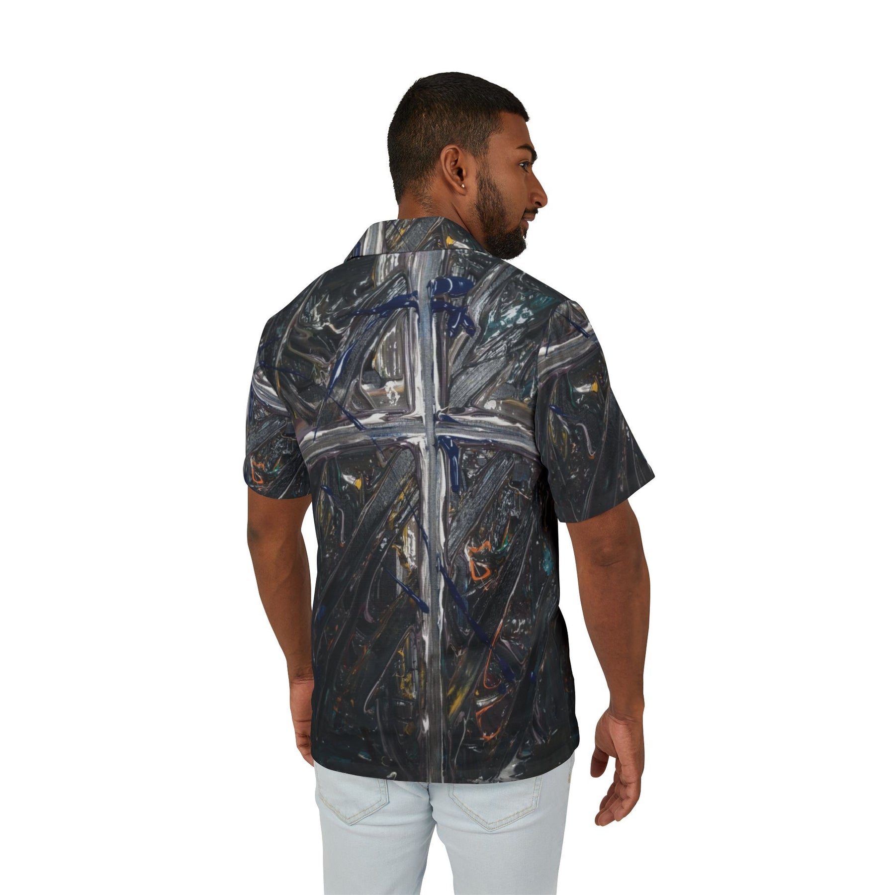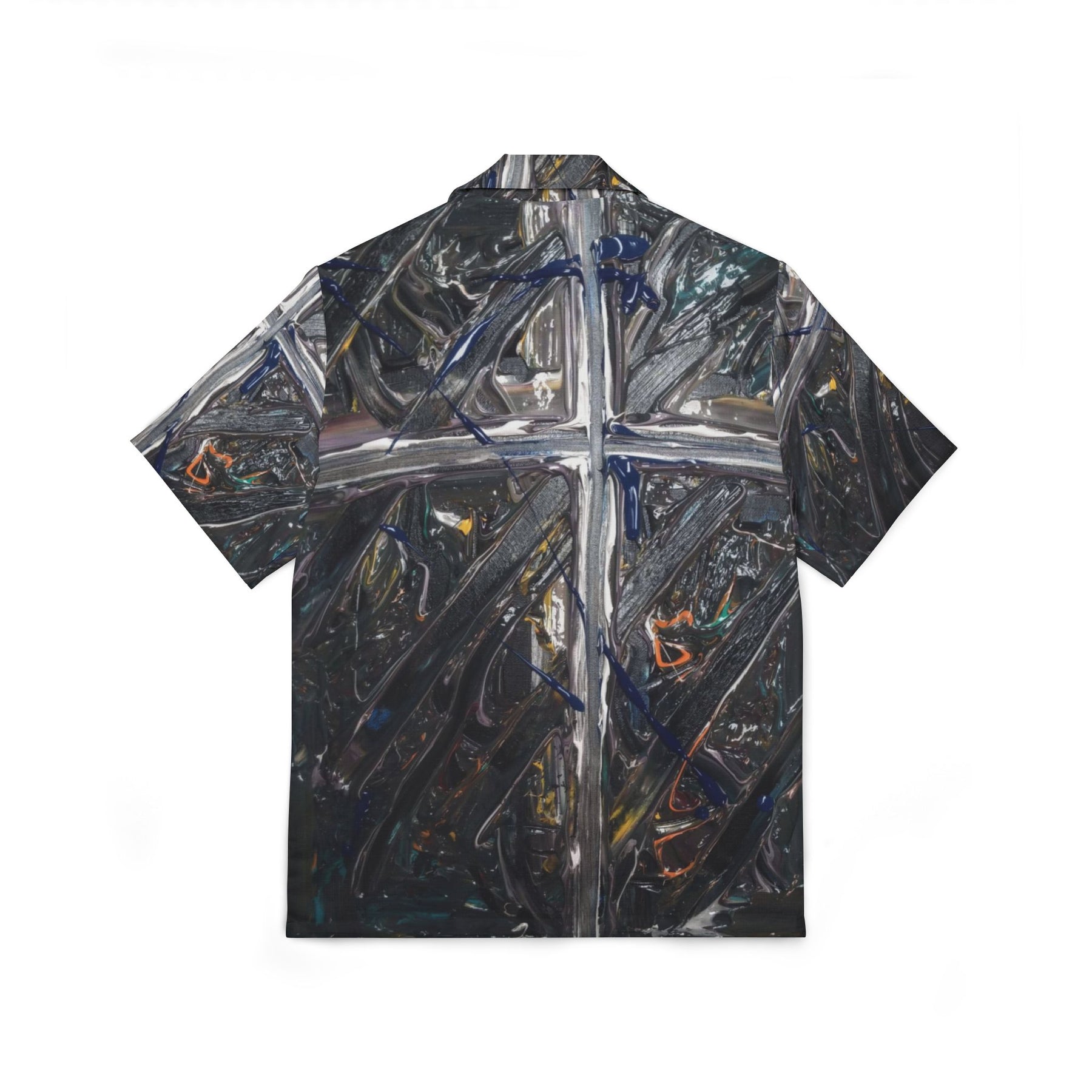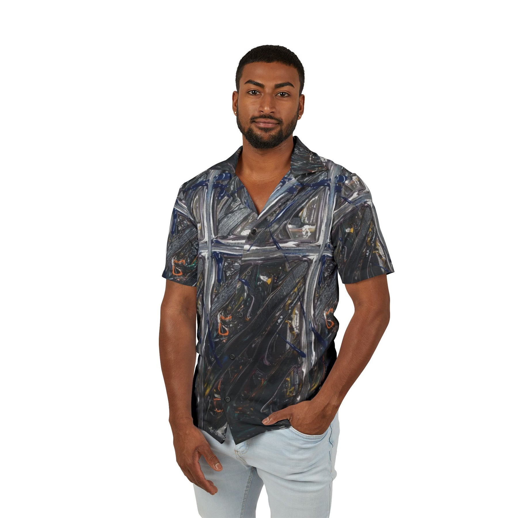 This lightweight Hawaiian-style camp shirt brings moody, painterly texture to warm days and late-night bonfires. The all-over print wraps the shirt in deep charcoal brushstrokes crossed by lighter, metallic lines that catch the eye without shouting—a subtle, artful look for someone who prefers atmosphere over flash. The linen-like surface and breathable polyester keep you cool while the button-front silhouette slides easily between laid-back beach evenings and drinks on the patio. Wear it with worn denim or linen shorts when you want clothing that reads like a canvas: quietly composed, slightly mysterious, and comfortable enough to live in all summer long.