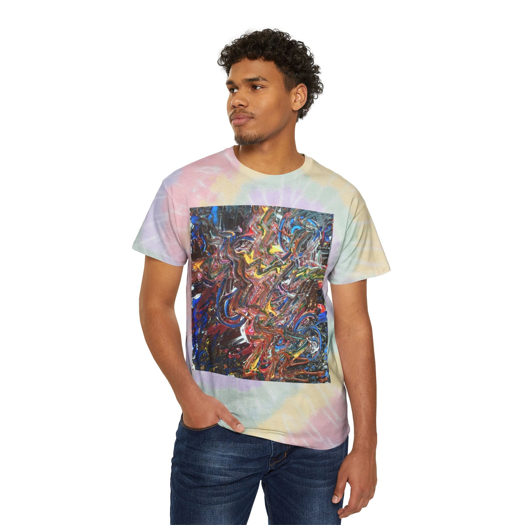 This soft, classic-fit tee brings back the free-spirited energy of handmade dye and painterly chaos. A pastel spiral tie-dye base — faded pinks, buttery yellows, mint, and lavender — cradles a square of dense, abstract paint swirls at the center. The result feels like stumbling on a midnight studio session: paint still wet, colors colliding, and everything warm from the hands that made it. Wear it to art nights, record-store hangs, or slow weekend walks. It layers easily under a denim jacket or stands alone with worn-in jeans. The shirt ages with you: the cotton has substance but breathes, and each dye run has subtle shifts so no two are exactly the same. This tee suits someone who loves tactile, artisanal looks and wants clothing that reads like a snapshot from their creative life.