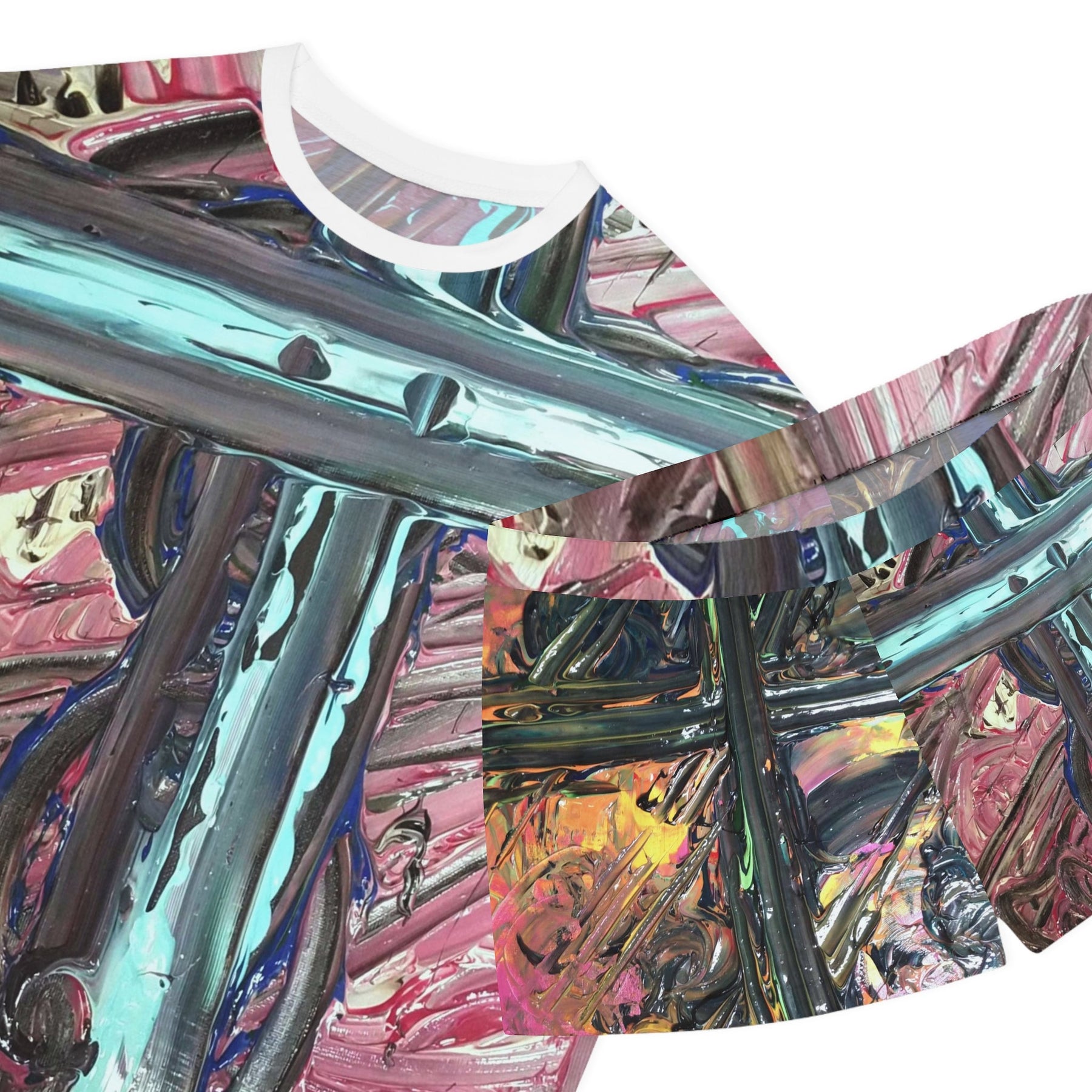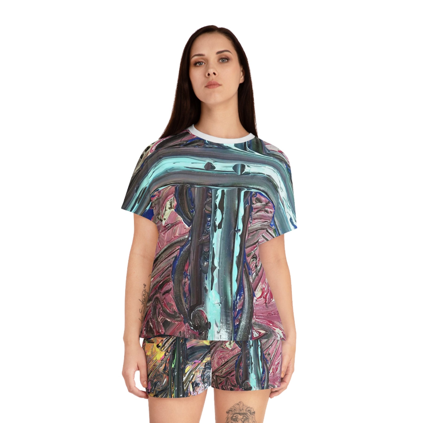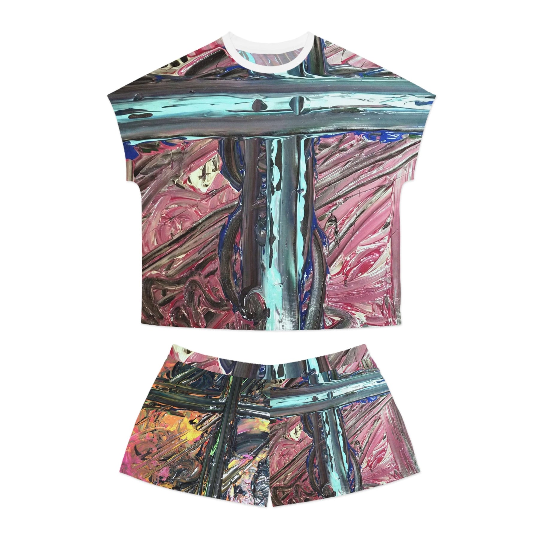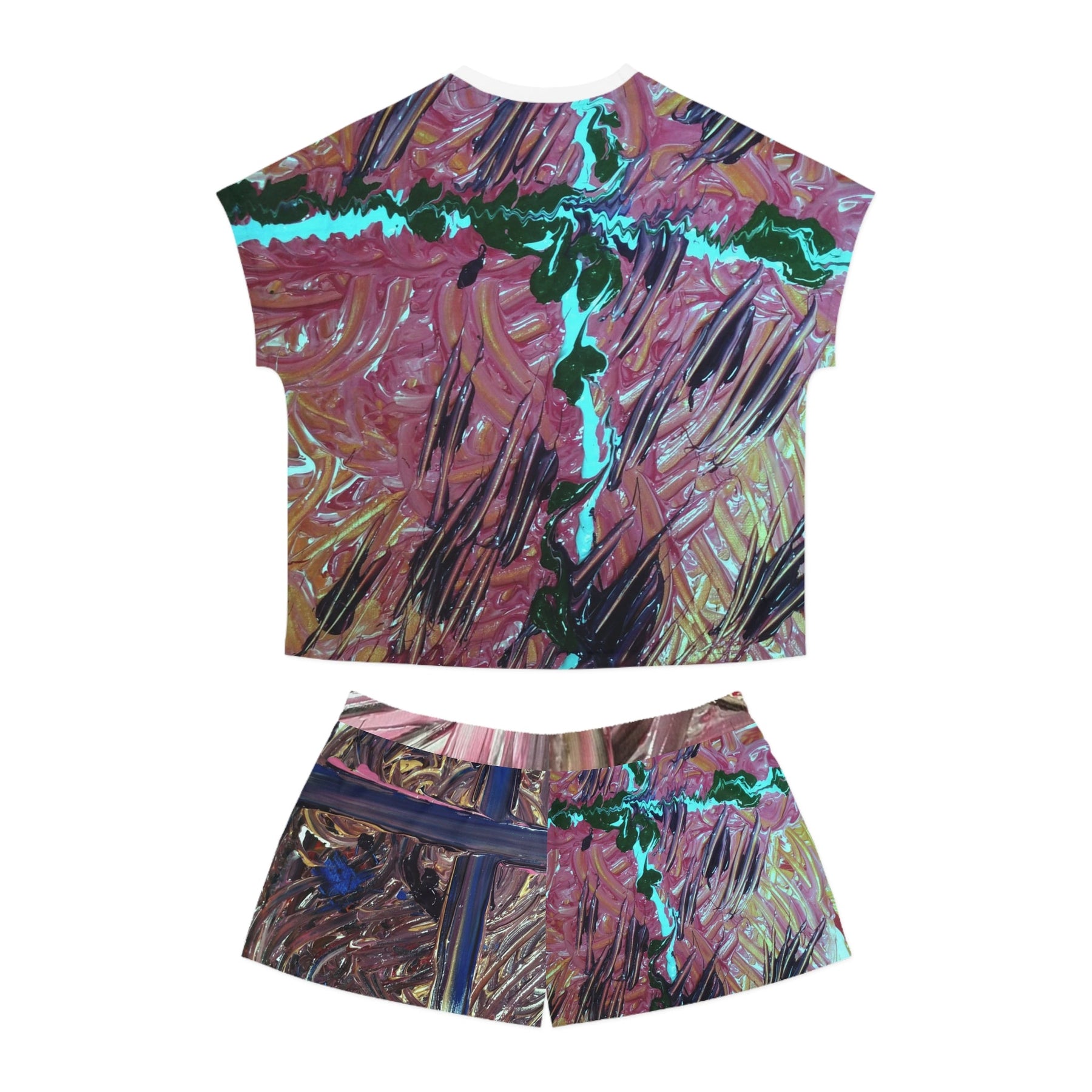 A short-sleeve pajama set that feels like slipping into an art studio at dusk. The loose, relaxed top and soft shorts carry a painterly abstract print—thick brushstrokes of teal, magenta, and metallic accents—that reads like a wearable canvas. Lightweight stretch fabric moves with you through slow mornings and late-night sketching sessions. The ribbed collar and matched seam thread give a neat finish, while the elastic waistband keeps the shorts gently in place without pinching. This set sits comfortably between lounge and statement sleepwear: breathable, bold, and quietly expressive.