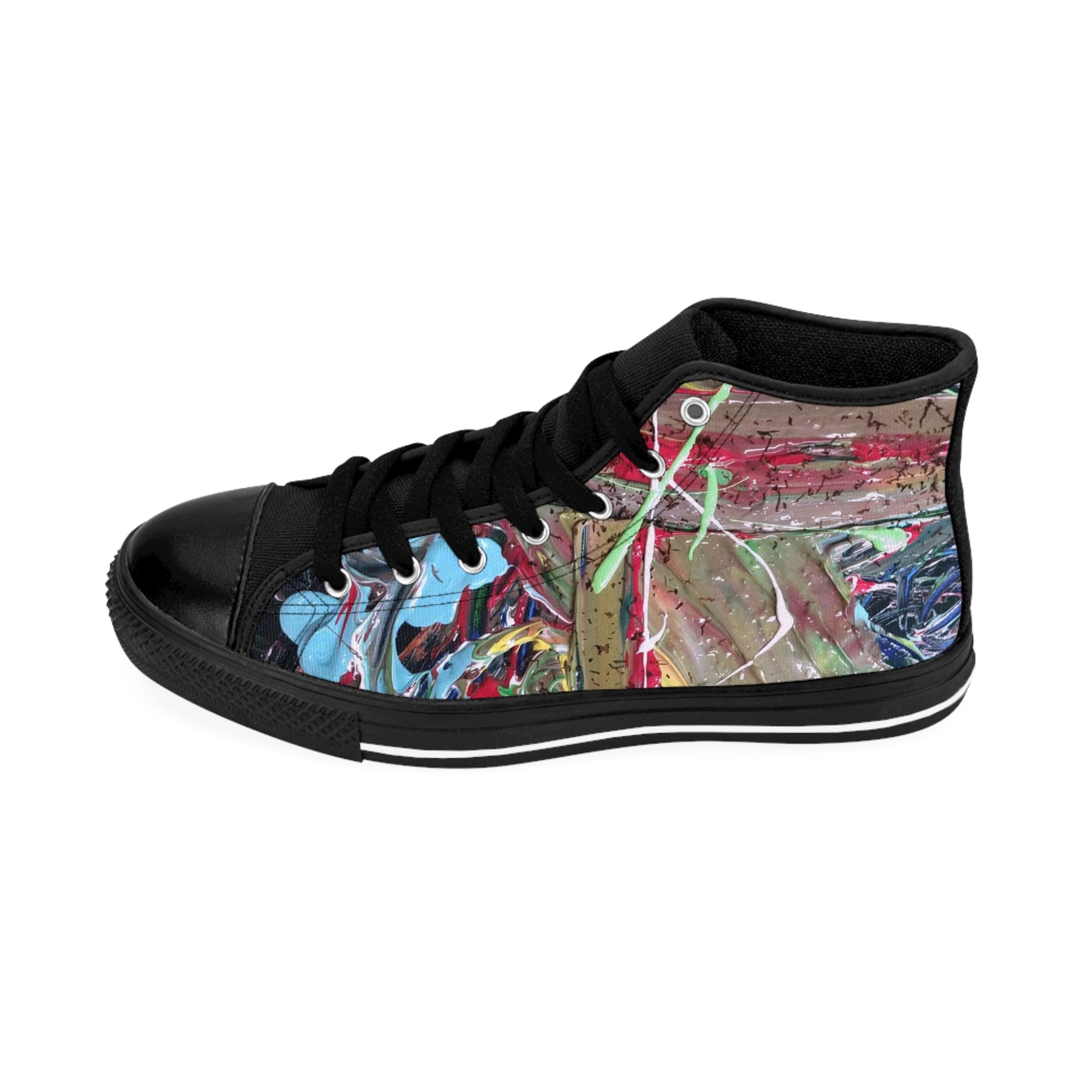 These high-top canvas sneakers carry a bold, streetwise energy — the kind that turns sidewalks into a personal gallery. Hand-painted graffiti colors sweep across a durable nylon canvas, contrasted by black pleather toes and matching black stitching for an edge that reads both raw and refined. Lightweight foam lining cushions every step, while a breathable foam insole wicks heat and moisture so you can stay on the move. Silver metal eyelets and a grippy rubber outsole mean these sneakers take the daily wear-and-tear without losing character. Wear them to late-night city walks, gallery hops, or whenever you want your footwear to speak before you do.