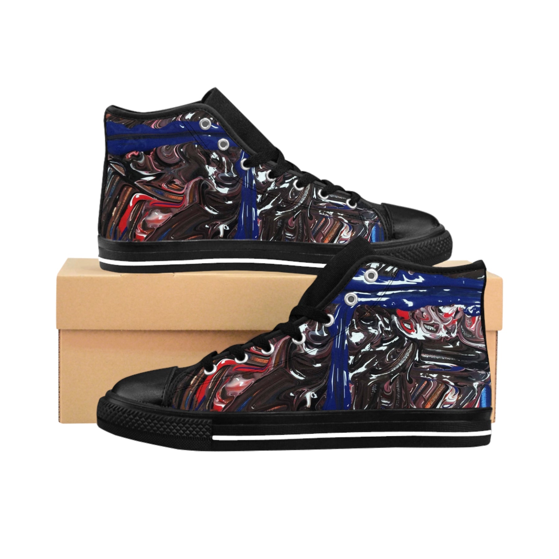 These high-top canvas sneakers bring bold, painterly energy to every step. The textured nylon canvas holds an abstract, swirled print of deep blues, reds, and glossy blacks that reads like an urban art piece stretched across a classic silhouette. A cushioned foam insole keeps feet cool and dry while the pleather-reinforced toe and durable rubber outsole stand up to daily wear. Metal eyelets and black stitching add a finished, slightly industrial edge. Wear them with cropped jeans or layered streetwear to let the shoe’s artwork do the talking during late-night walks, gallery runs, or weekend city explorations.