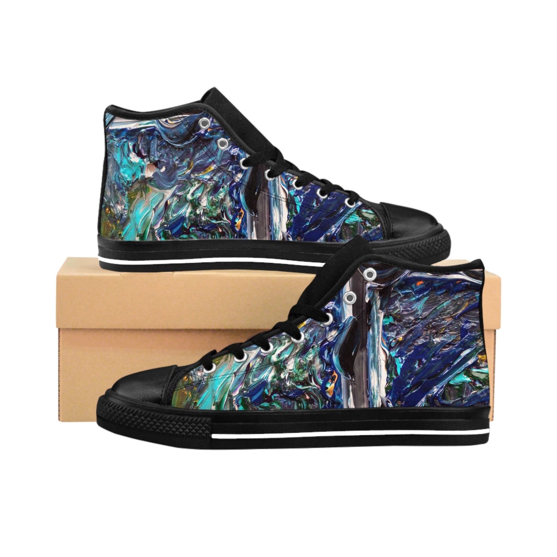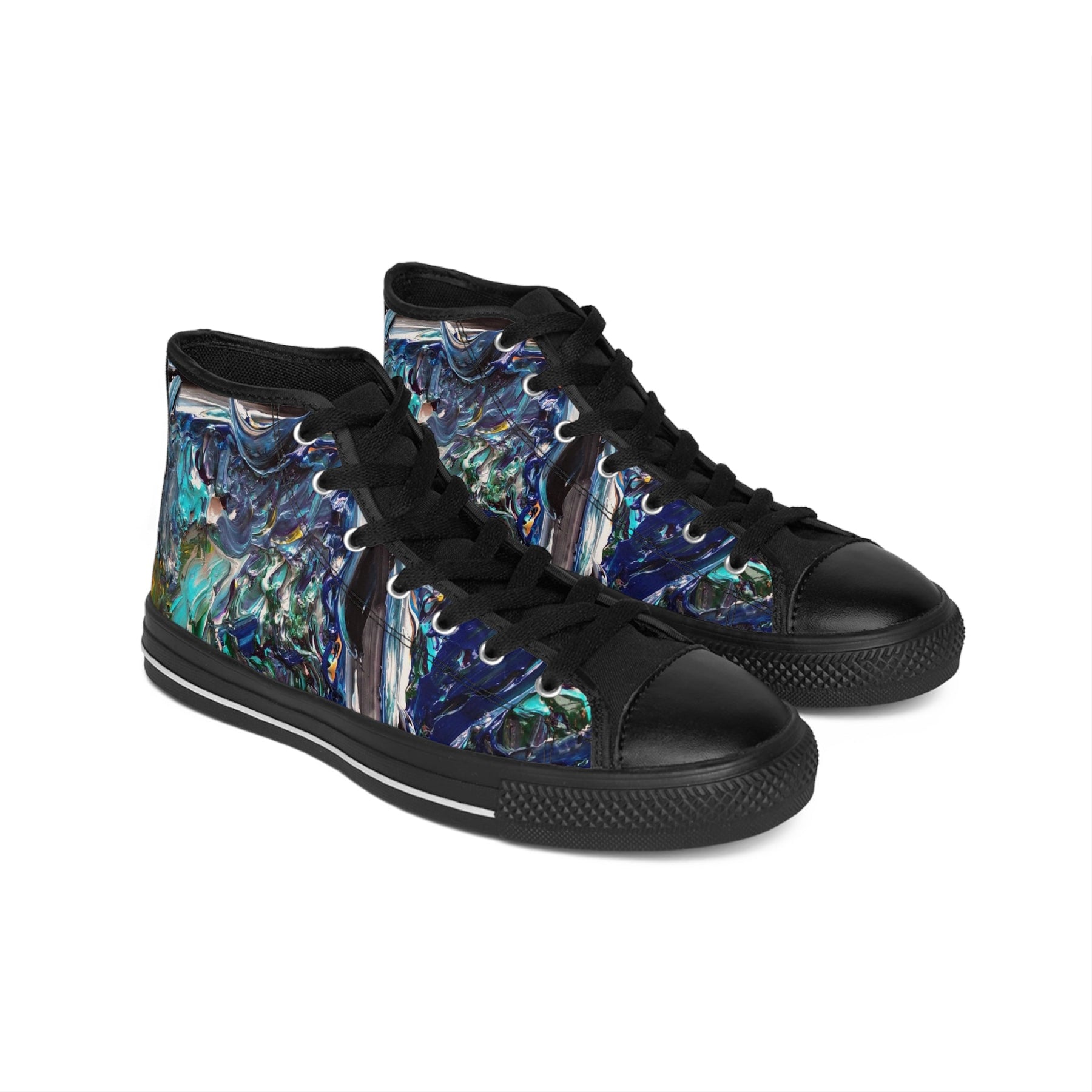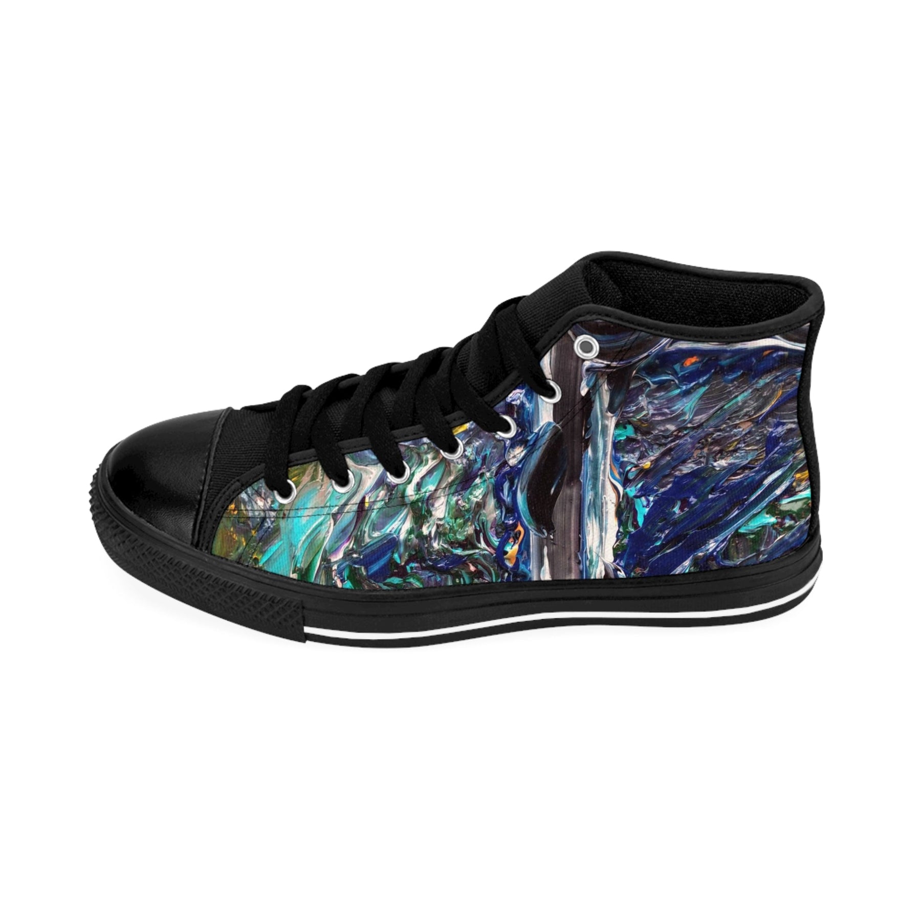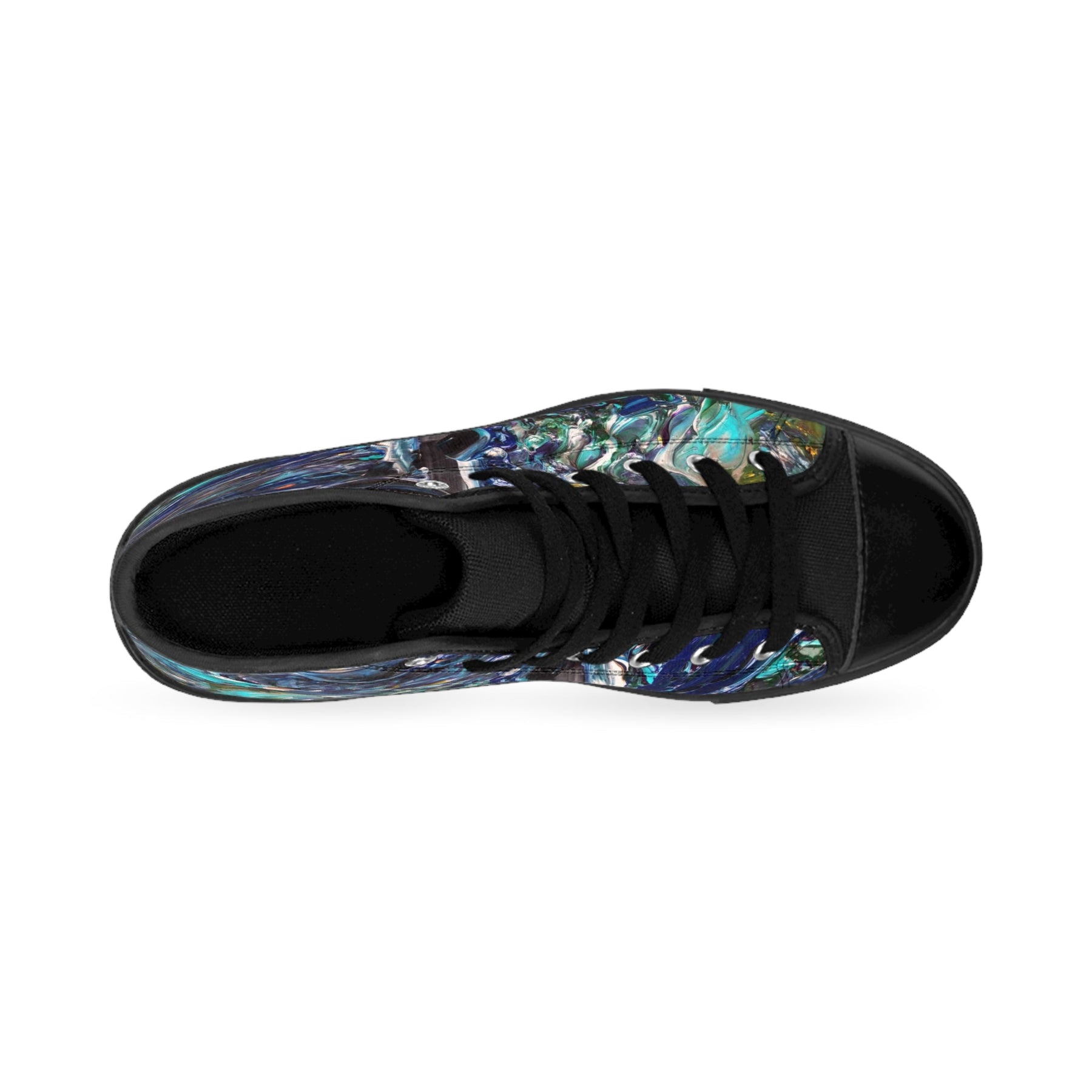 These high-top sneakers carry the energy of a midnight tide—deep navy swirls, sea-glass teals, and pearly highlights that move with you. The textured nylon canvas shows off the fluid, painterly design while black pleather on the round toe and sturdy rubber soles keep them grounded. They feel cushioned from the first step thanks to the breathable foam insole, and silver metal eyelets add a little edge to the look. Wear them on city walks, gallery nights, or when you want an artful layer to a simple outfit; they bring color that reads handcrafted and adventurous without shouting.