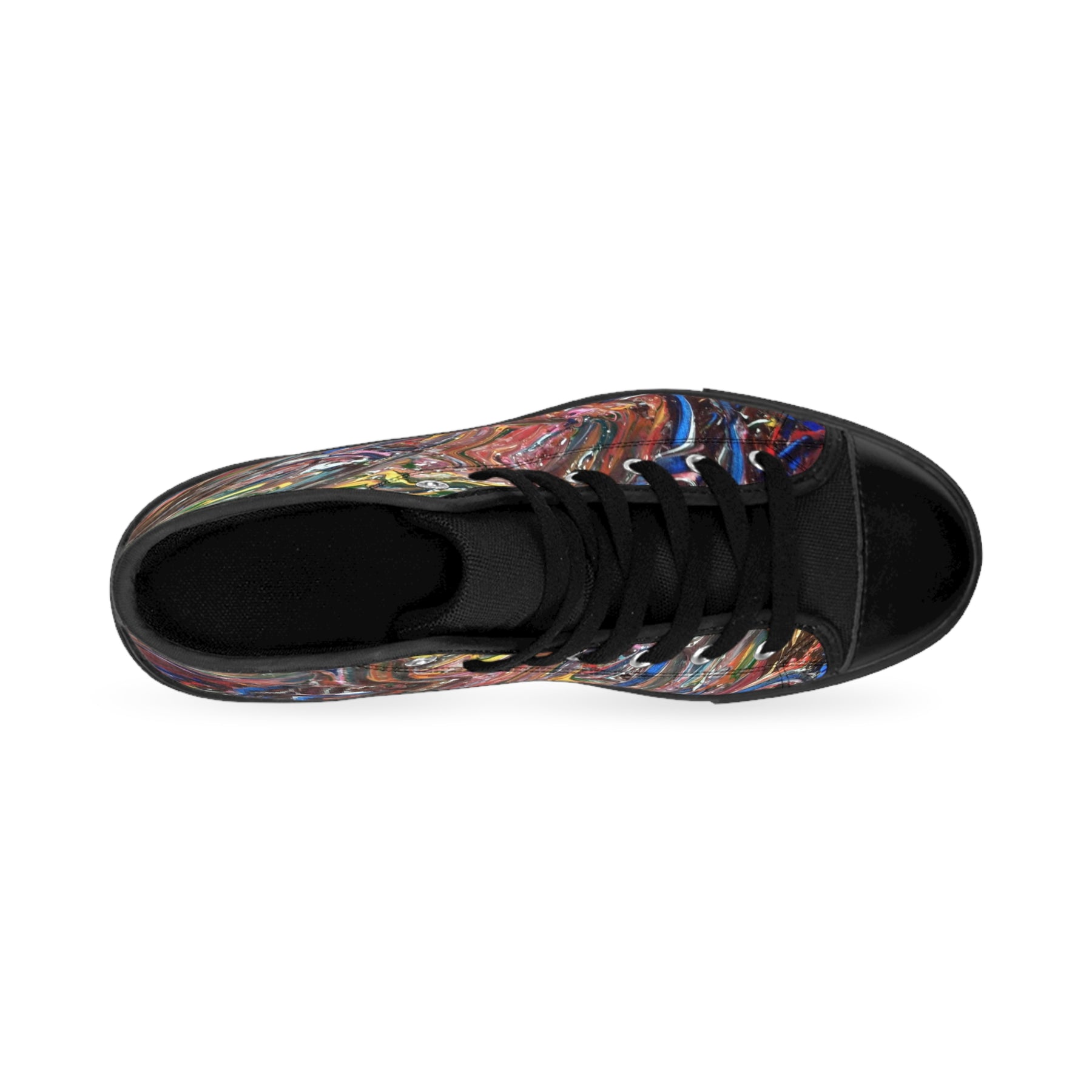 These high-top canvas sneakers bring painterly energy to everyday wear. The swirling, abstract print feels like a pocket gallery — streaks of rust, teal, ochre and cobalt layered with lively texture. Built on a soft foam insole and a durable rubber outsole, they cushion every step while the pleather toe and metal eyelets add structure and longevity. The black interior and stitching let the colors pop while keeping the look grounded. Wear them on city streets, at art openings, or when you want your outfit to read like a confident brushstroke.