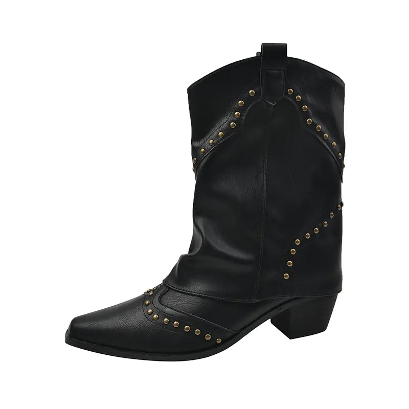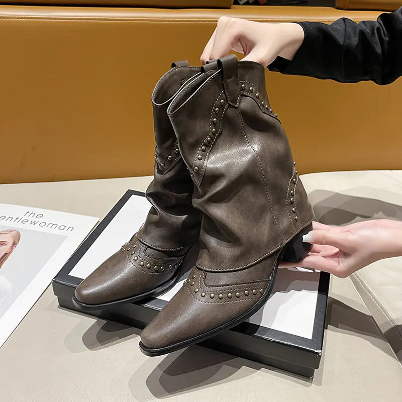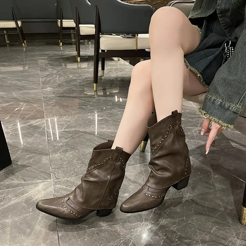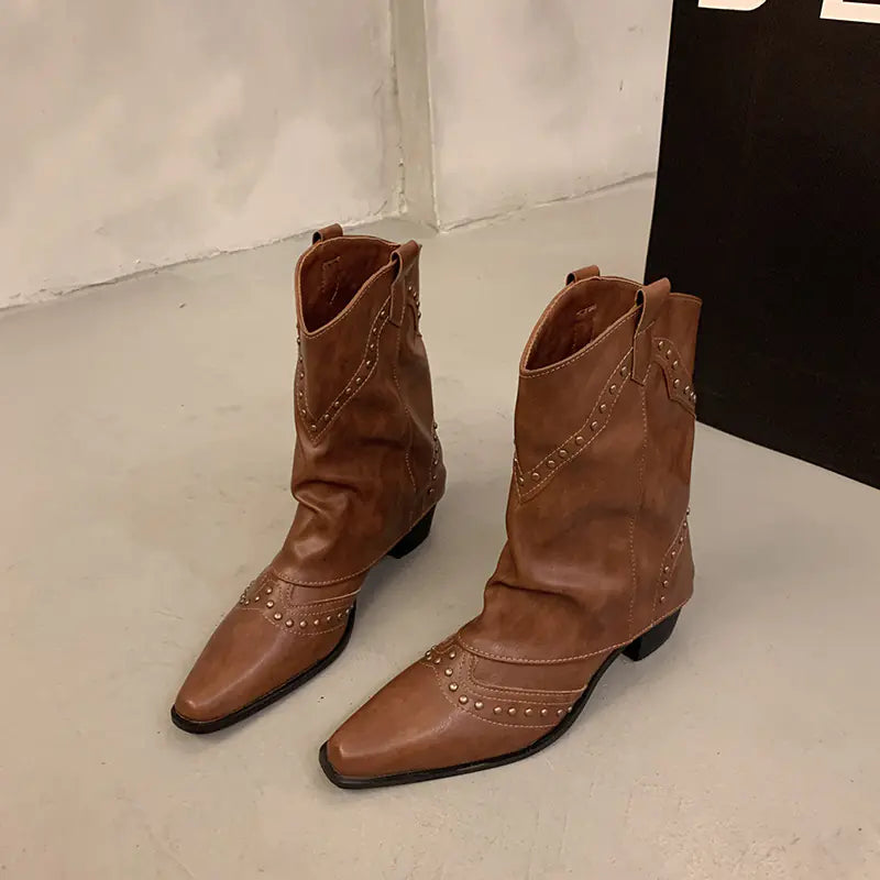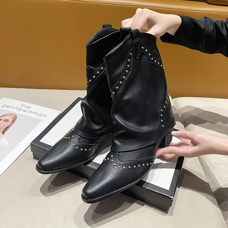 Fashionable Women's Mid-Heeled Rivet Cowboy Boots