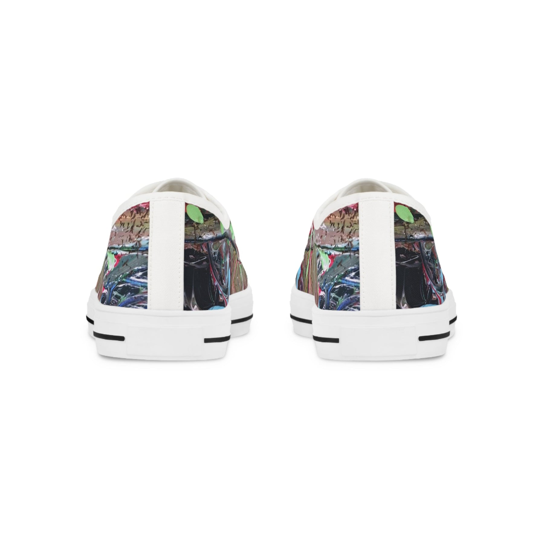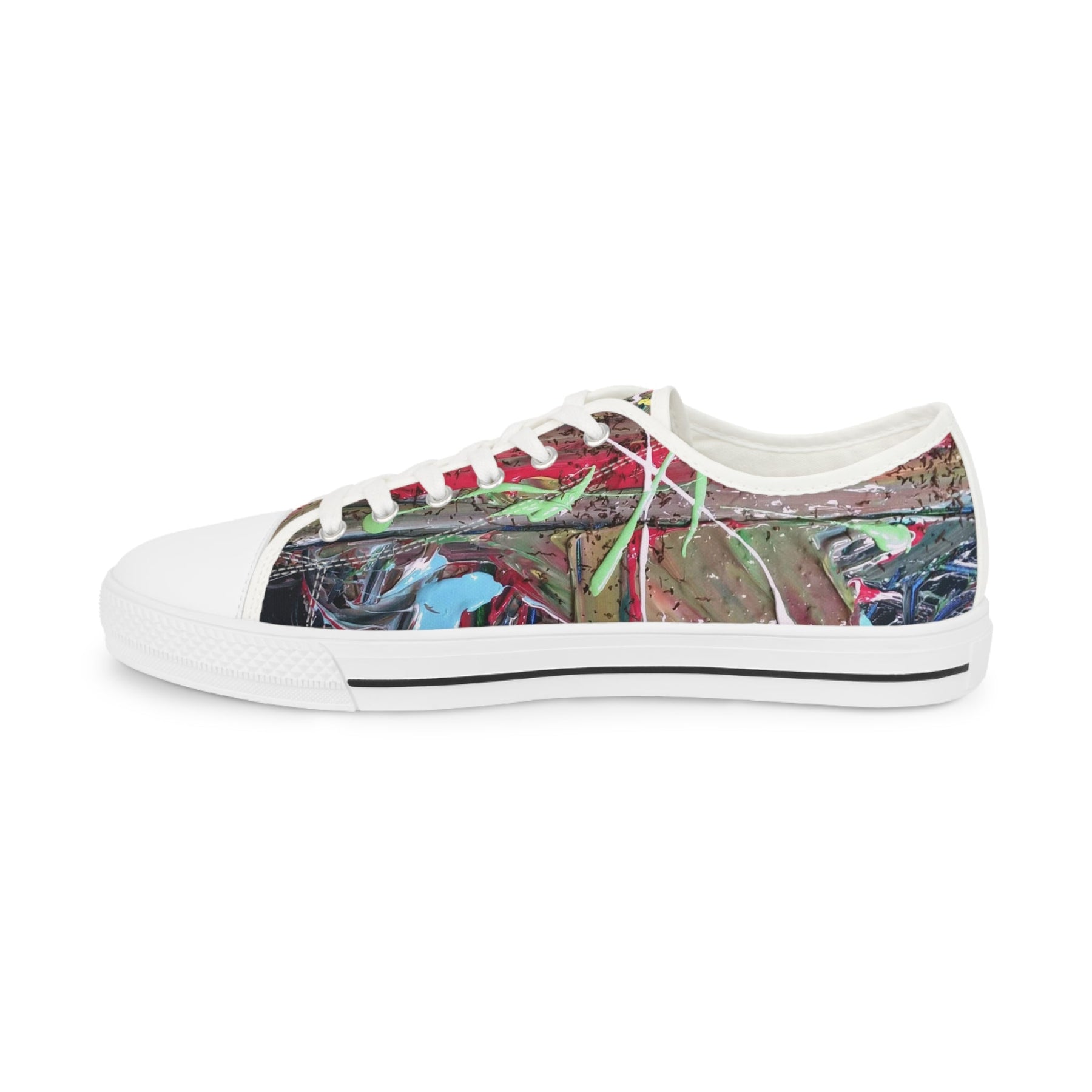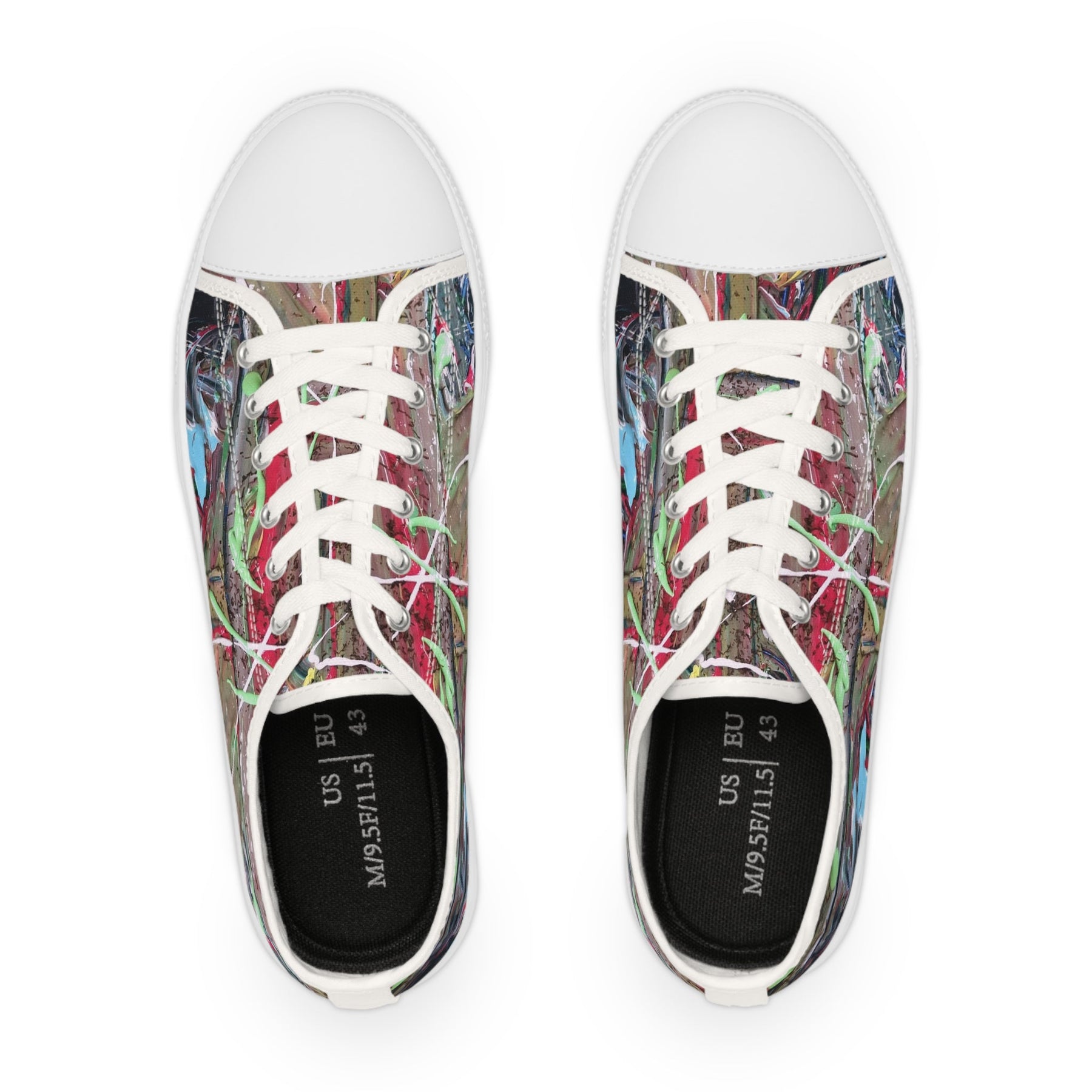 Low-top canvas sneakers with an art-forward all-over print that feels like walking through a street gallery. The textured polyester canvas carries vibrant, layered brushstrokes and color splashes while pleather-reinforced toes and metal eyelets add structure and an urban edge. Memory foam and EVA cushioning soften every step, and the durable rubber outsole keeps you steady on city sidewalks or gallery floors. These shoes run slightly large — choose a size down if you prefer a snug fit. Wear them with rolled jeans, paint-splattered denim, or your favorite casual jacket to let the art speak.