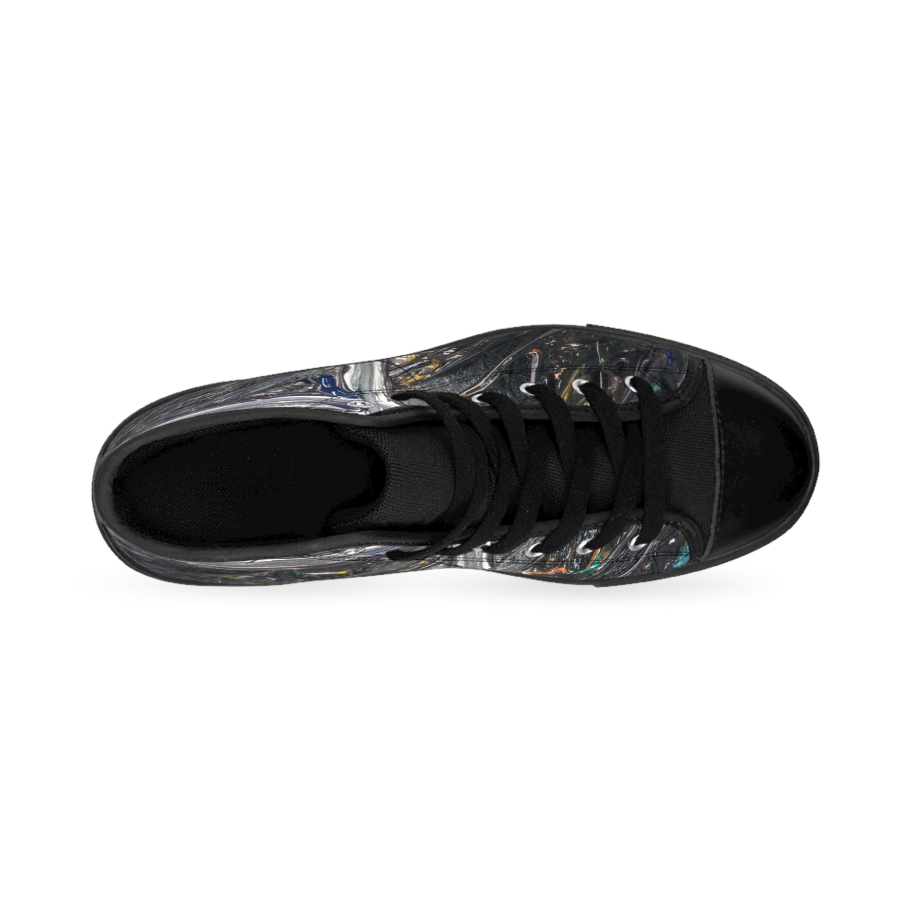 These high-top sneakers bring an urban, art-studio edge to everyday wear. The canvas panels wear an abstract, paint-splattered pattern—drips, metallic glints, and layered brush marks that read like late-night creative experiments. Black pleather at the rounded toe and matching black stitching give the design a grounded, intentional contrast, while silver metal eyelets and classic black laces add a subtle industrial flash. Inside, a soft foam insole cushions and breathes through busy days, and a durable rubber outsole keeps you moving from gallery openings to studio sessions without fuss. The 5" calf height and sturdy construction make them feel like a reliable companion whenever you want to carry a little creative mess with you.