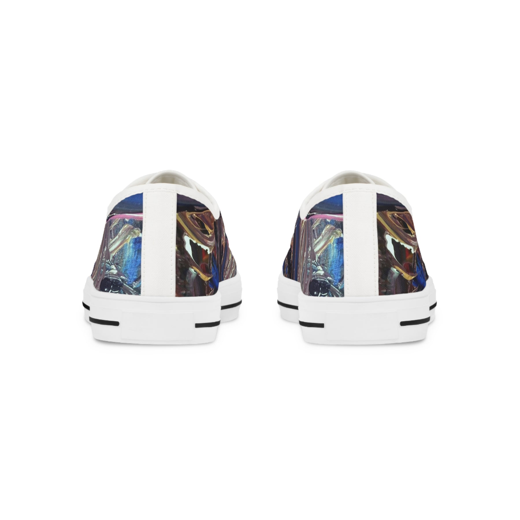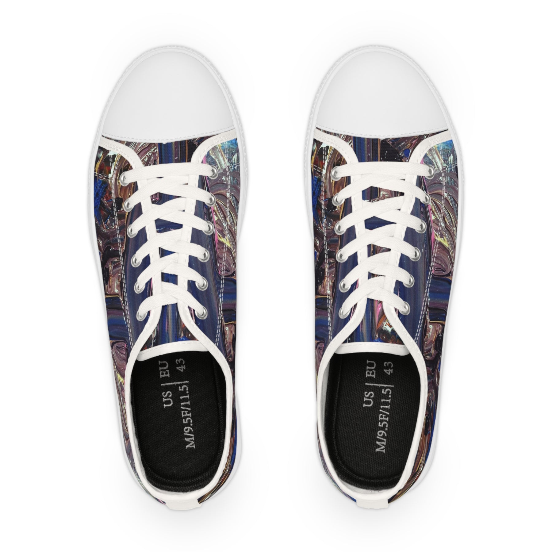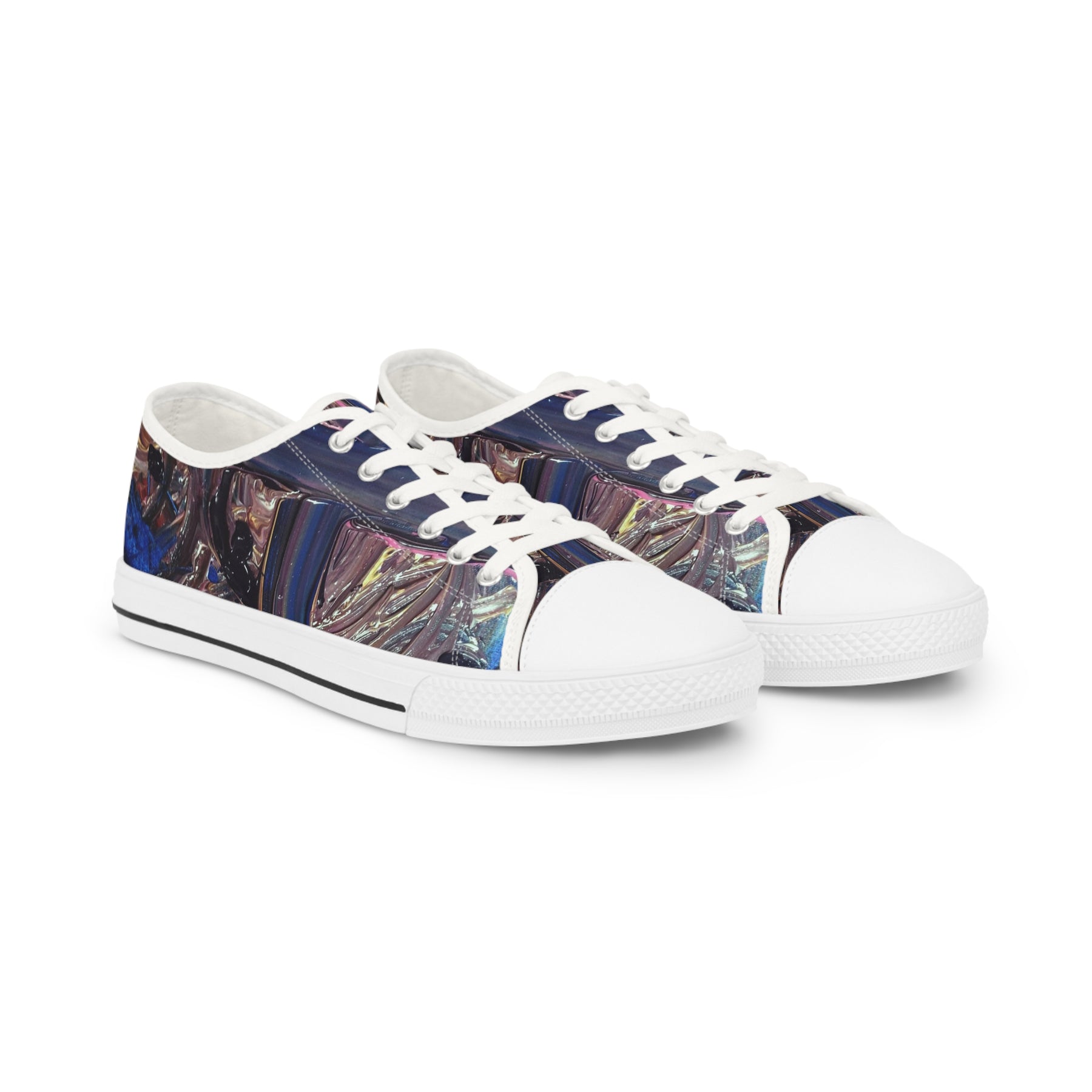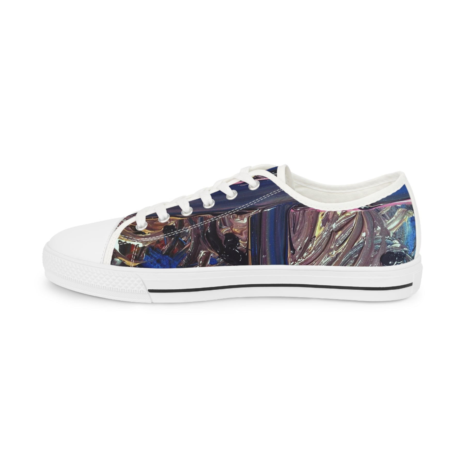 These low-top canvas sneakers bring artful detail to everyday walks. The full wraparound print blends layered, iridescent tones for a subtle, lived-in look that reads both creative and composed. Inside, memory foam and EVA cushioning soften each step while the pleather toe and durable rubber outsole stand up to daily wear. They pair with faded denim or a relaxed blazer, and sit comfortably in a rotation for gallery openings, city strolls, or late-night coffee runs. Note the fit runs slightly large—consider sizing down for a snug fit.