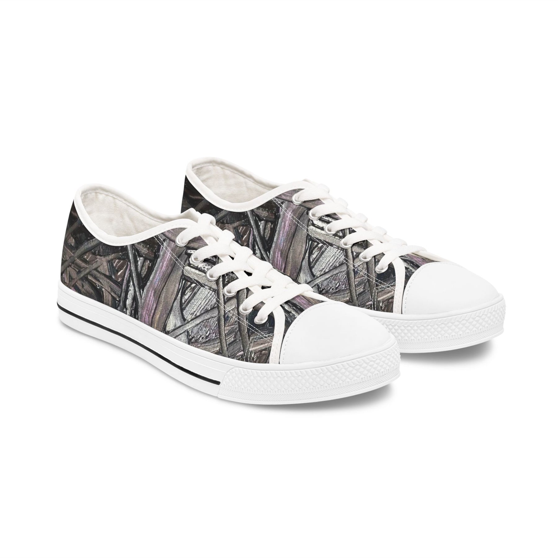 These low-top canvas sneakers carry an artful, layered print that feels like an urban sketchbook come to life. The soft polyester canvas and foamed lining give them a broken-in comfort from the first wear, while the black pleather toe and metal eyelets add structure and a touch of edge. Memory-foam insoles and EVA shock-absorbing midsoles keep feet cushioned for long days on the move. Subtle black-and-white trim and a full wraparound print make the design read smoothly from every angle—an effortless way to add a textured, slightly gritty aesthetic to streetwear looks or weekend wanderings.