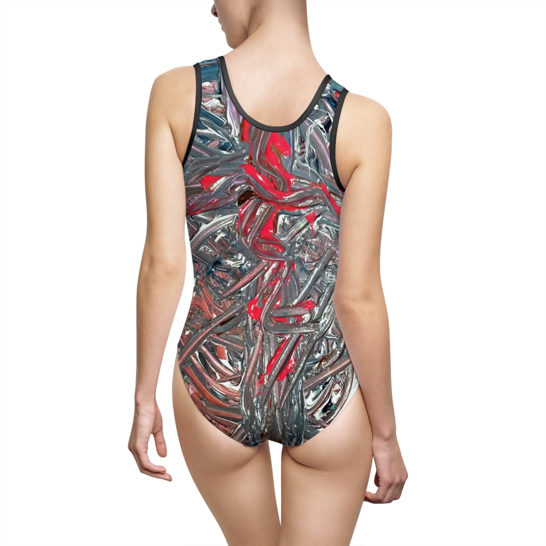 Dive into warm, sun-soaked rhythms with this sculptural one-piece swimsuit. The painterly abstract print layers streaks of deep charcoal and metallic gray with unexpected pops of crimson — a bold statement that moves with you. Lightweight, stretchy fabric hugs curves while inner elastic and strap-edge reinforcement keep support where it matters. Wear it for long beach days, surf sessions, or poolside art shows and feel confident in a piece that reads like wearable modern art.