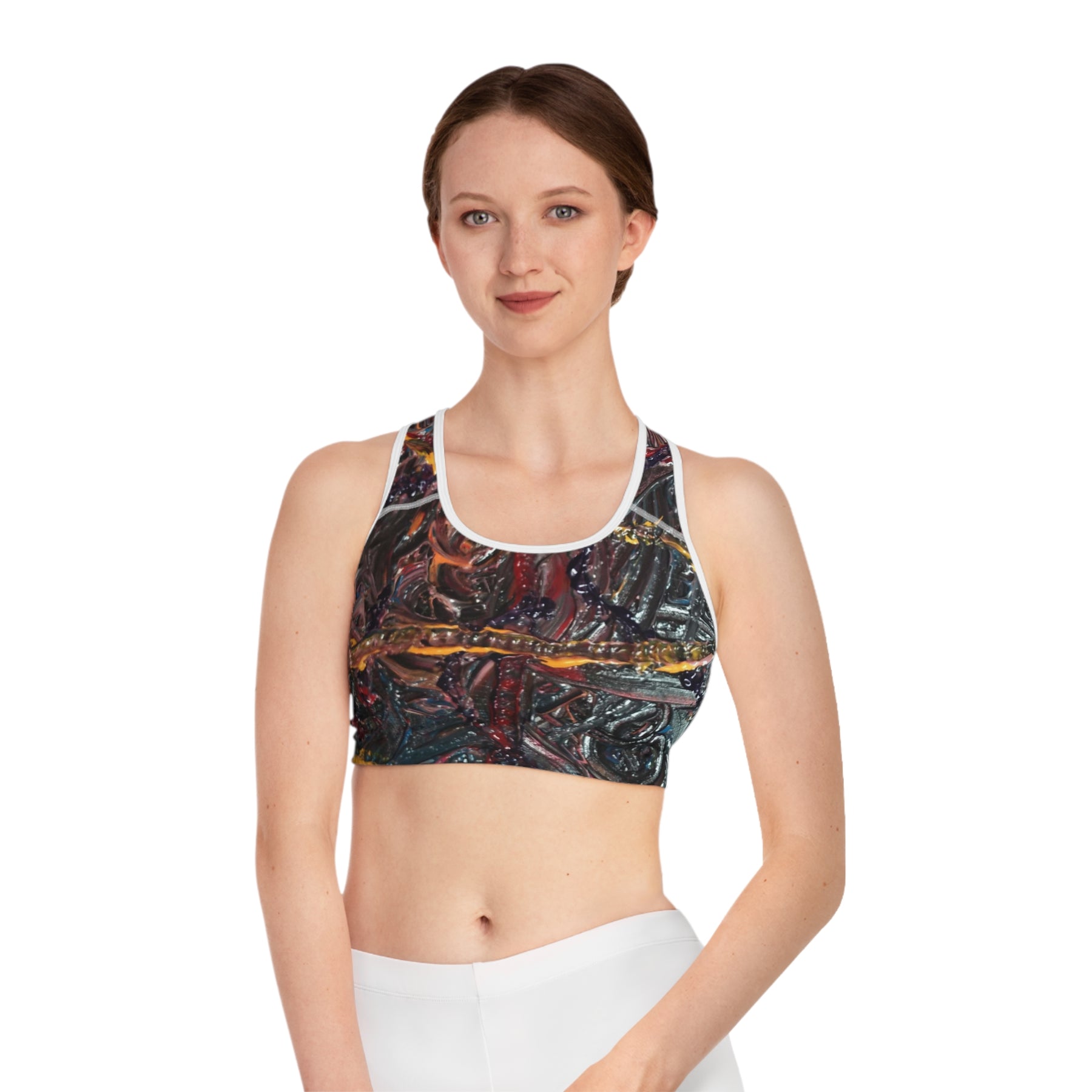 Elevate your activewear with this stylish sports bra, designed for both functionality and flair. Featuring an eye-catching all-over print, it adds a unique touch to your workout wardrobe. The moisture-wicking material keeps you cool and dry, making it perfect for intense workouts, yoga sessions, or casual lounging. With its compression fit and supportive double-layer construction, this sports bra is ideal for fitness enthusiasts who prioritize comfort and performance. Whether you're hitting the gym or running errands, it provides the support you need without compromising style. This sports bra makes an excellent gift for active women during holidays like Christmas, birthdays, or for special occasions such as International Women’s Day, celebrating strength and empowerment.