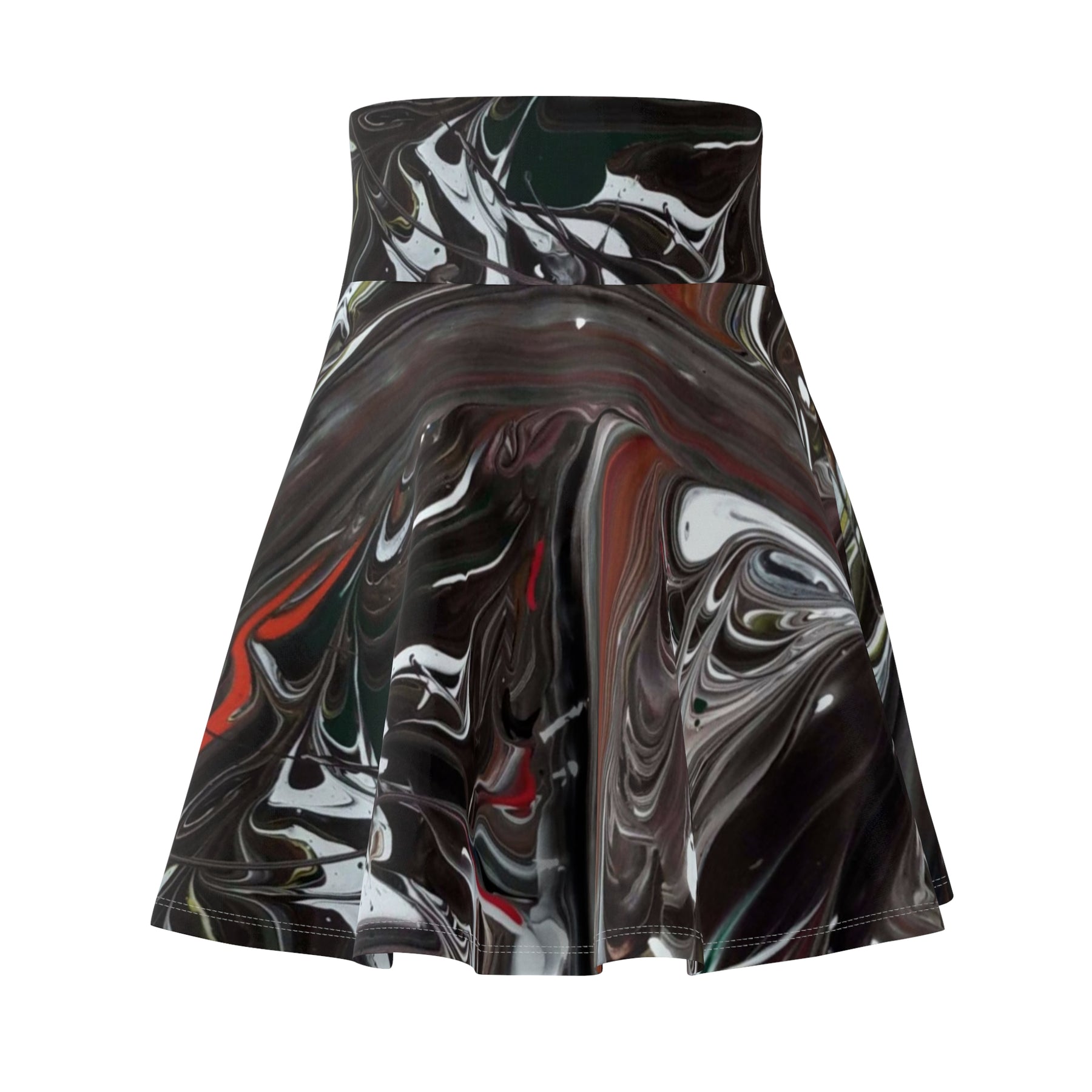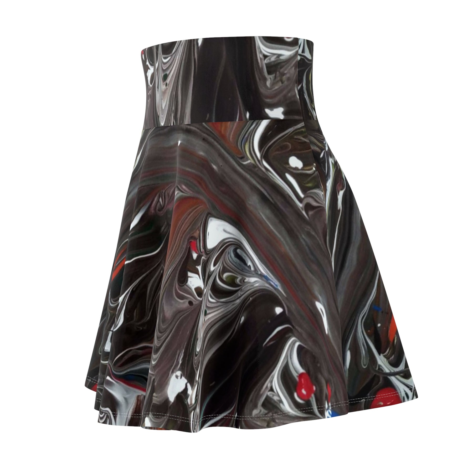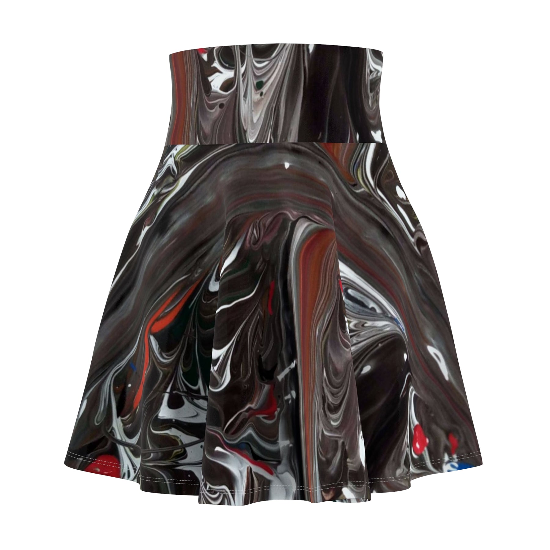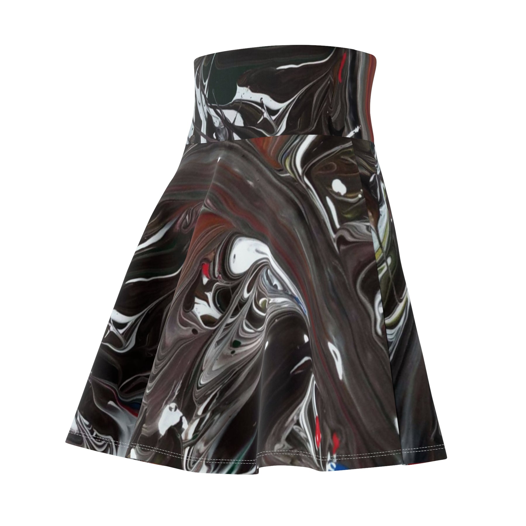 This flowing skater skirt brings dark, liquid marble swirls into your wardrobe — a wearable art piece that moves with you. The high-rise double waistband sits comfortably at the waist while the full, flared silhouette catches light and motion, turning the skirt into a shimmering statement as you walk, skate, or dance. Soft, stretchy performance fabric hugs the waist and releases into a smooth drape, so the print keeps its depth and contrast without stiffness. Wear it with chunky boots and a cropped sweater for a moody street look, or pair with a tucked-in tee and a denim jacket for late-night city wandering. The result is a familiar, comfortable fit with an edge: practical, expressive, and quietly dramatic.